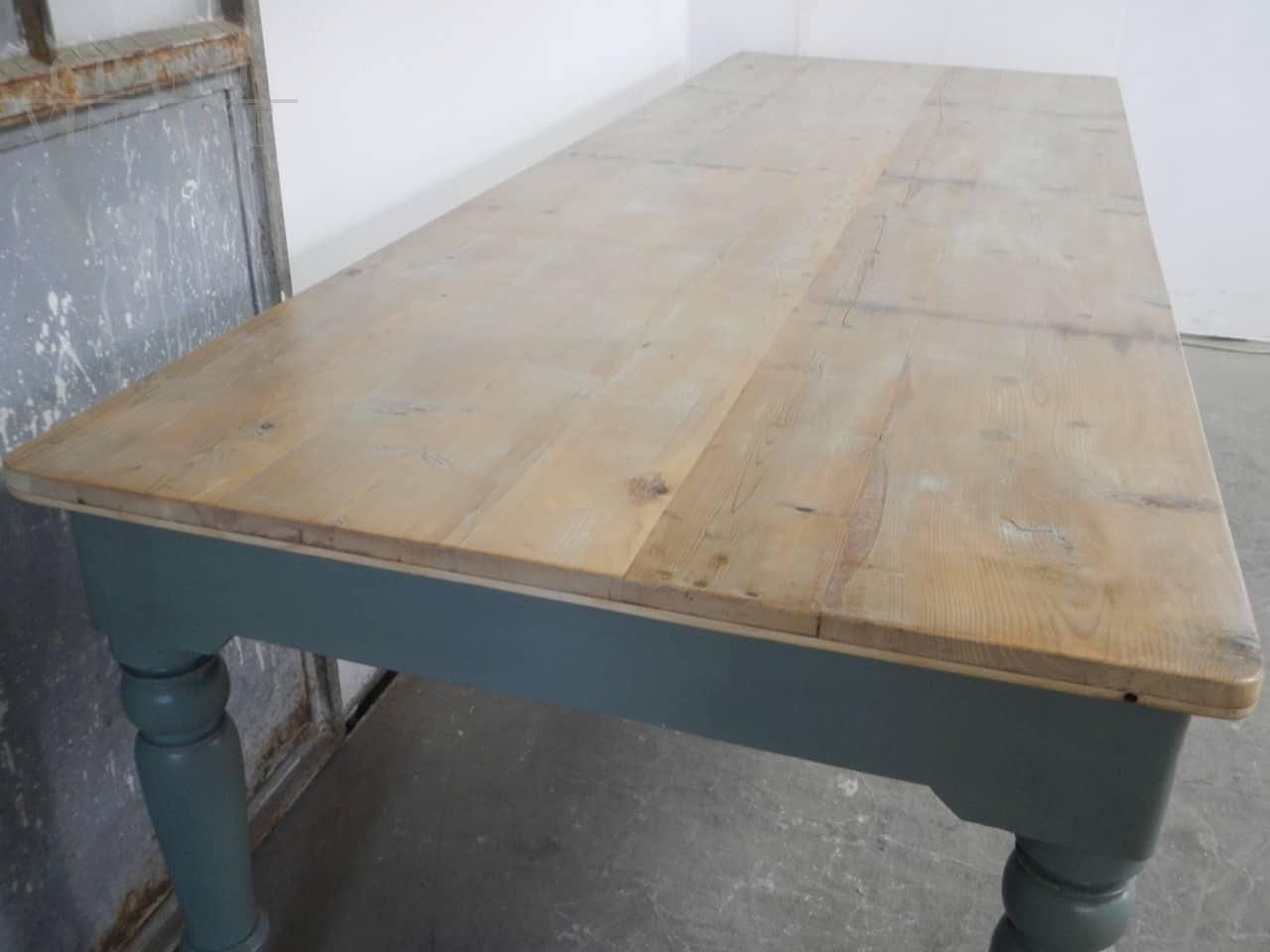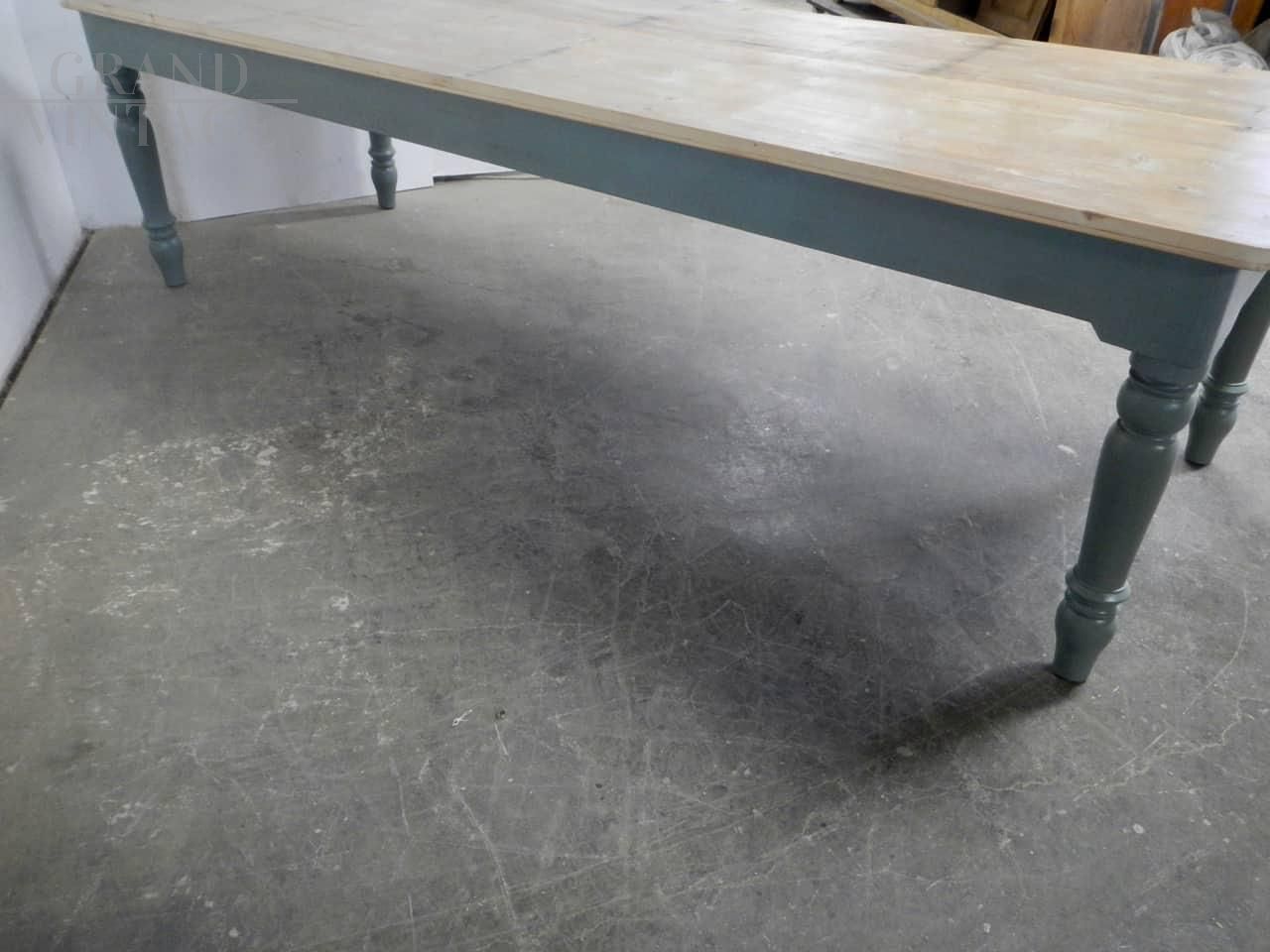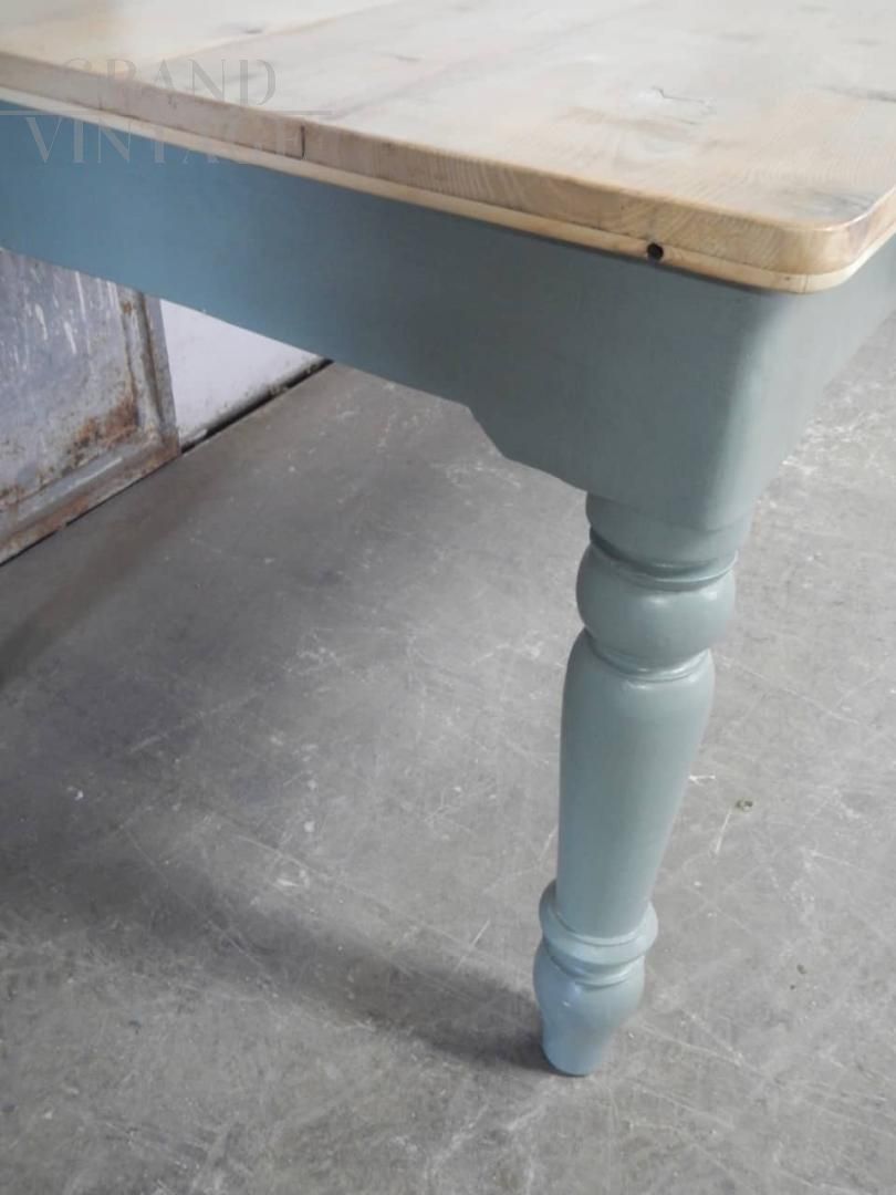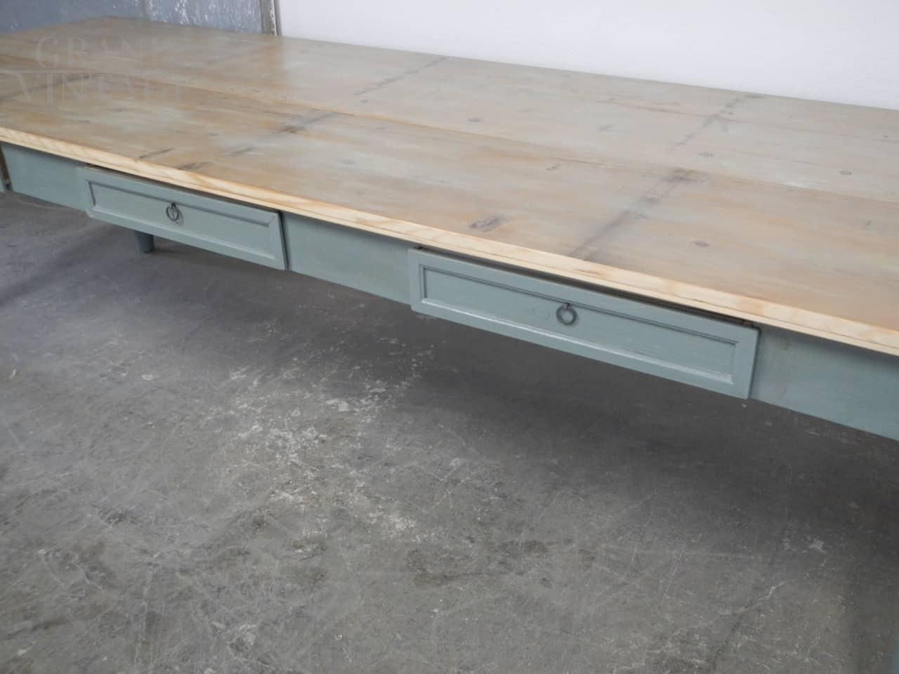 Grande tavolo vintage in abete in pittura verde - grigia con belle gambe tornite, dotato di 3 cassetti ricostruiti a nuovo e di un piano in abete naturale in patina.