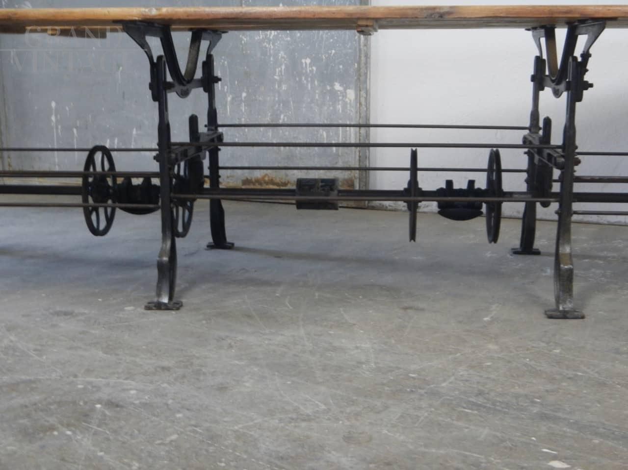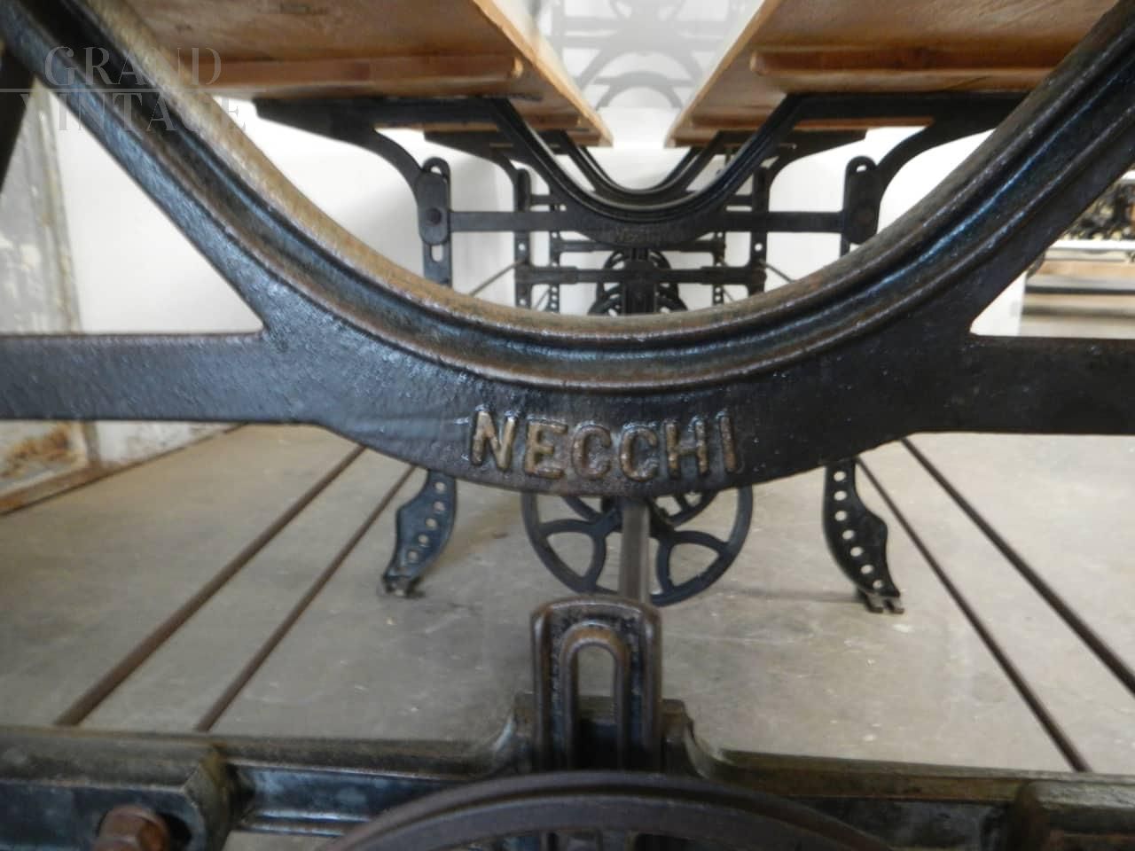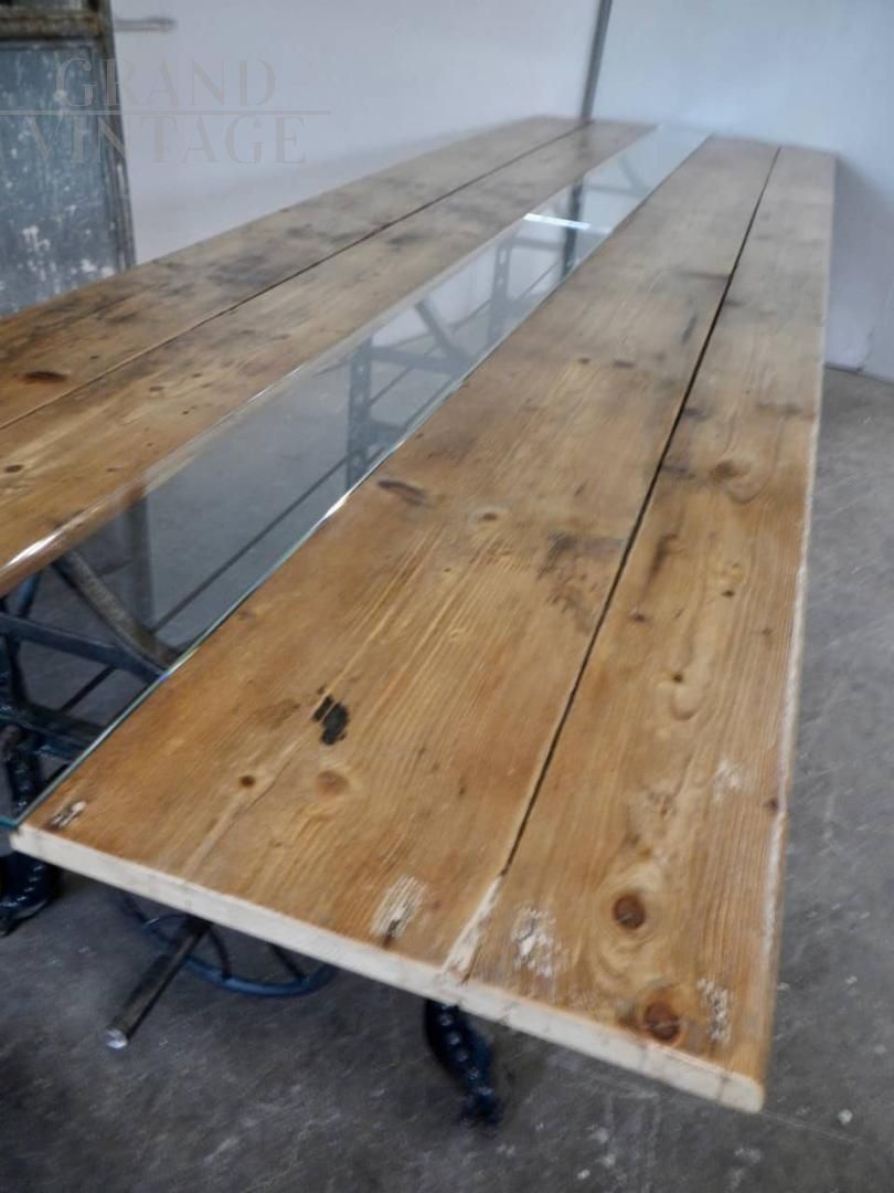 Grande tavolo in stile industriale con base caratterizzata da più strutture di macchine da cucire Necchi vintage assemblate tra loro, realizzate in ghisa e metallo e provenienti dagli anni '20. Il piano è in legno di abete naturale con una sezione centrale in vetro temperato con spessore di 10 mm. Il tavolo è smontabile per il trasporto. In ottime condizioni, restaurato.