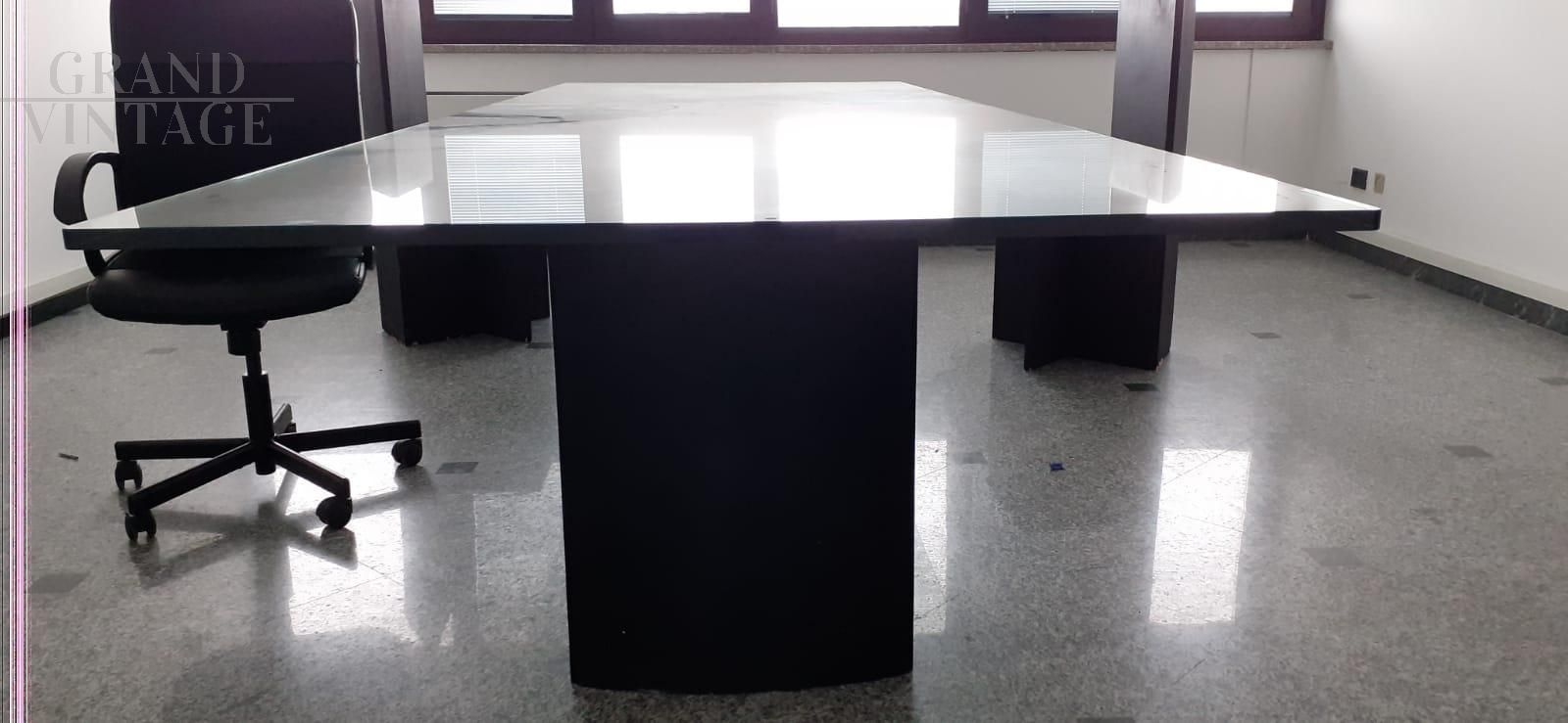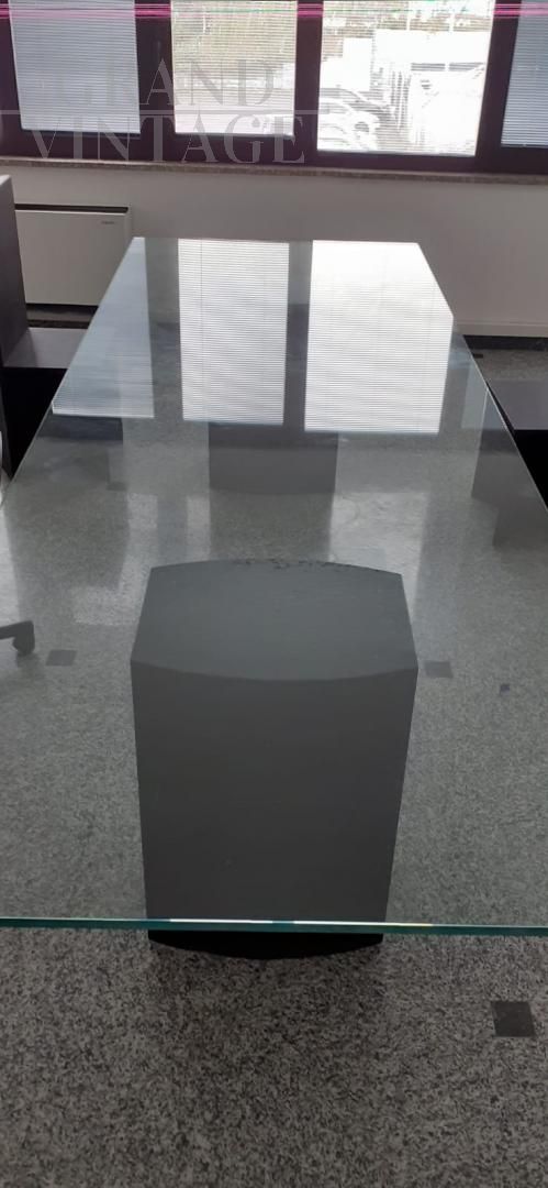 Grande tavolo vintage con piano in cristallo con spessore 2 cm e con piedi in legno, utilizzato per sala riunioni ma perfetto anche come tavolo per soggiorno.
