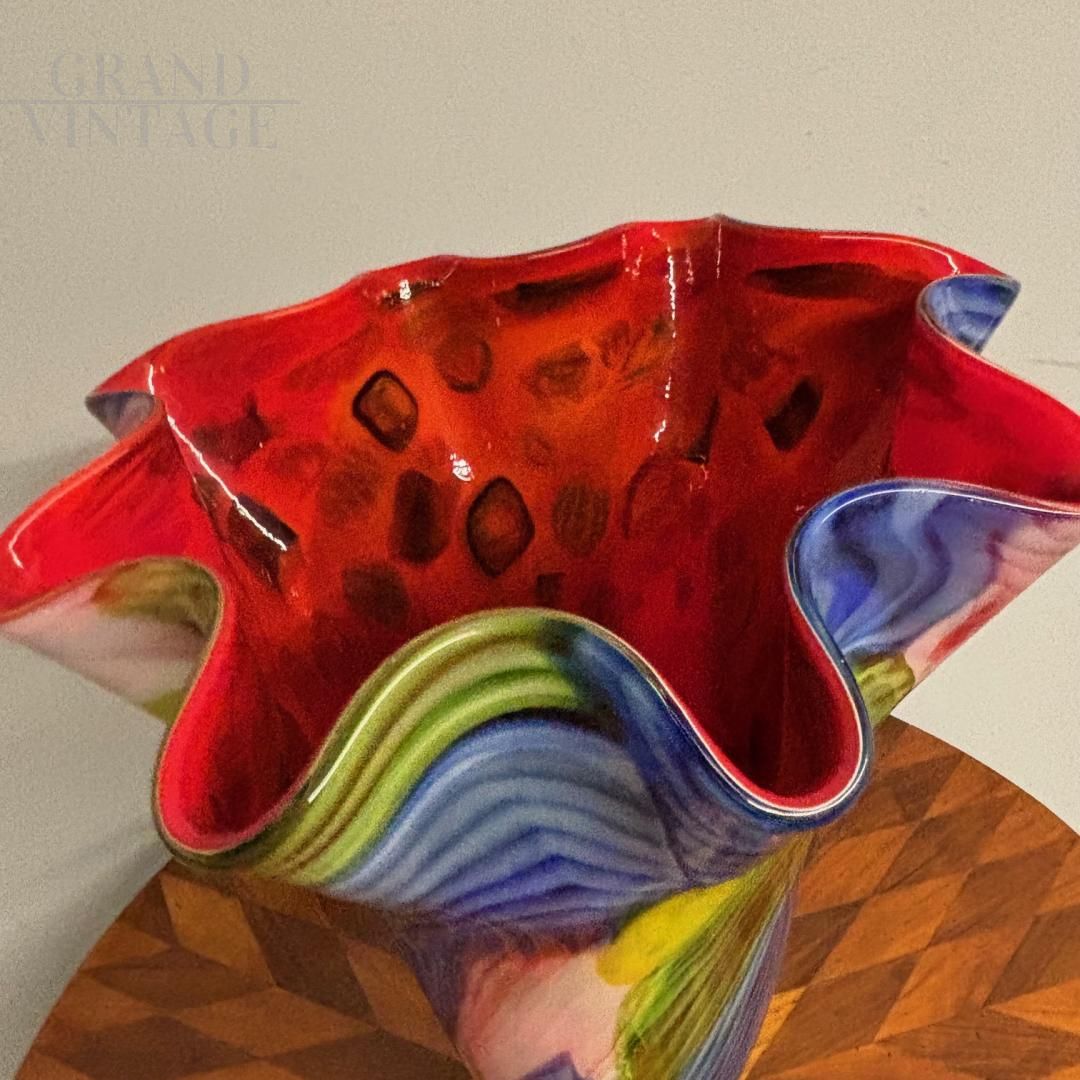 Grande vaso vintage in vetro di Murano multicolore dal design moderno, con forma a fiore e blocchi di colore, l'interno è in colore rosso con motivo millefoglie. Italia anni '80, in perfetto stato, altezza 48 cm, diametro 34 cm.