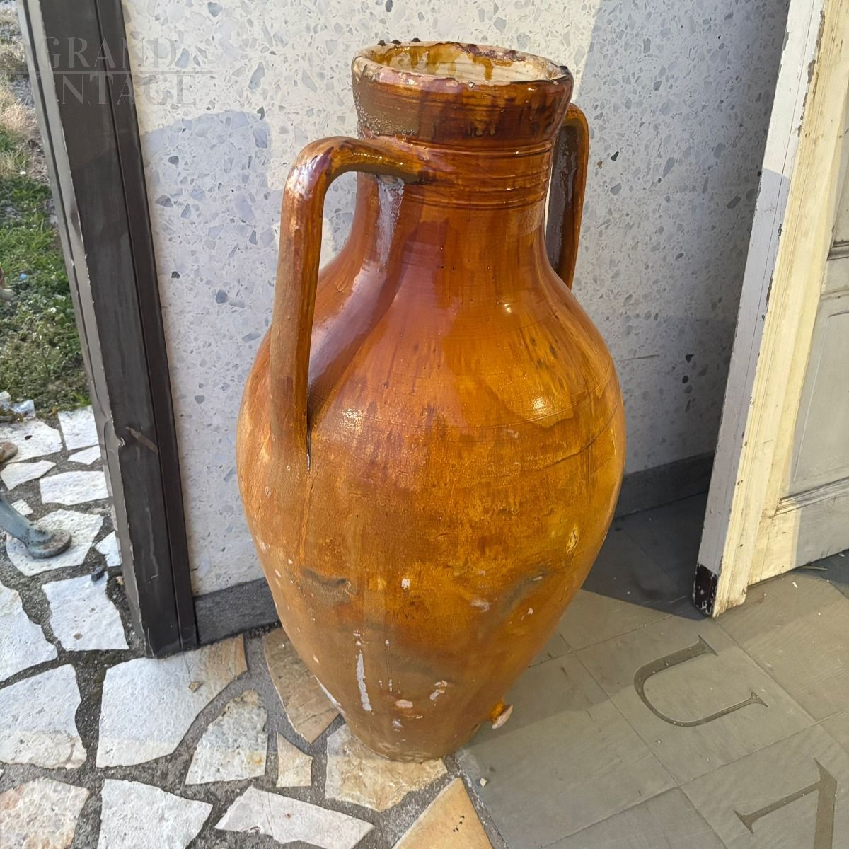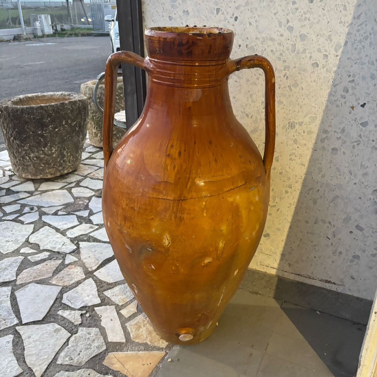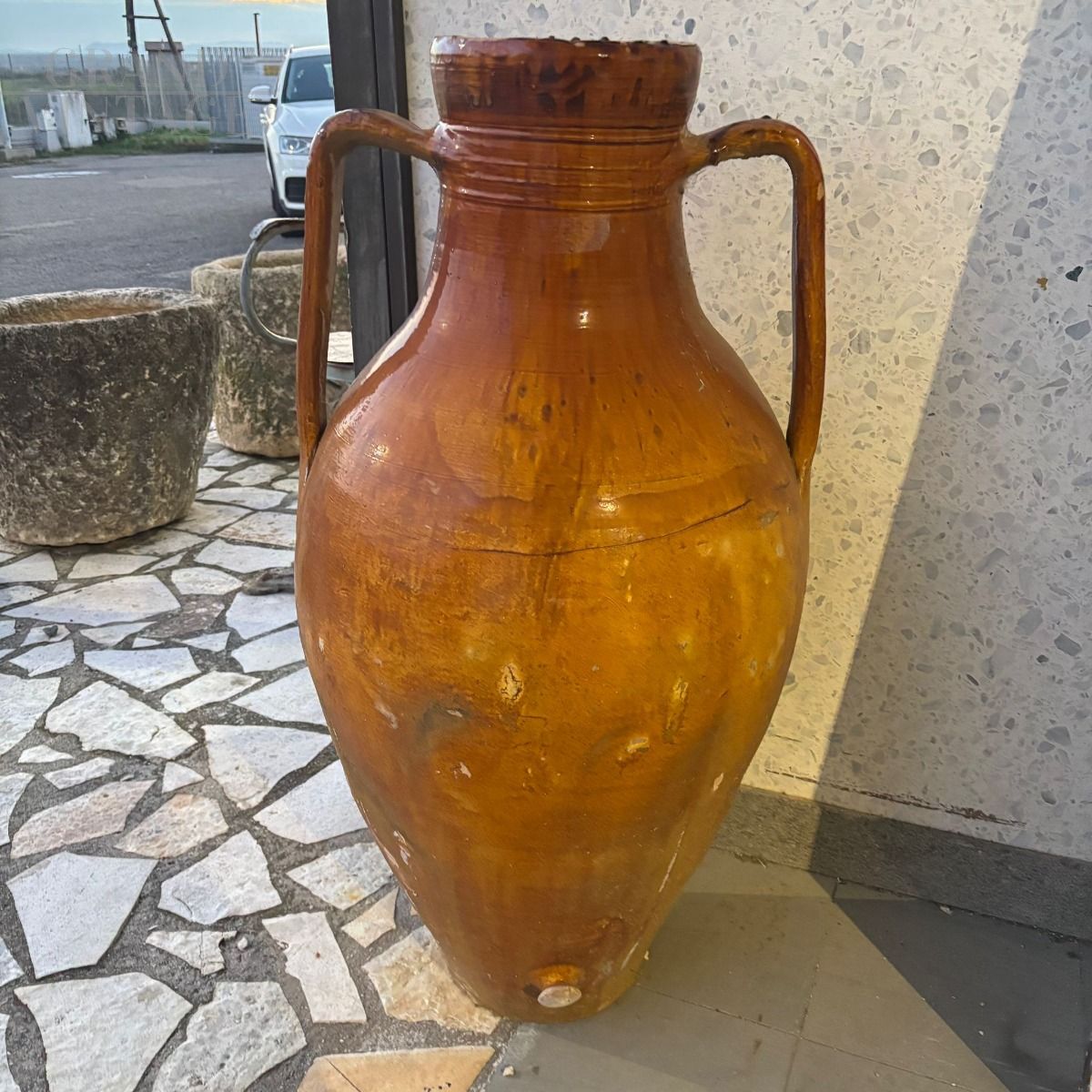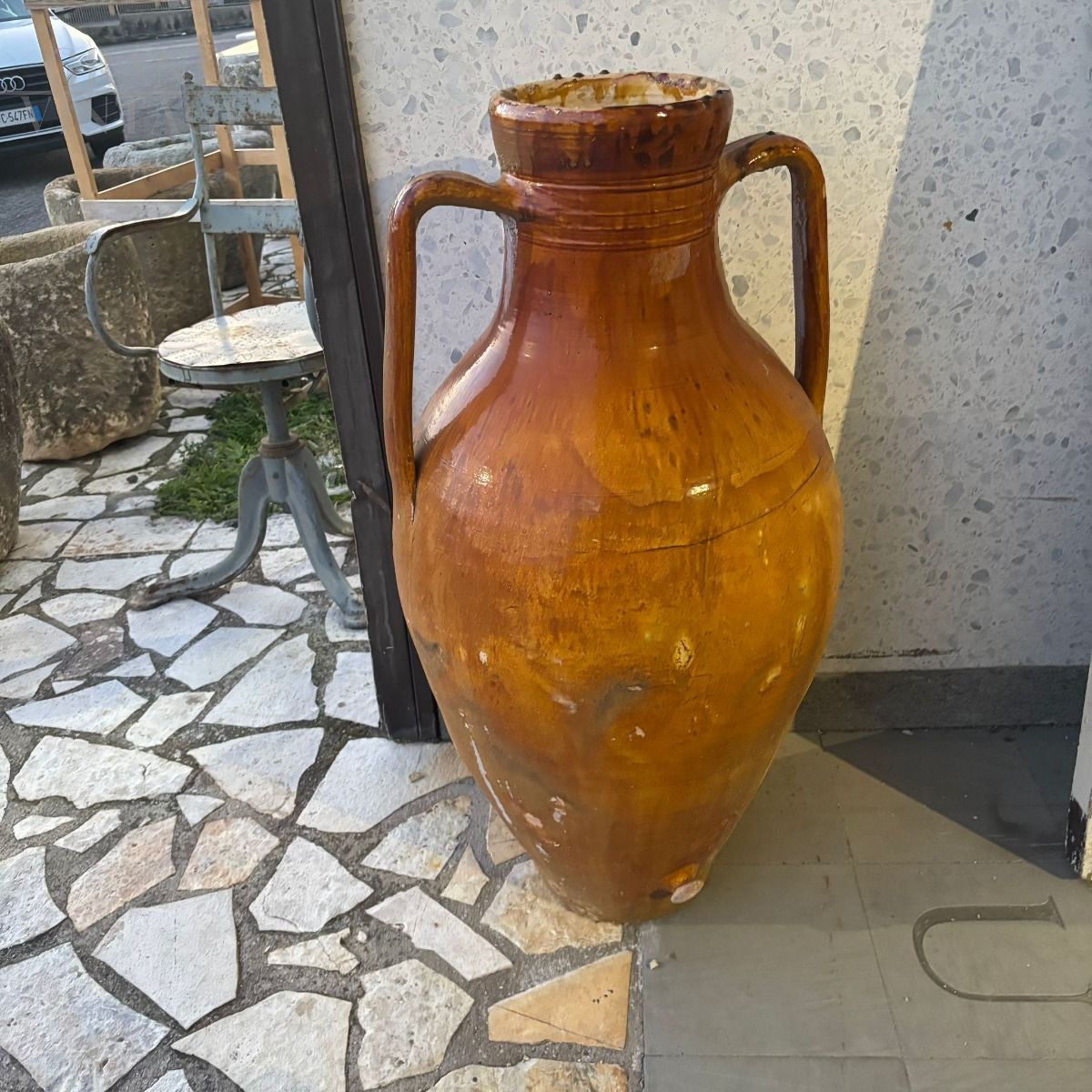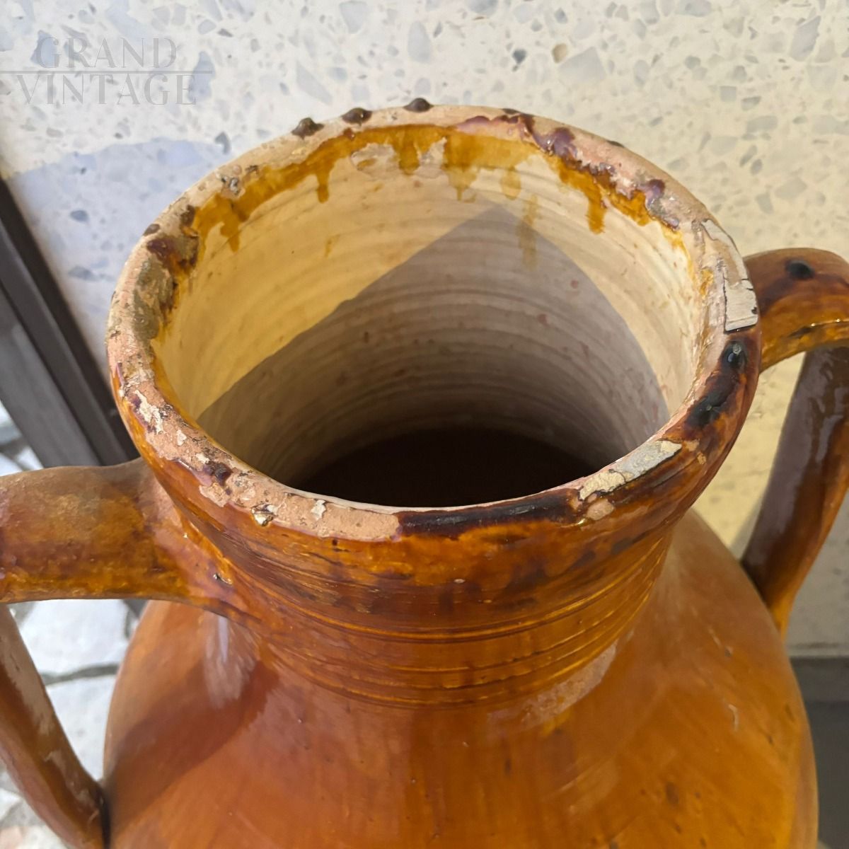 Grande vaso capasone antico ad anfora realizzato in terracotta nella Puglia del XIX secolo, utilizzato all'epoca come orcio per contenere olio. In condizioni molto buone.