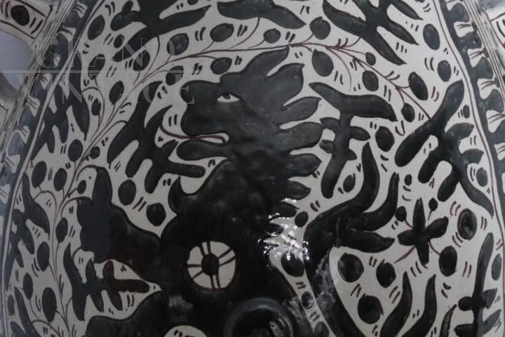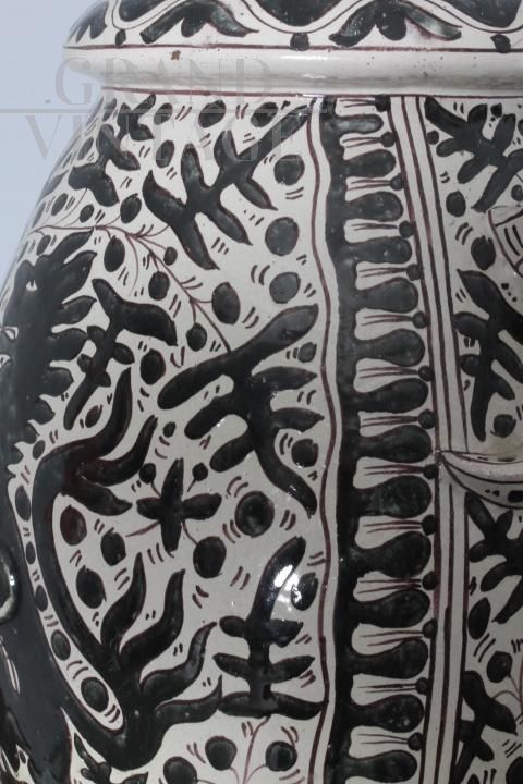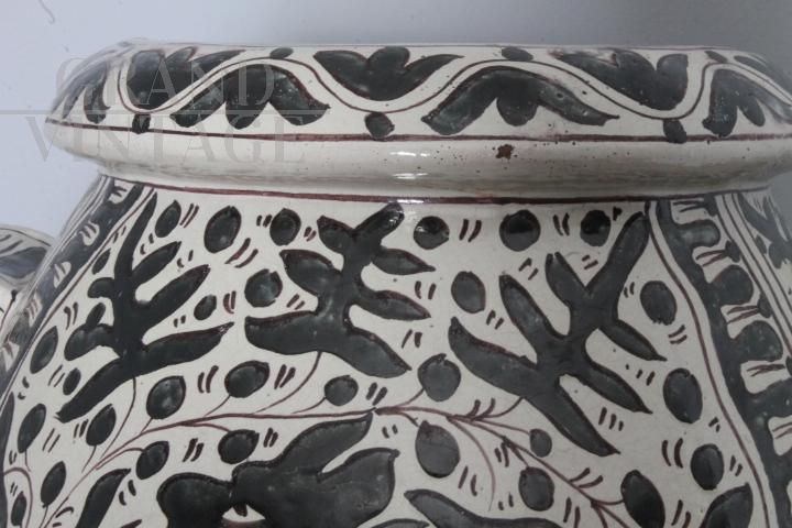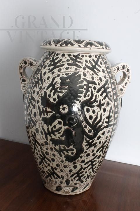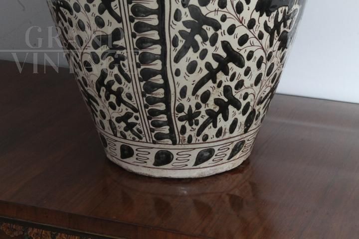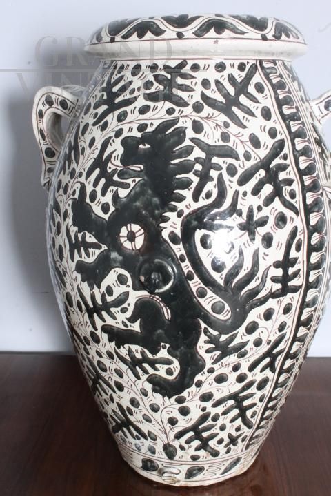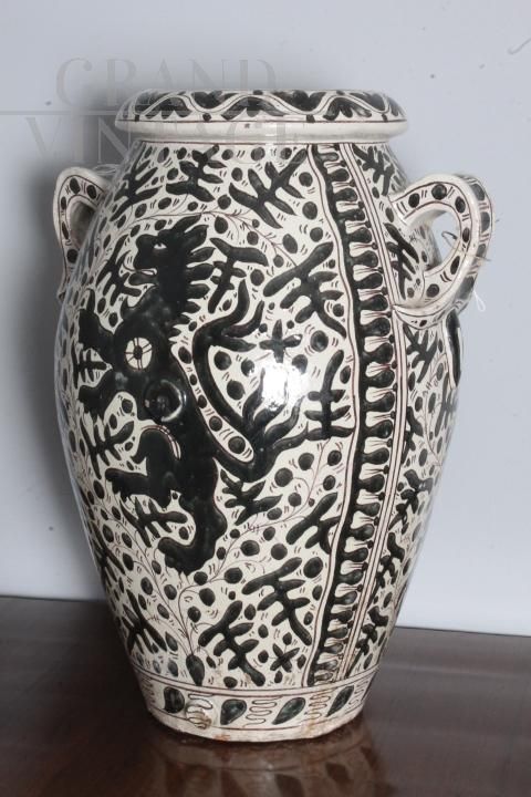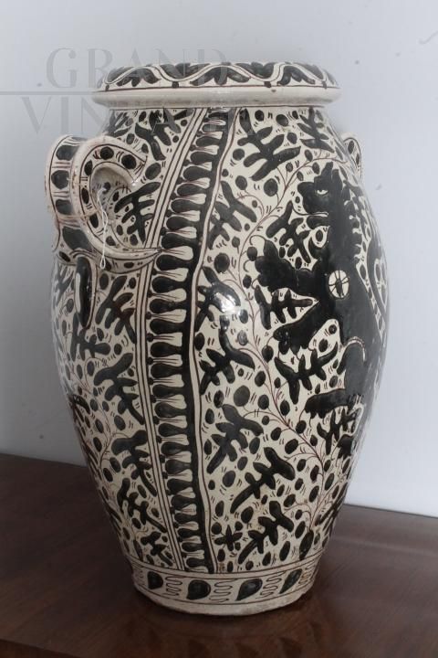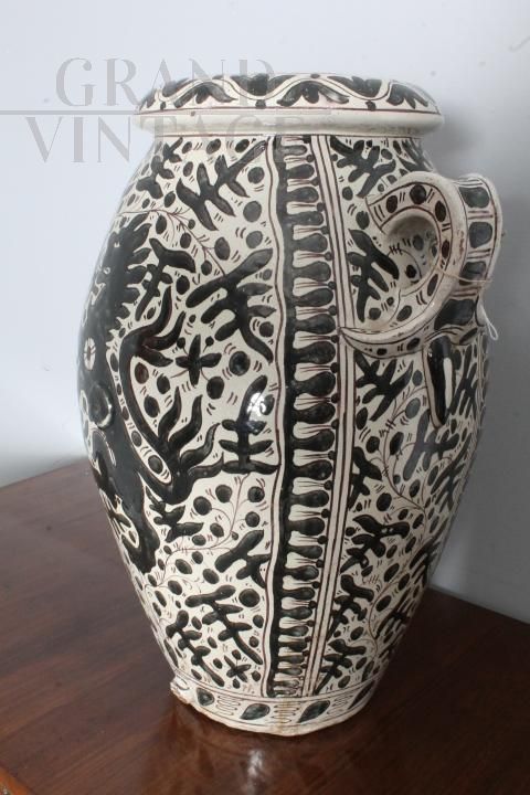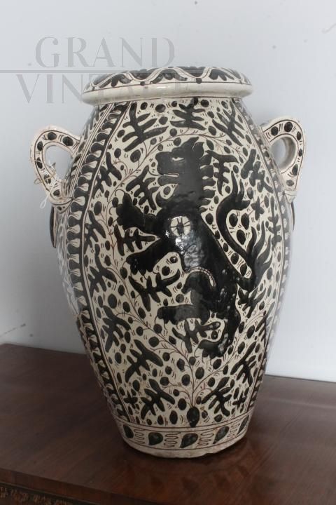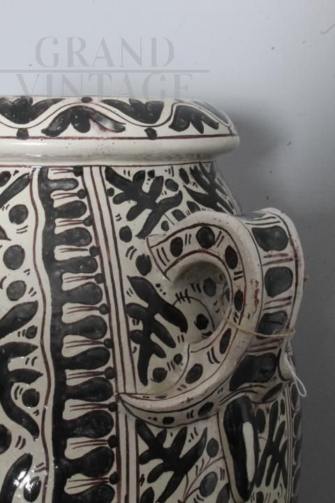 Grande vaso orcio antico in ceramica Cantagalli dei primi del '900 con decoro a zaffera medievale nei toni del bianco e nero, dipinto a mano su entrambi i lati e firmato alla base, con altezza 61 cm. Ottimo stato di conservazione.