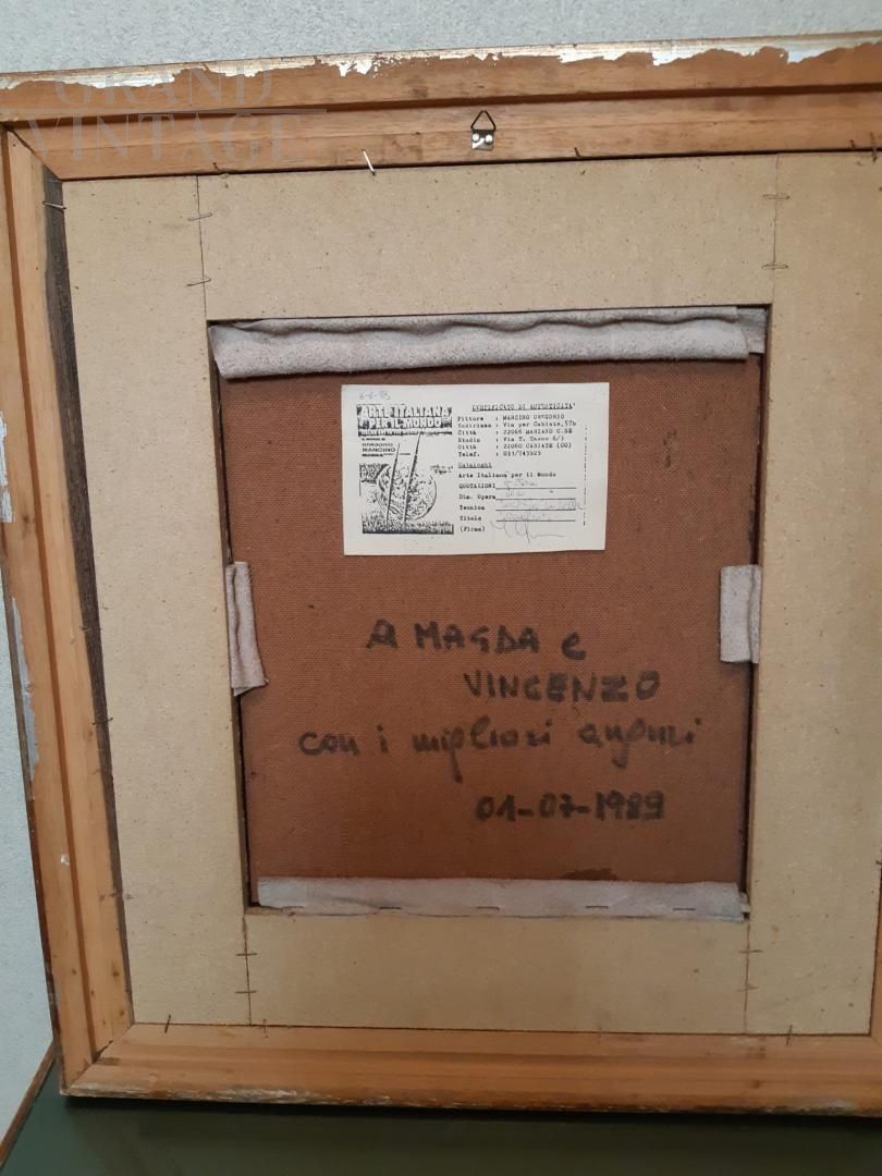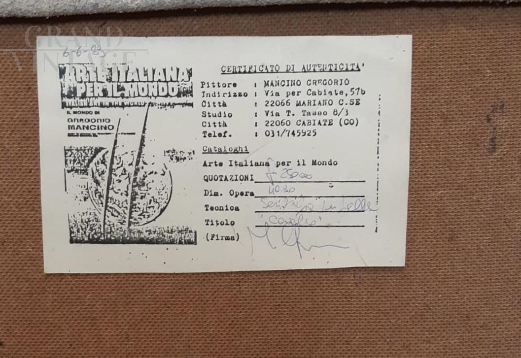 Opera realizzata su pelle dall’artista lombardo Gregorio Mancino, celebre nel mondo per i suoi cuori, raffigurante un cavallo. Una tecnica curiosa e innovativa che l’artista ha voluto sperimentare negli anni ‘80. Il dipinto è munito di certificato di originalità firmato sul retro dallo stesso artista.