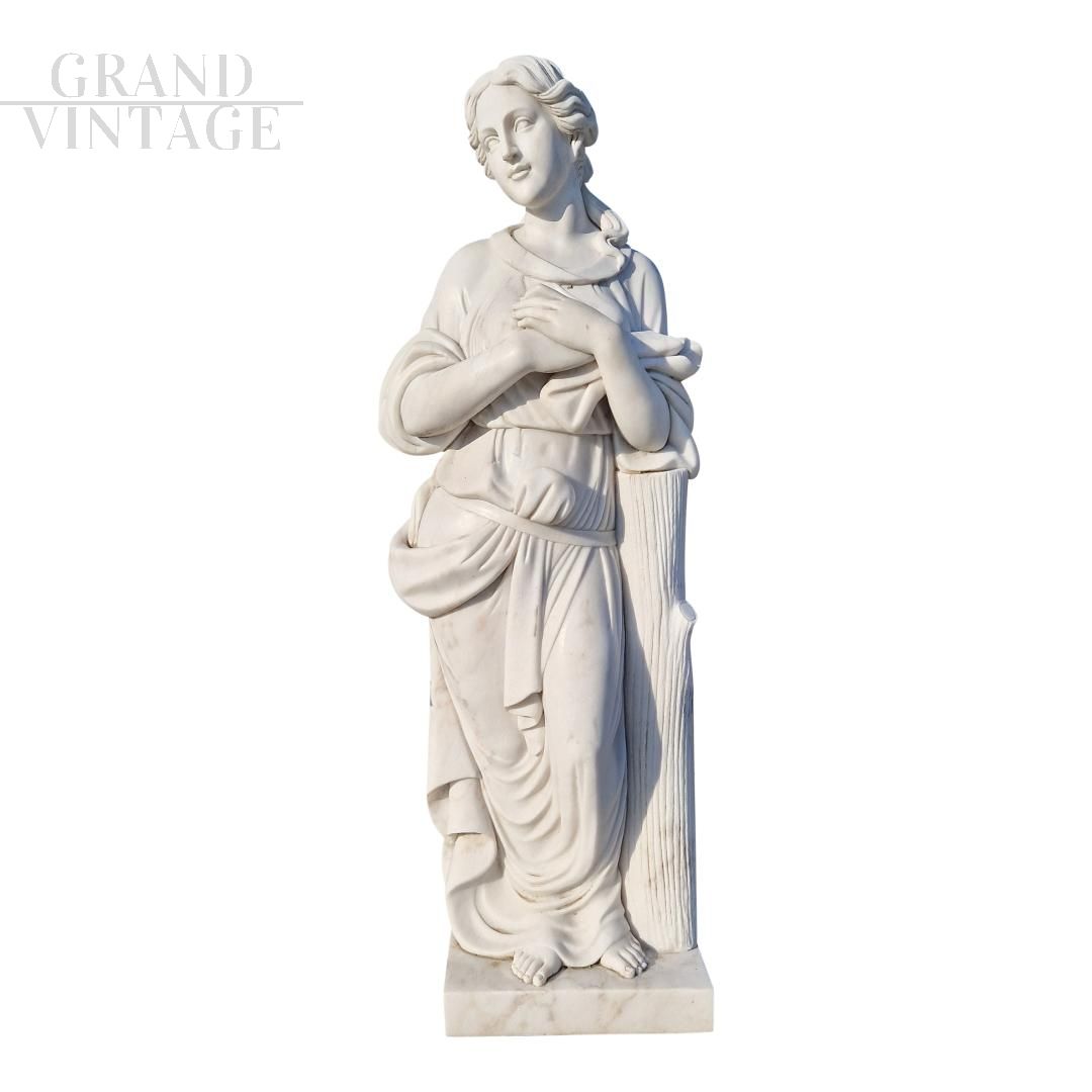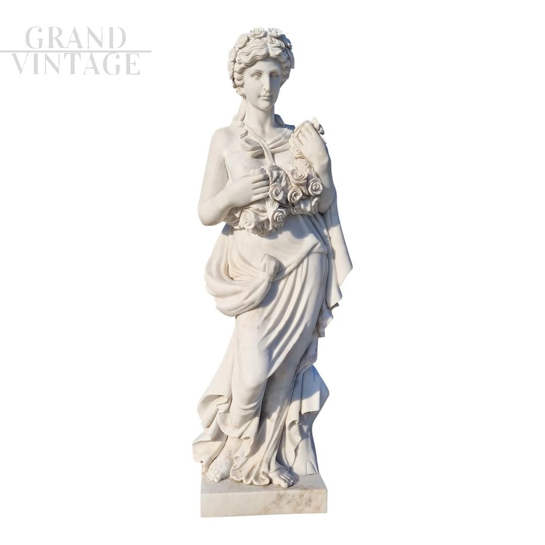 Gruppo di 4 statue pregiate in marmo bianco raffiguranti Le Quattro Stagioni rappresentate allegoricamente da figure femminili, adatte per decorare con eleganza un giardino. L'Estate è rappresentata con la spiga, la Primavera con le rose, l’Autunno con l’uva e l’Inverno riparata con la veste vellutata.