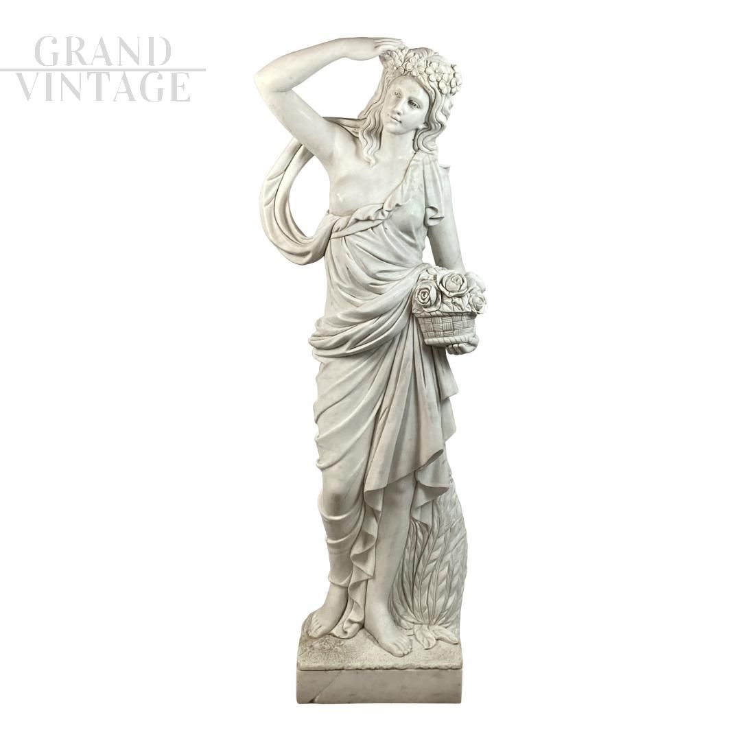 Gruppo di 4 statue pregiate in marmo bianco raffiguranti Le Quattro Stagioni rappresentate allegoricamente da figure femminili, adatte per decorare con eleganza un giardino. L'Estate è rappresentata con la spiga, la Primavera con le rose, l’Autunno con l’uva e l’Inverno con la legna da ardere.