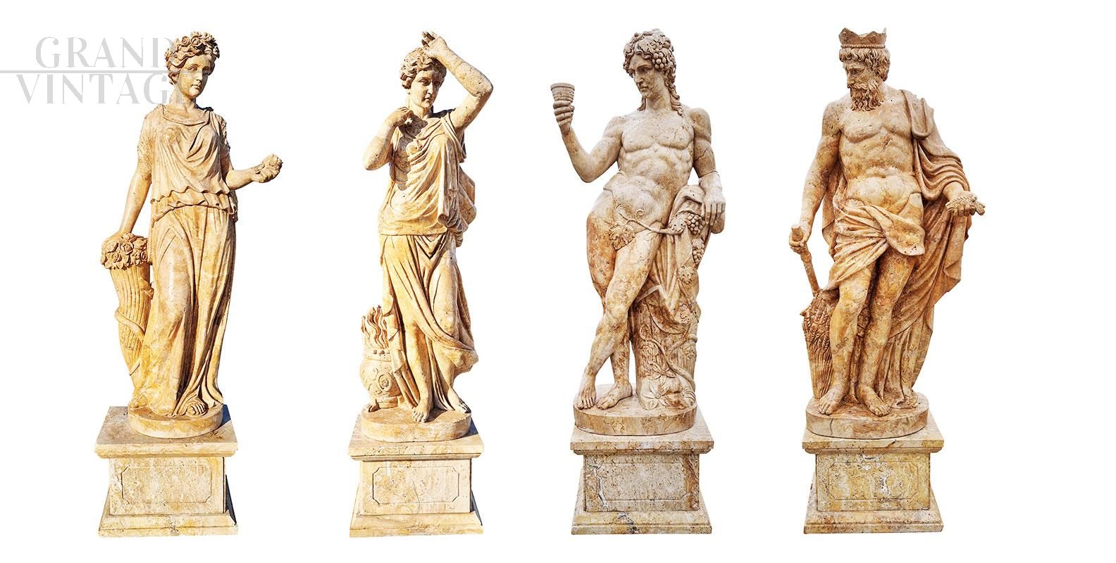 Gruppo di 4 statue pregiate in marmo travertino raffiguranti Le Quattro Stagioni rappresentate allegoricamente da personaggi neoclassici, adatte per decorare con eleganza un giardino. L'Estate, unica figura maschile, è rappresentata con la spiga, la Primavera con le rose, l’Autunno con l’uva e l’Inverno con il fuoco.
