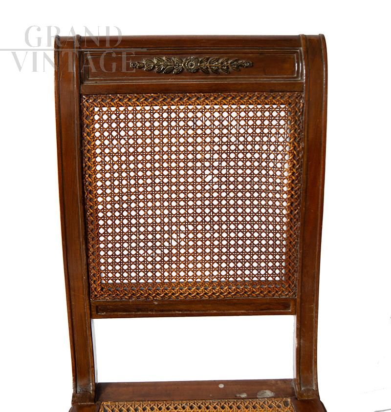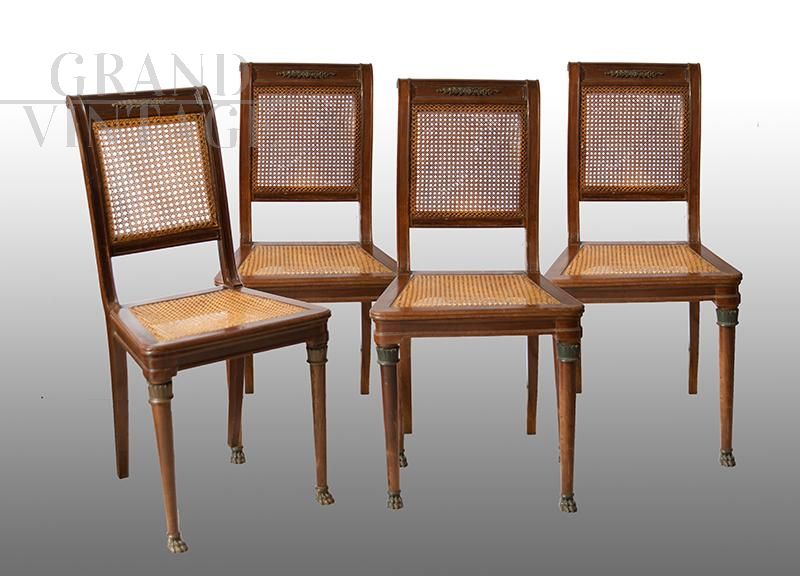 Set di 4 sedie antiche in massello di mogano e paglia di Vienna, appartenente alla seconda metà del XIX secolo. Lo schienale di forma quadrangolare è impreziosito da un'elemento fogliaceo in bronzo. I piedi sono troncoconici e terminano con delle zampe a griffe. Completo di Certificato di Autenticità.