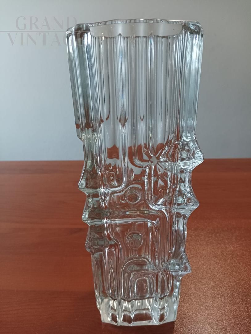 Vaso Ice Melting 617 di Vladisvav Urban per Rasice Glass Tsechoslowakia, Sklo Union, 1968, con il tipico aspetto del ghiaccio sciolto. I designer di Sklo Union si sono ispirati a semplici forme geometriche disposte sul vetro per catturare e riflettere la luce in modo moderno. Questo design si basa su una forma rettangolare con due lati piatti e curvi. Ha 4 colonne di rientranza concave disposte sui lati opposti del vaso per creare un modello di luce che cambia a seconda dell'angolo dello spettatore.