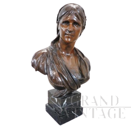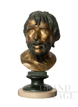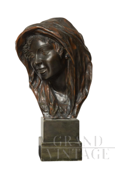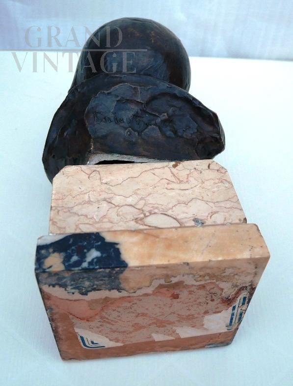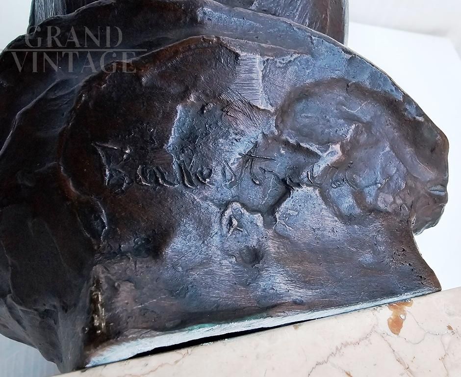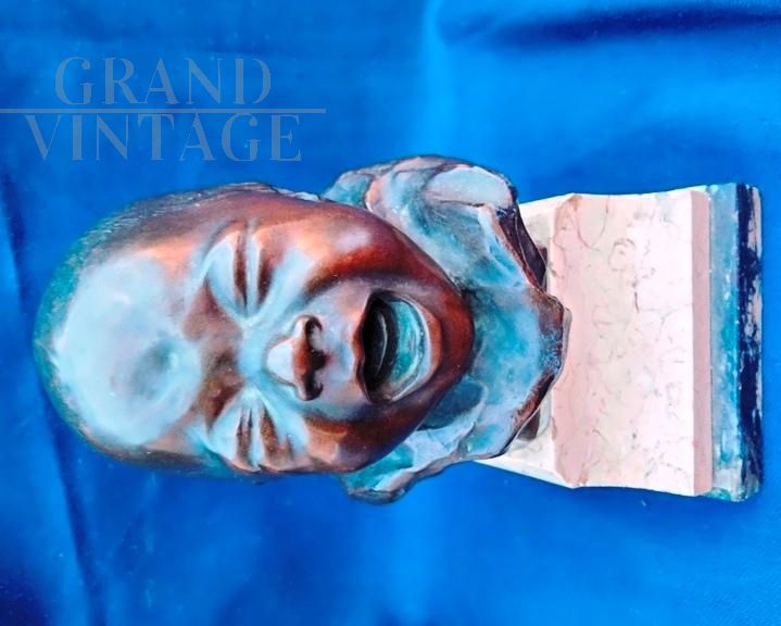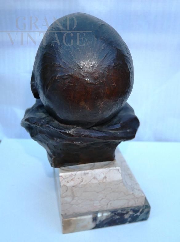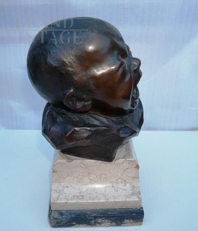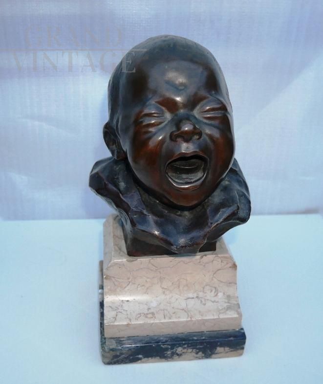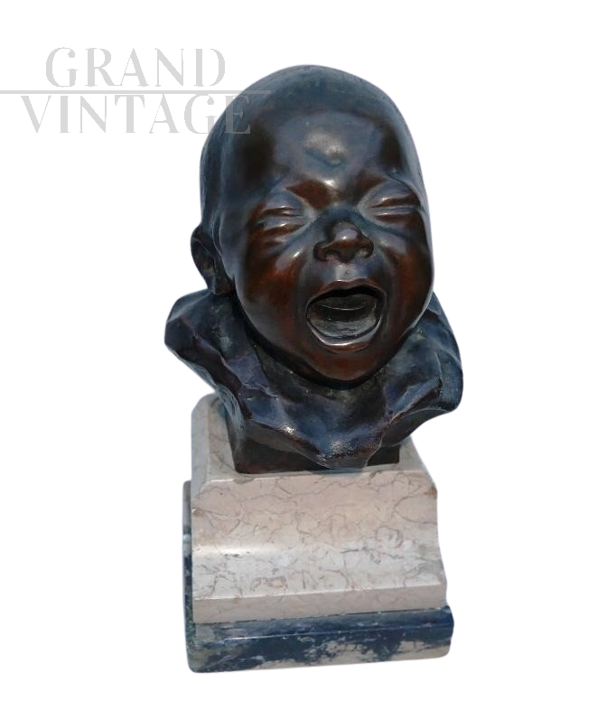 Il pianto del lattante - Scultura in bronzo raffigurante una piccola testa di bambino che piange su base di marmo, firmata sul retro Balestrieri Bernardo, Palermo 1884-1965. Epoca anni '20 / '30. In perfetto stato.