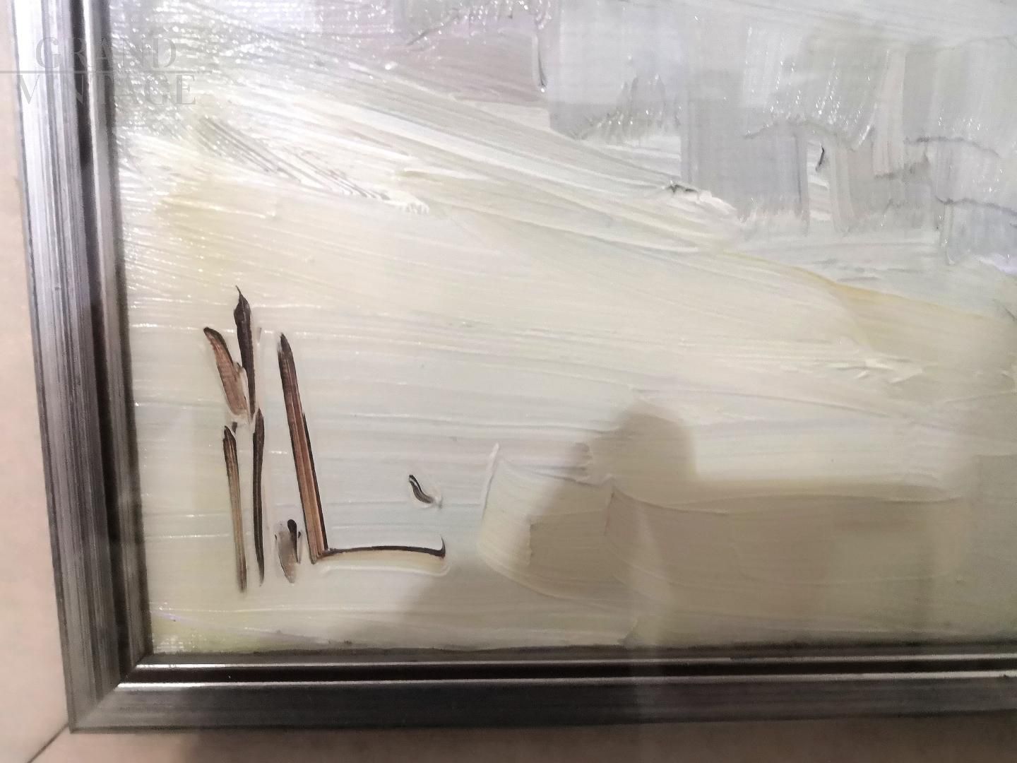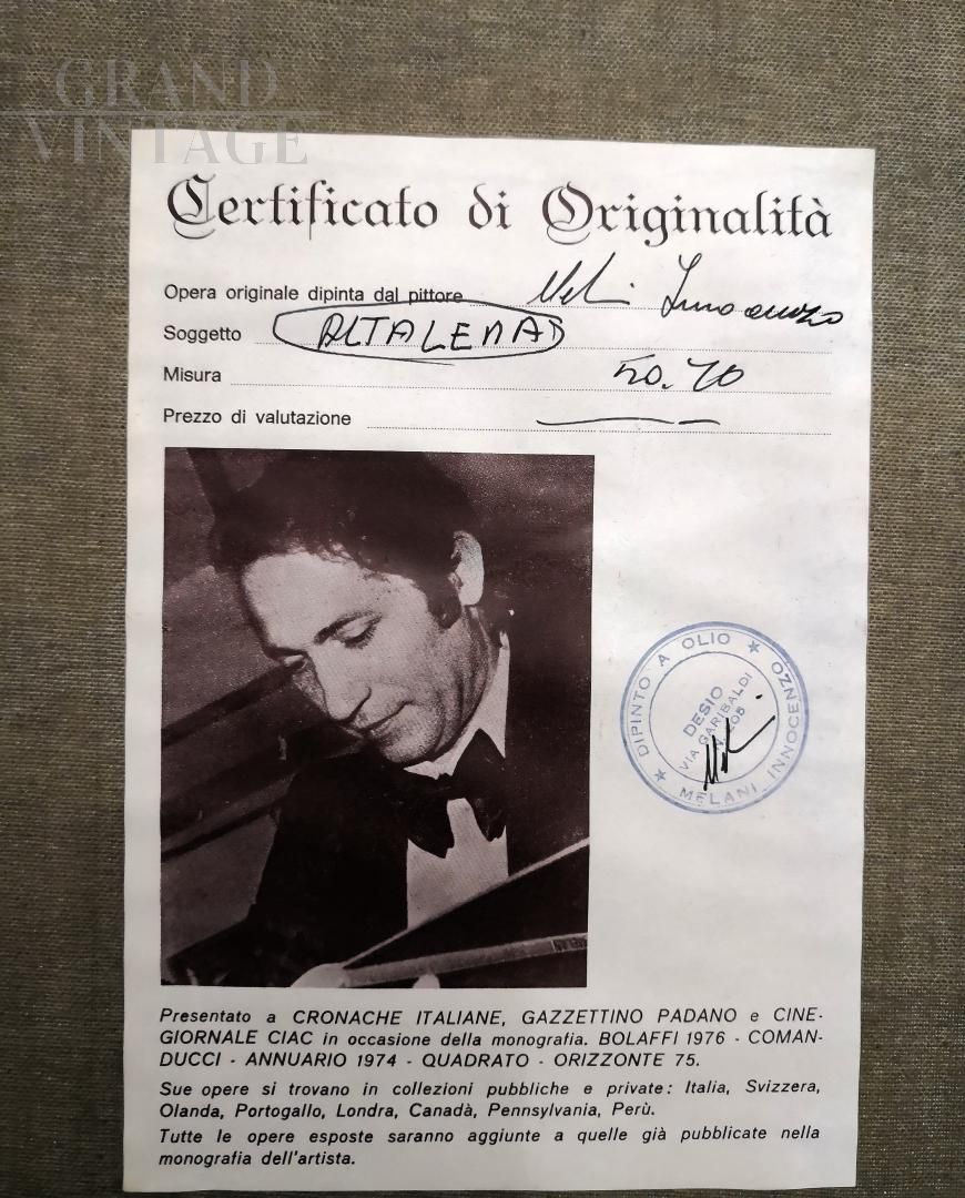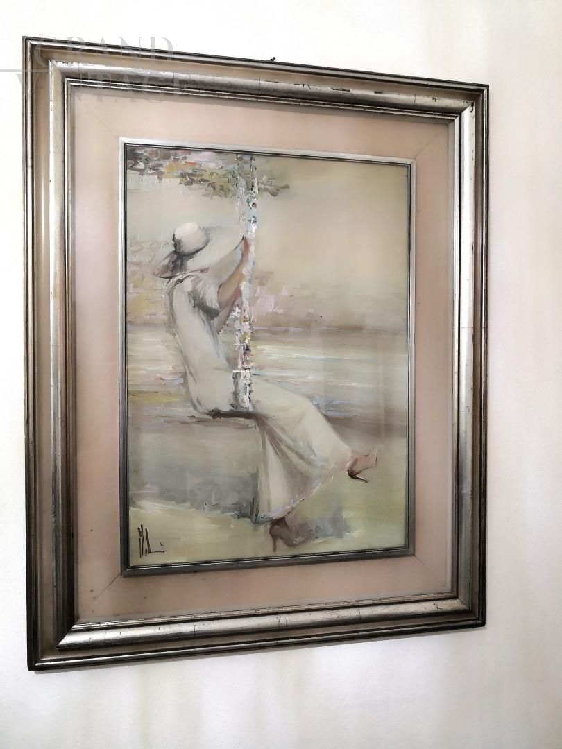 Dipinto Altalena di Innocenzo Melani raffigurante una ragazza sull'altalena, olio su tela firmato, numerato 80 e datato in annuario 1974, completo di certificato di originalità.
