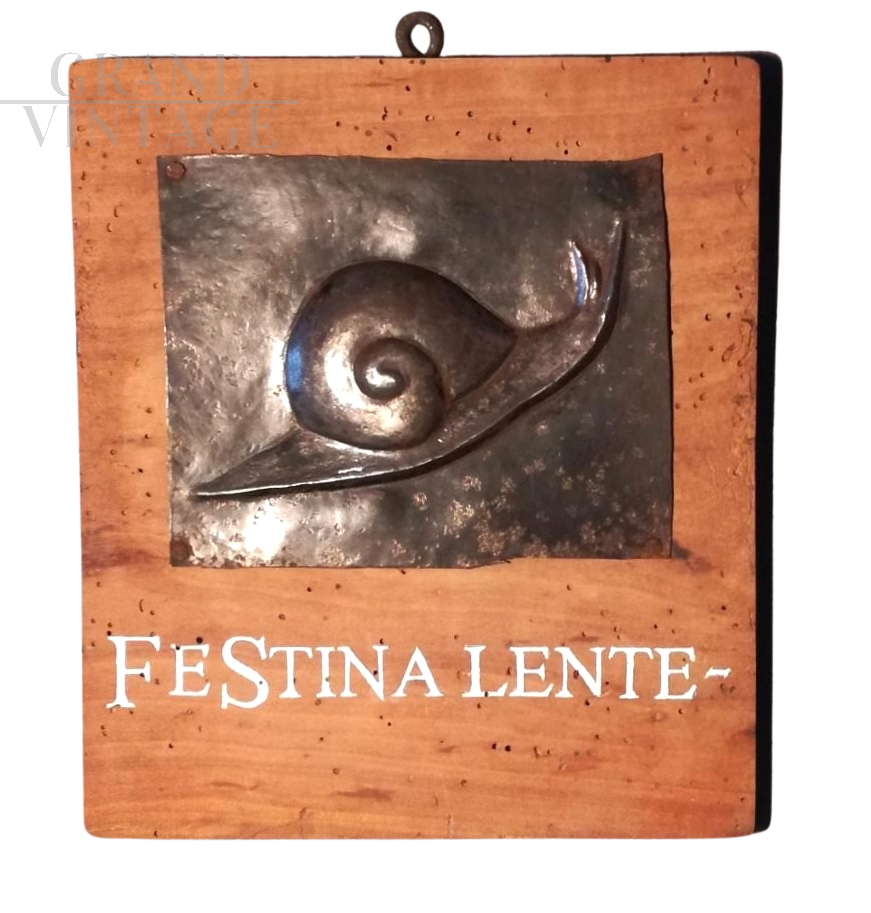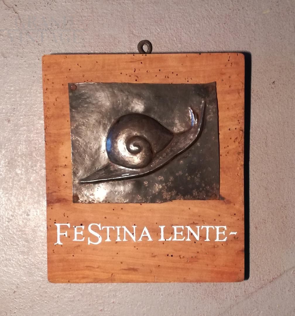 Insegna da "hostaria" con scritta Festina Lente, che si traduce in "affrettati lentamente", realizzata all'inizio del'900 in metallo pesante con figura di chiocciola in rilievo montata su pannello di legno massiccio. Sono presenti molti segni di tarlo, è però stato eseguito un trattamento antitarlo. La scritta in bianco è più recente.