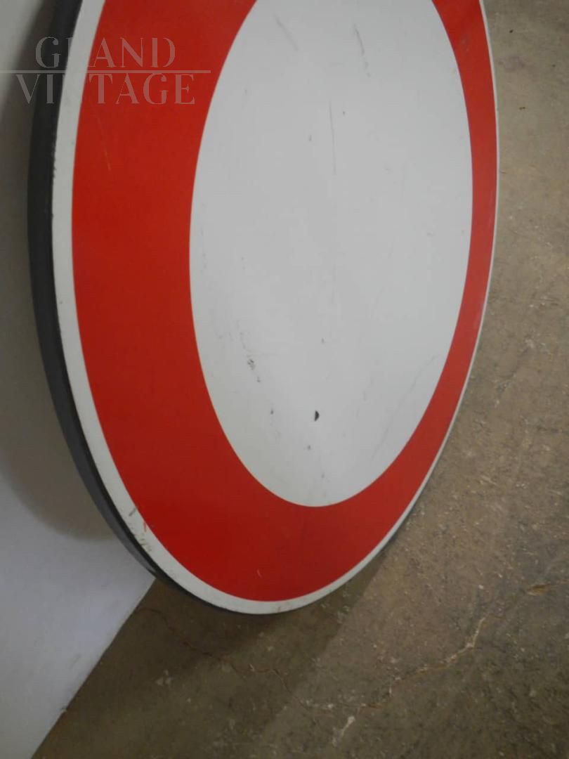 Insegna stradale vintage italiana di divieto di transito, prodotta da Sisas Segnaletica Italia, del 2004. Struttura buona con segni d’uso evidenti. Utilizzabile come piano per un tavolino originale. Disponibili 2 pezzi, il prezzo si riferisce al singolo pezzo.