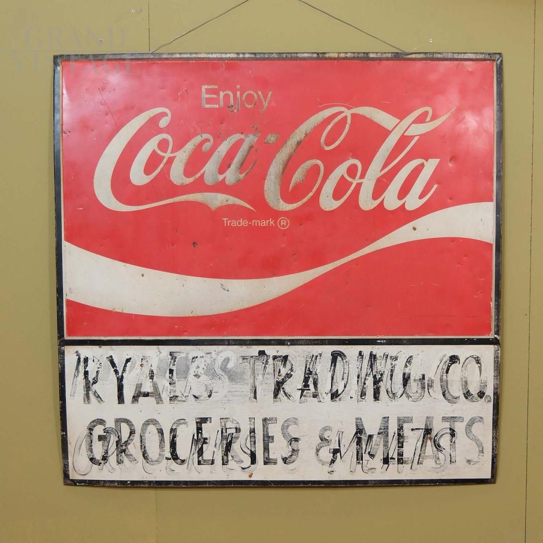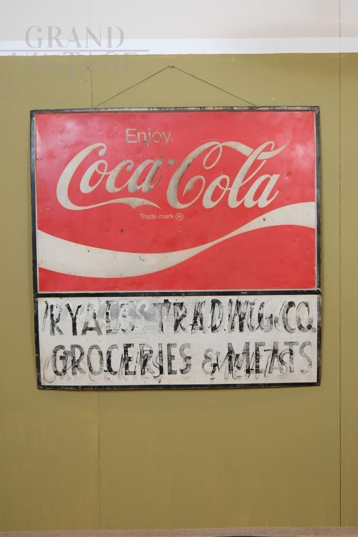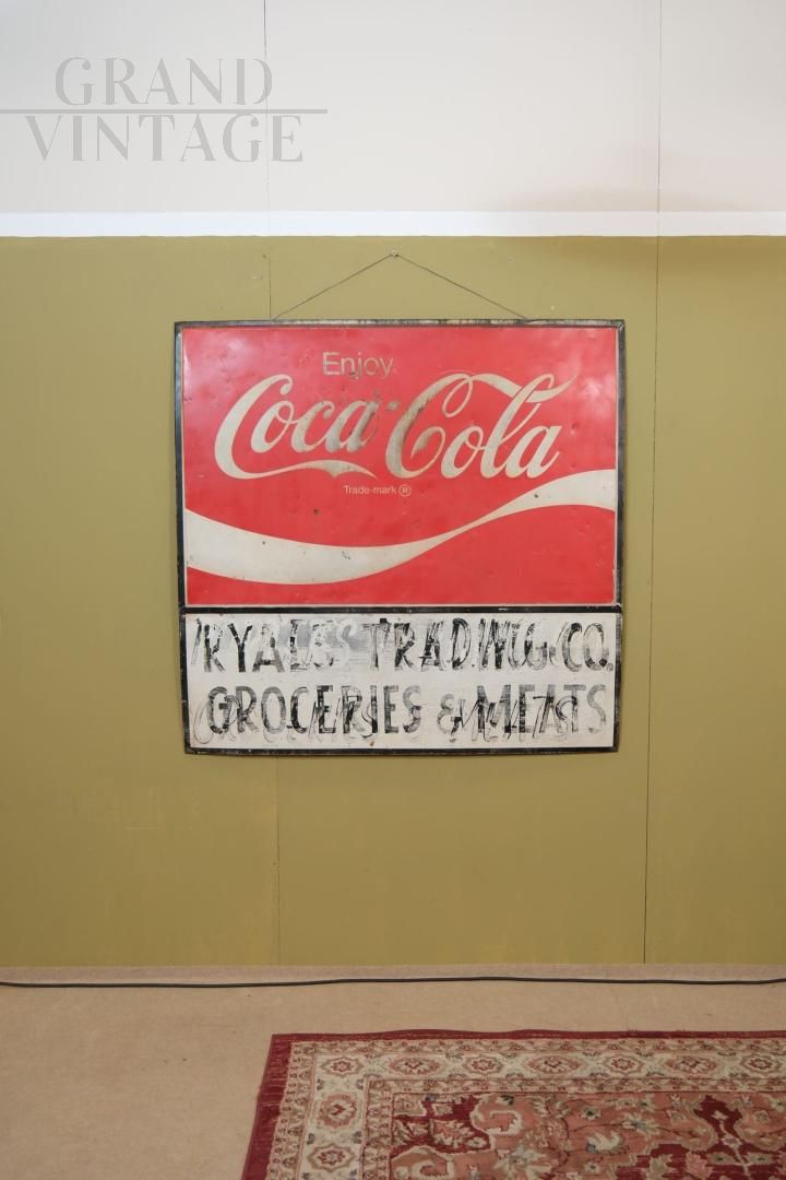 Bellissima insegna di una drogheria americana con logo Coca Cola classico originale bianco su sfondo rosso, un frammento di storia ideale per chi ama gli arredi carichi di significato e carattere.