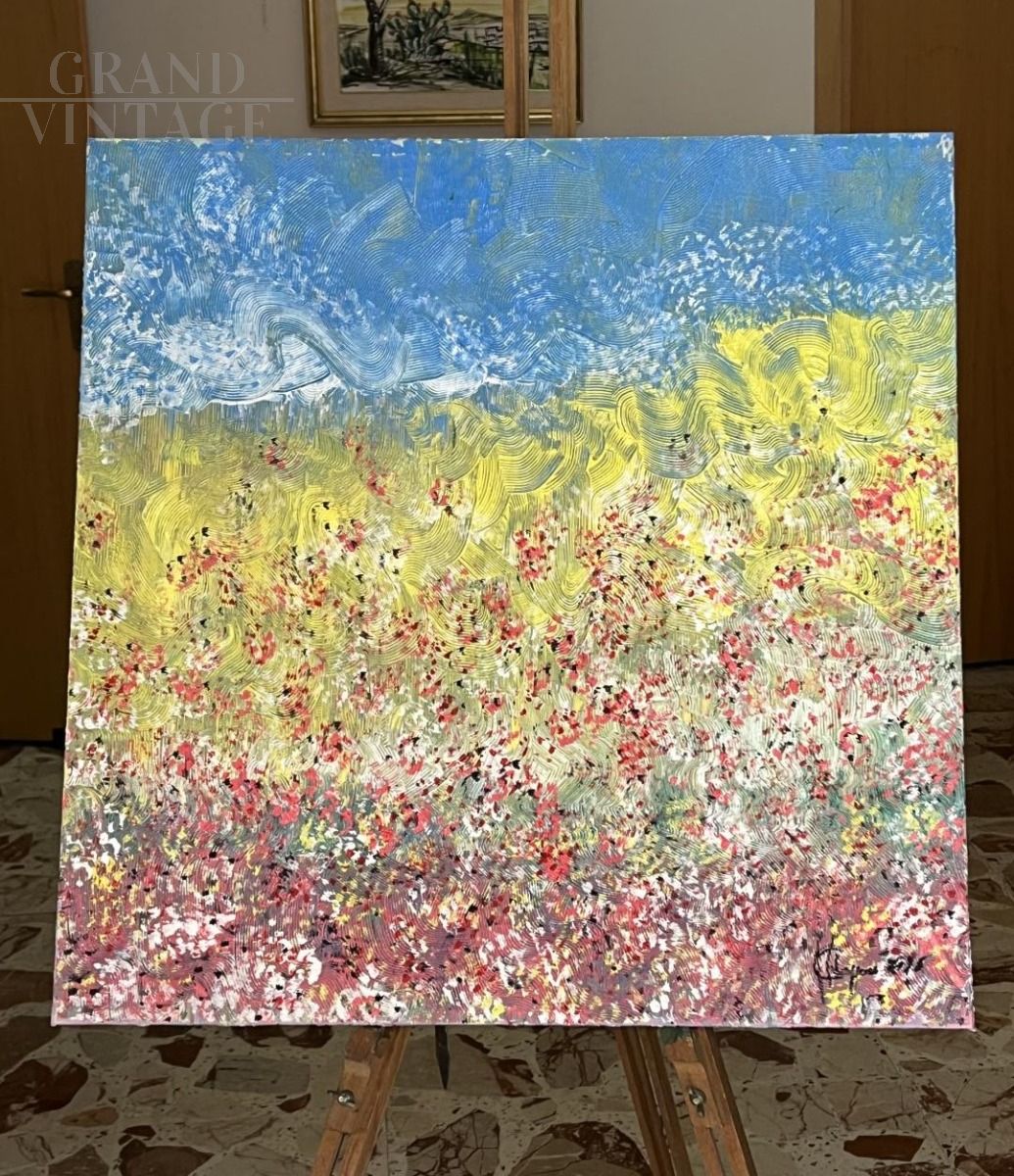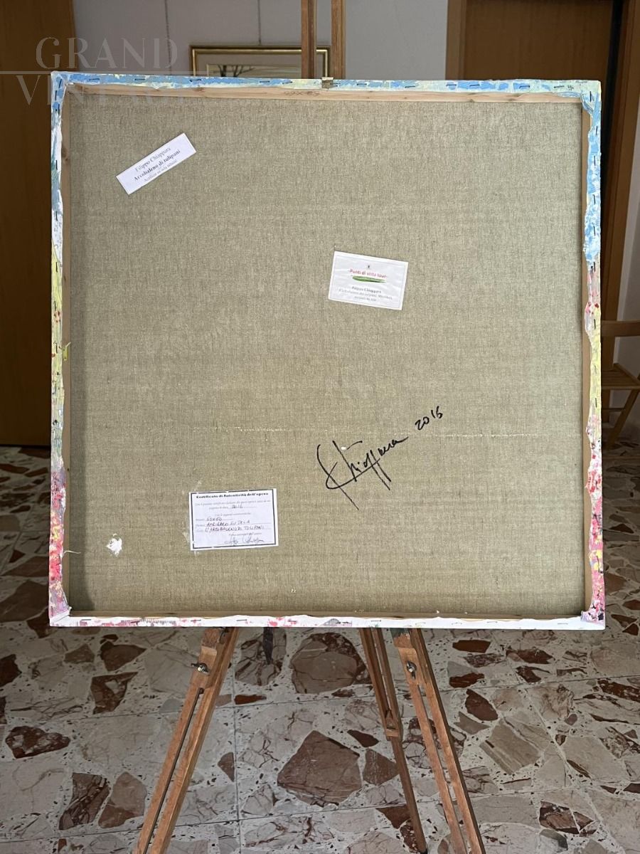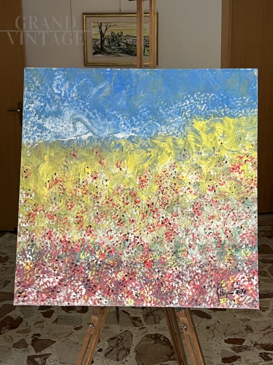 "L'arcobaleno dei tulipani" è un dipinto realizzato ad acrilico su tela dal pittore pantastrattista italiano Filippo Chiappara (1962). Un'opera pregevole dai colori vivaci capace, grazie al talento dell'artista, di proiettare l'osservatore entro un campo di tulipani, reso ancor più sinuoso dai movimenti ondulati tipici di Chiappara. Il dipinto è stato esposto nel 2016 ad Orvieto e Cagliari alla mostra "Punti di Vista Tour" ed è munito di certificato di autenticità firmato dall'artista in persona. Misure dell'opera: 60x60 cm Opera firmata dall'artista sia sul fronte che sul retro. Ideale per decorare qualsiasi ambiente.