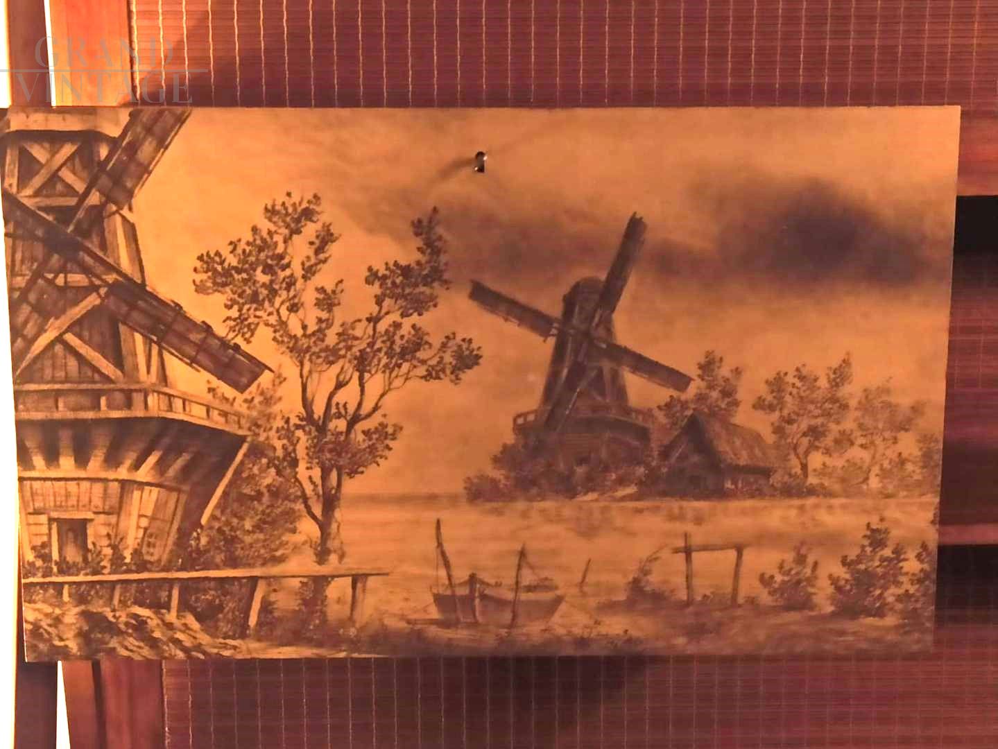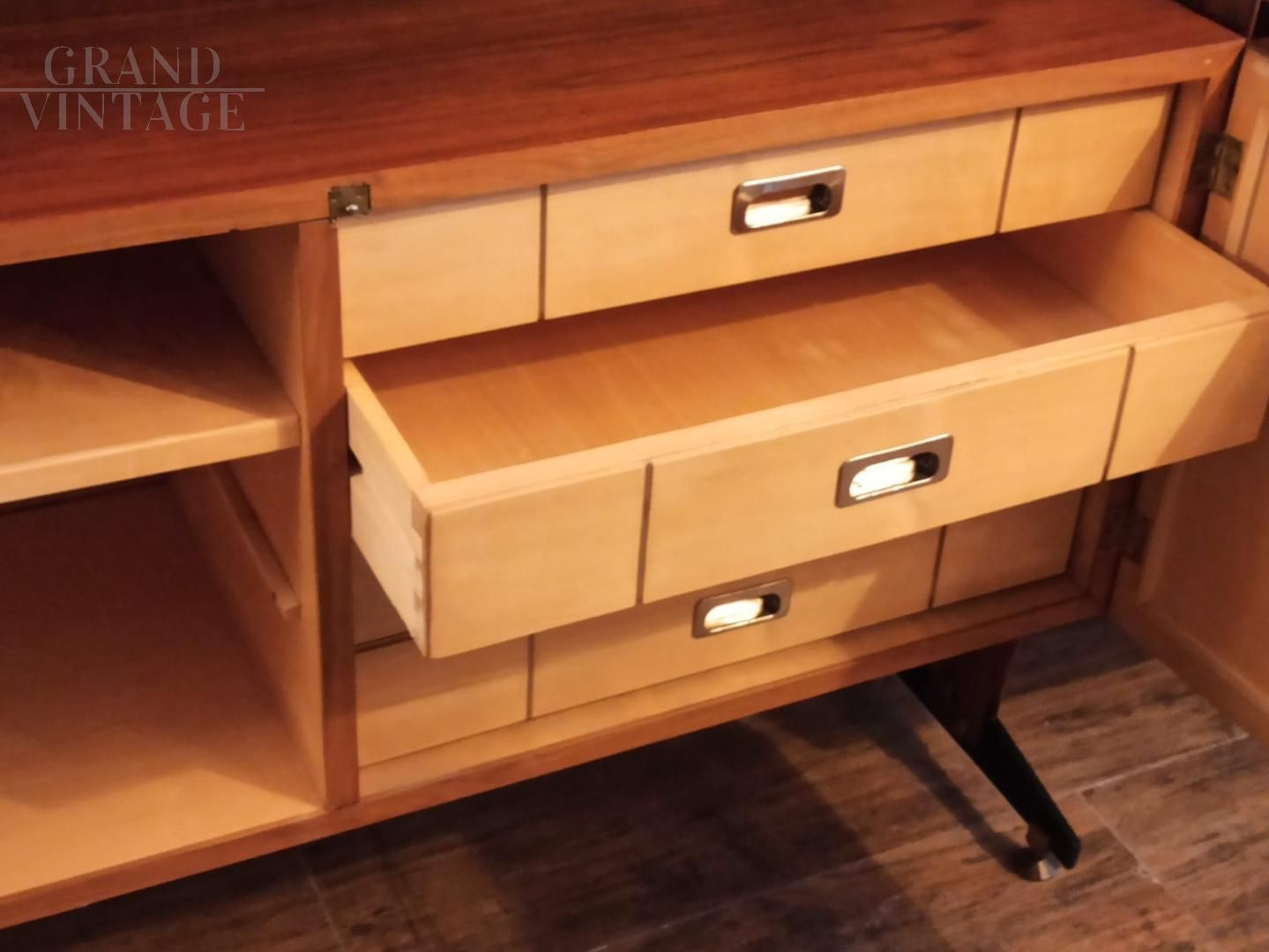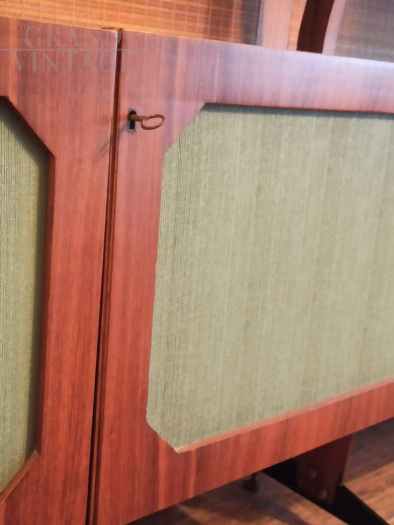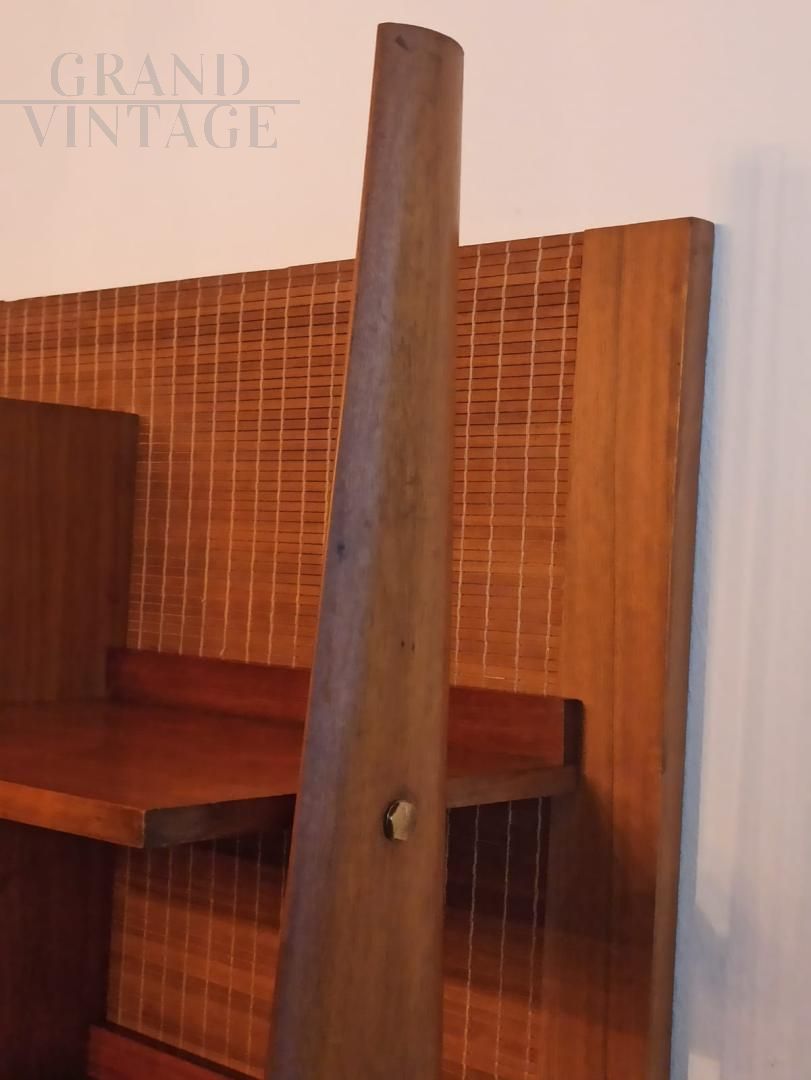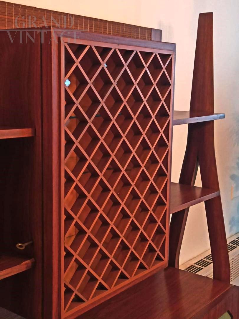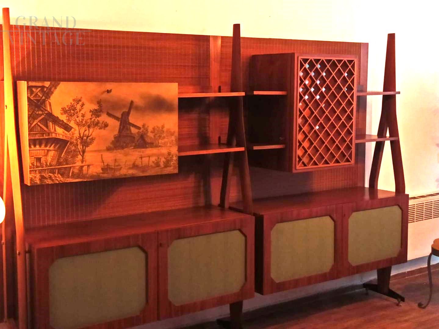 Libreria a parete vintage La Permanente Mobili di Cantù. La libreria è composta da tre elementi con posizione regolabile in legno di palissandro, con maniglie e supporti in ottone, ed è impreziosita da un dipinto monocromo firmato del pittore Ferruccio Formenton, realizzata negli anni ’50 - '60, in buono stato di conservazione, si smonta completamente per agevolarne il trasporto.