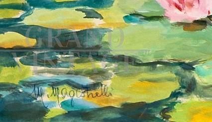 Questo pregevole dipinto raffigurante un lago con Ninfee appartiene alla pittrice Miranda Magistrelli, nata a Magenta (Milano) nel 1927 e scomparsa a Vercelli nel 2007. Fu allieva del pittore Giuseppe Rinone e partecipò a numerose mostre personali e collettive.