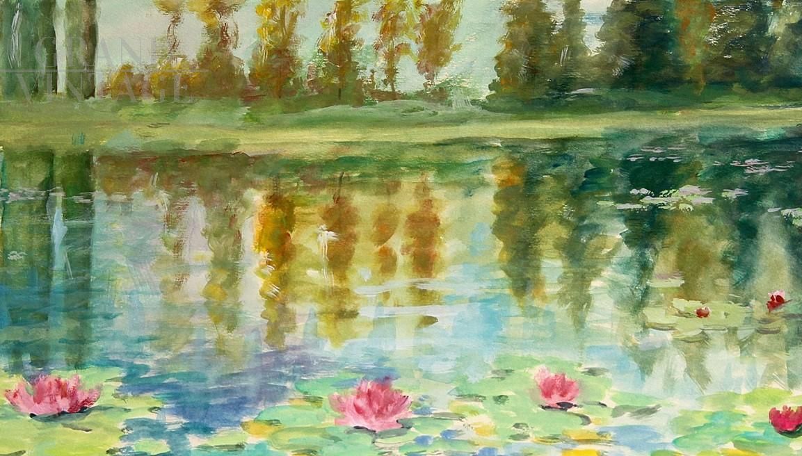 Dipinto ad acquarello su cartoncino di Miranda Magistrelli, soggetto Lago con Ninfee, cm 35 x 50.
