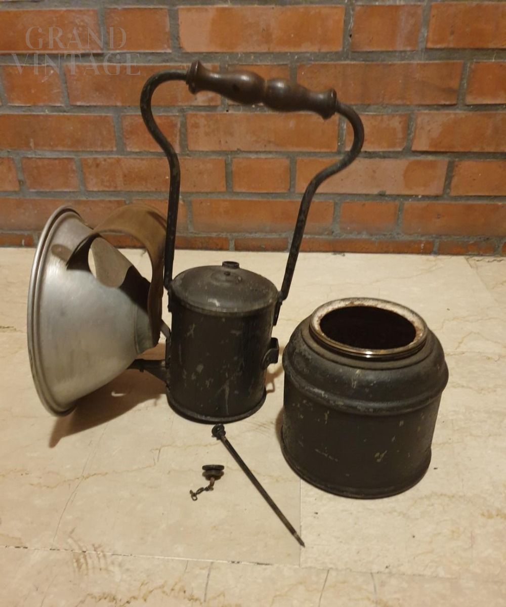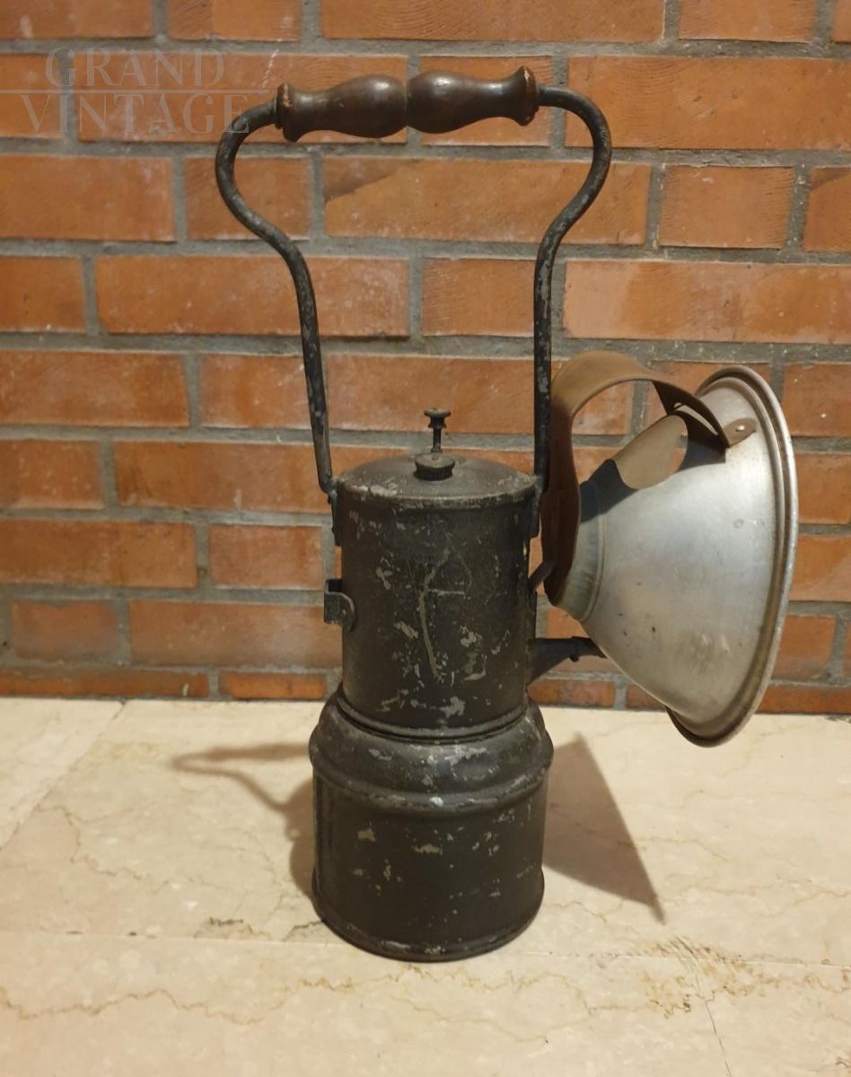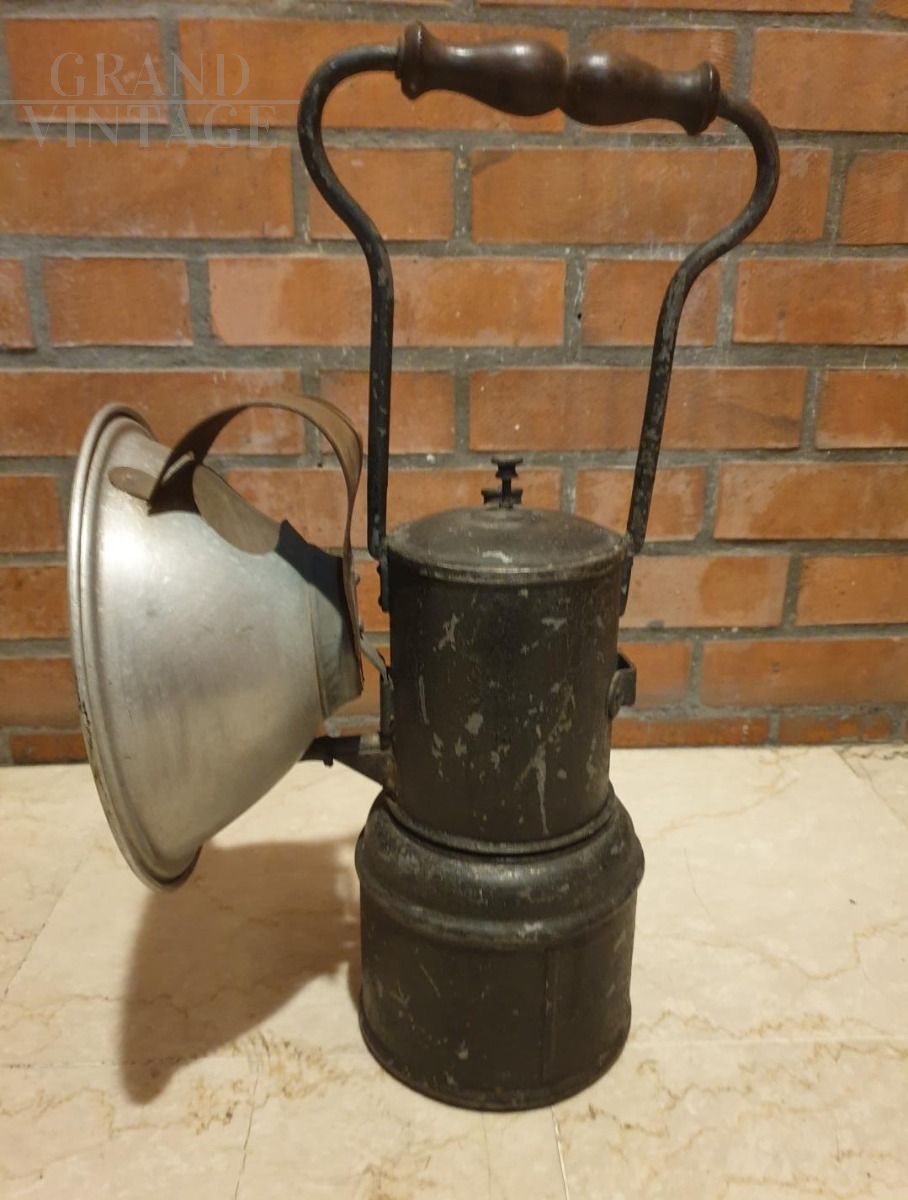 Lampada a carburo per usi diversi, provvista di maniglia per il trasporto con impugnatura di legno. Veniva utilizzata sia per segnalazioni che per escursioni in particolare per la raccolta delle lumache, ma anche per la sorveglianza di argini. Si tratta di lampade prodotte nella zona di Ferrara, dagli anni '60 agli anni '80.