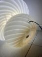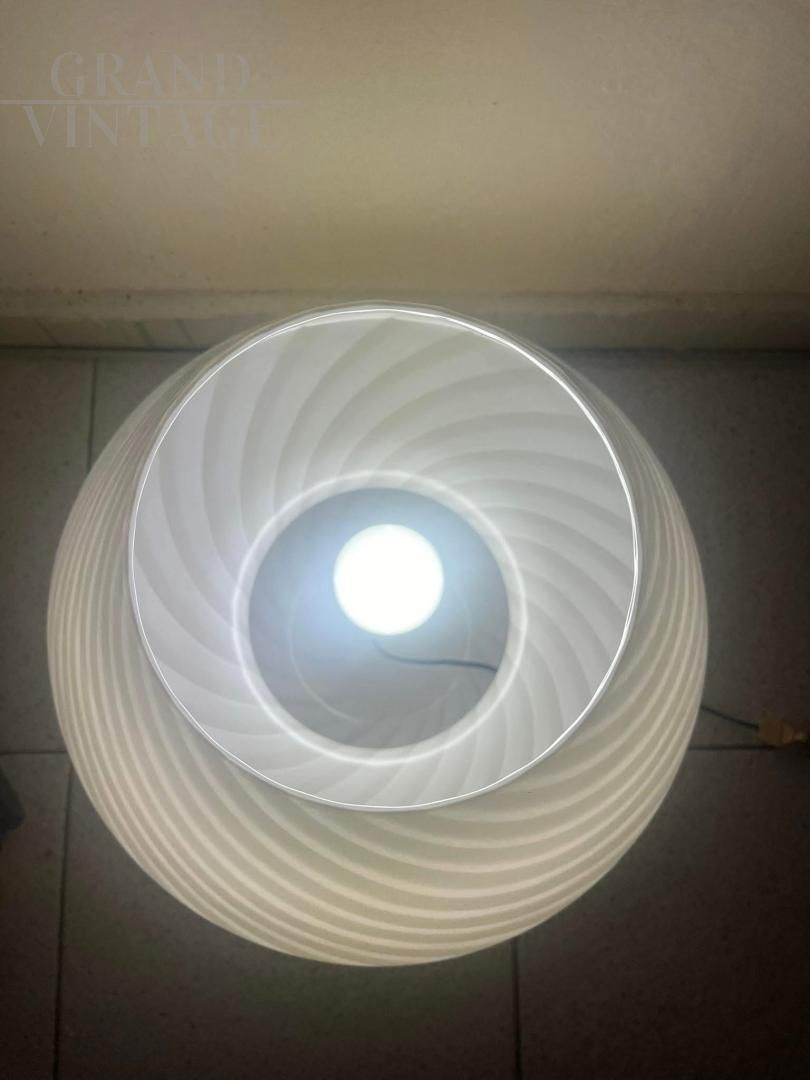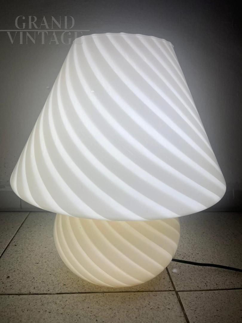 Lampada a fungo in vetro di Murano con lavorazione a vortice in doppio colore sui toni del bianco e del beige, altezza 41 cm, circonferenza 40 cm.