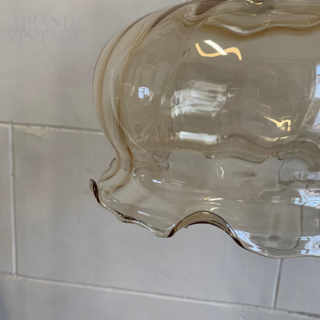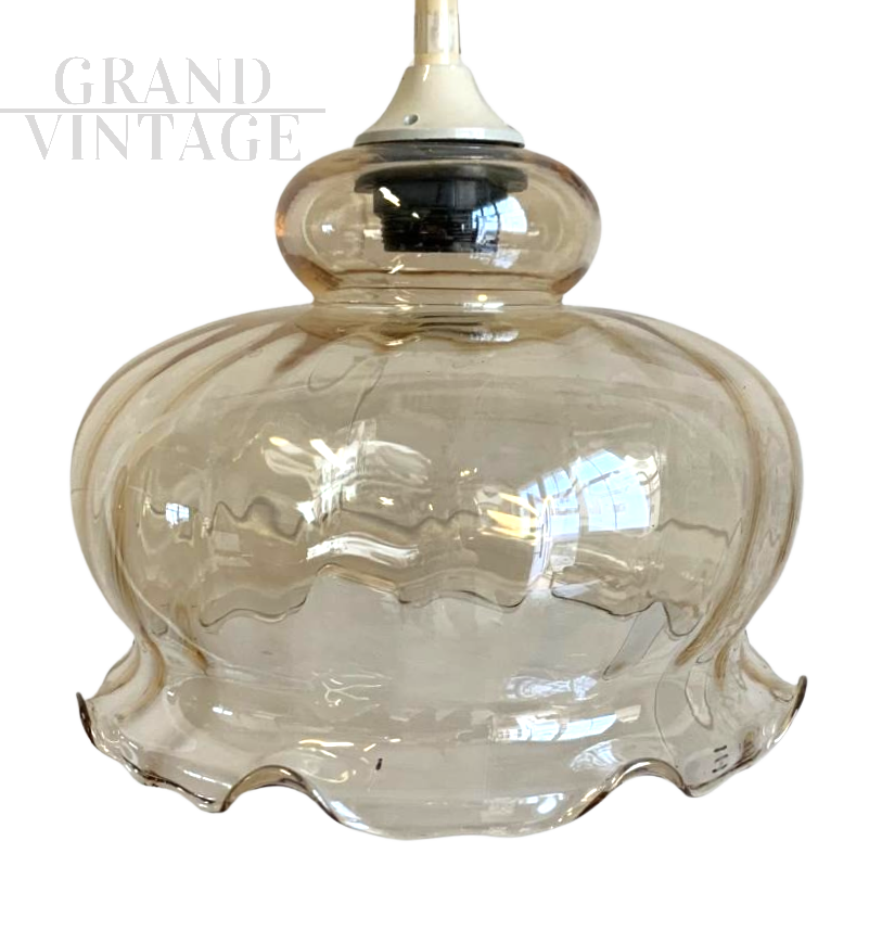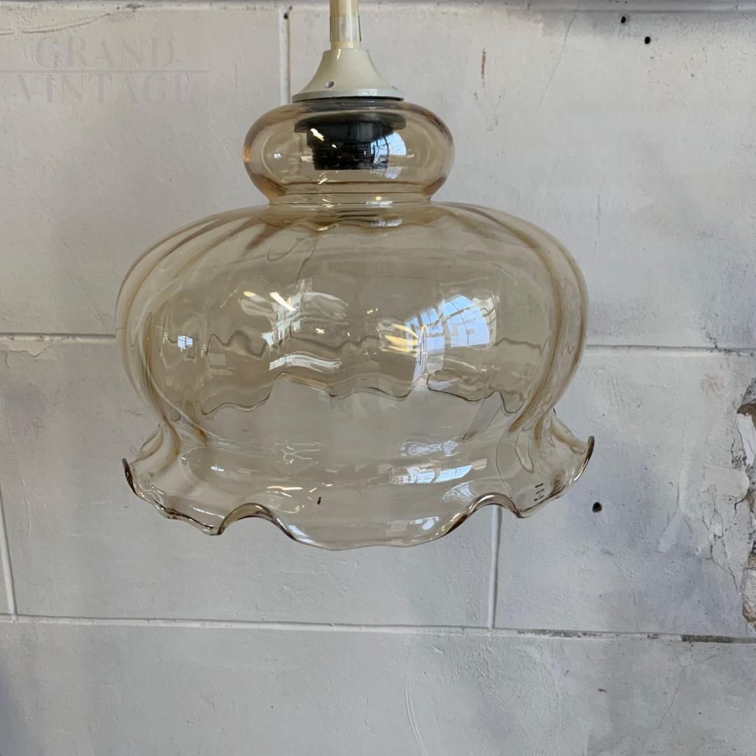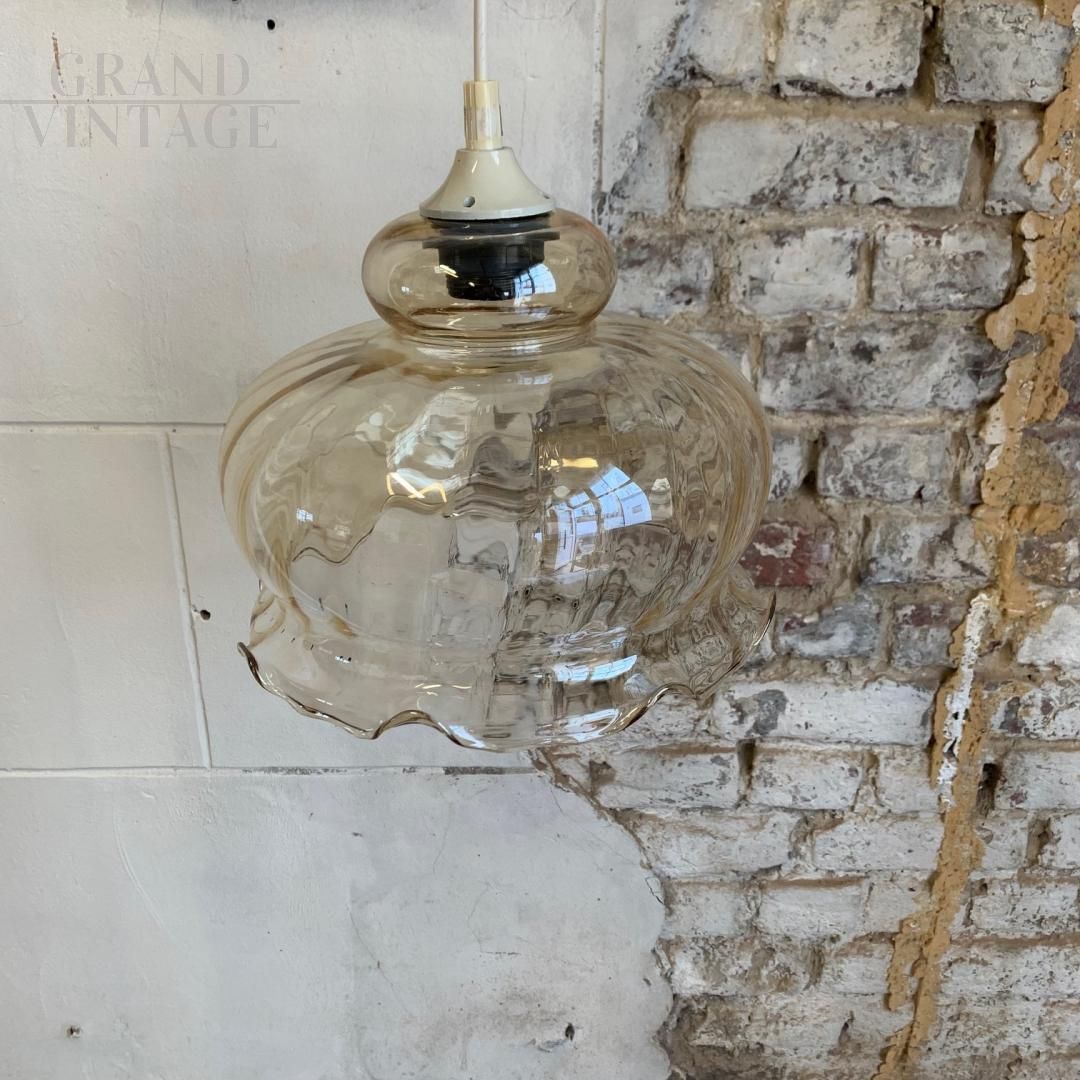 Lampada a sospensione vintage in vetro color ambra a forma di campana bombata, degli anni '70, in buone condizioni generali con le naturali tracce del tempo.