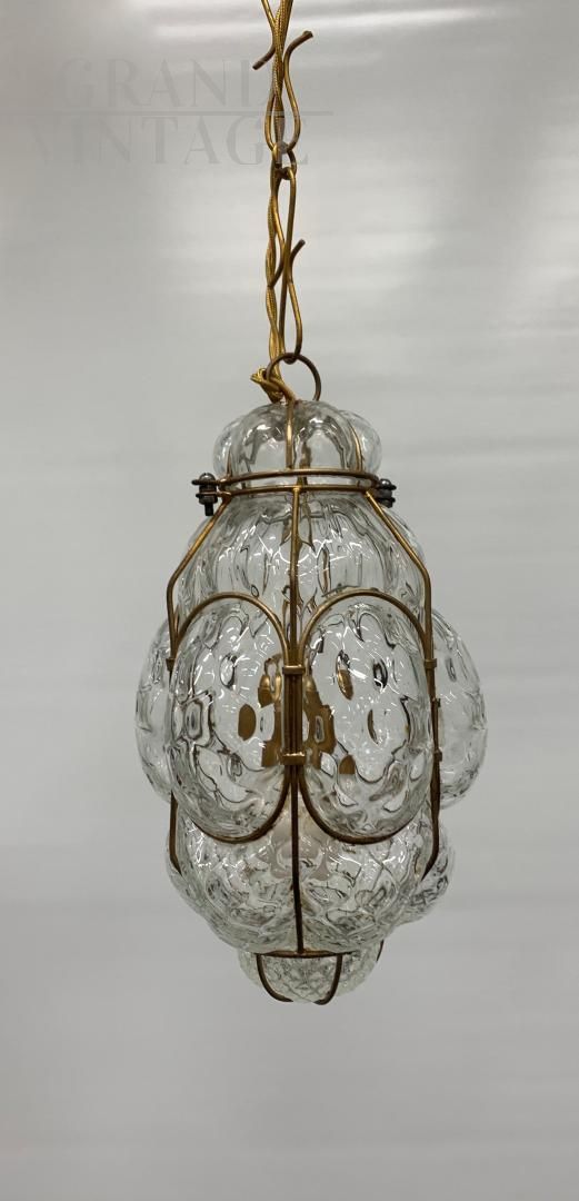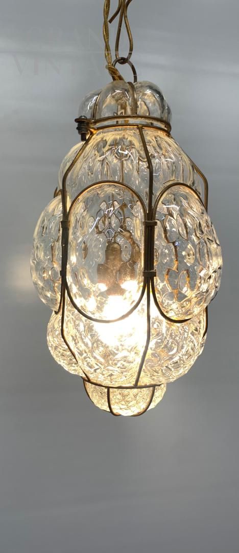 Lanterna sospesa in vetro di Murano di medie dimensioni, elegantemente decorata con una struttura di ottone dorato lavorato a riccioli che avvolge un corpo in vetro finemente decorato . La lanterna accesa e crea suggestivi giochi di luce sulle pareti circostanti, grazie alla texture del vetro e alla rifrazione luminosa;il cavo e la catena presentano un rivestimento intrecciato dorato che si abbina perfettamente alla struttura della lanterna, conferendole un aspetto classico e raffinato. Ideale per ambienti eleganti come ingressi,. Lanterna attribuita alla ditta A.V.E.M con impianto elettrico nuovo; ha un portalampada e27. Dimensioni Altezza totale: 87 cm (inclusa la catena di sospensione) Altezza lanterna: 36 cm Larghezza: 28 cm