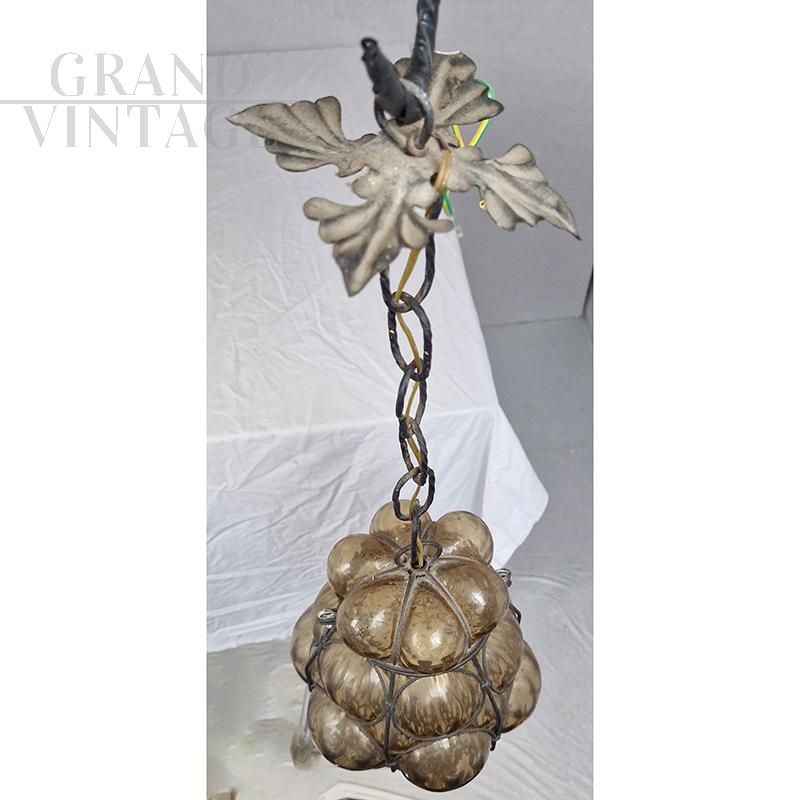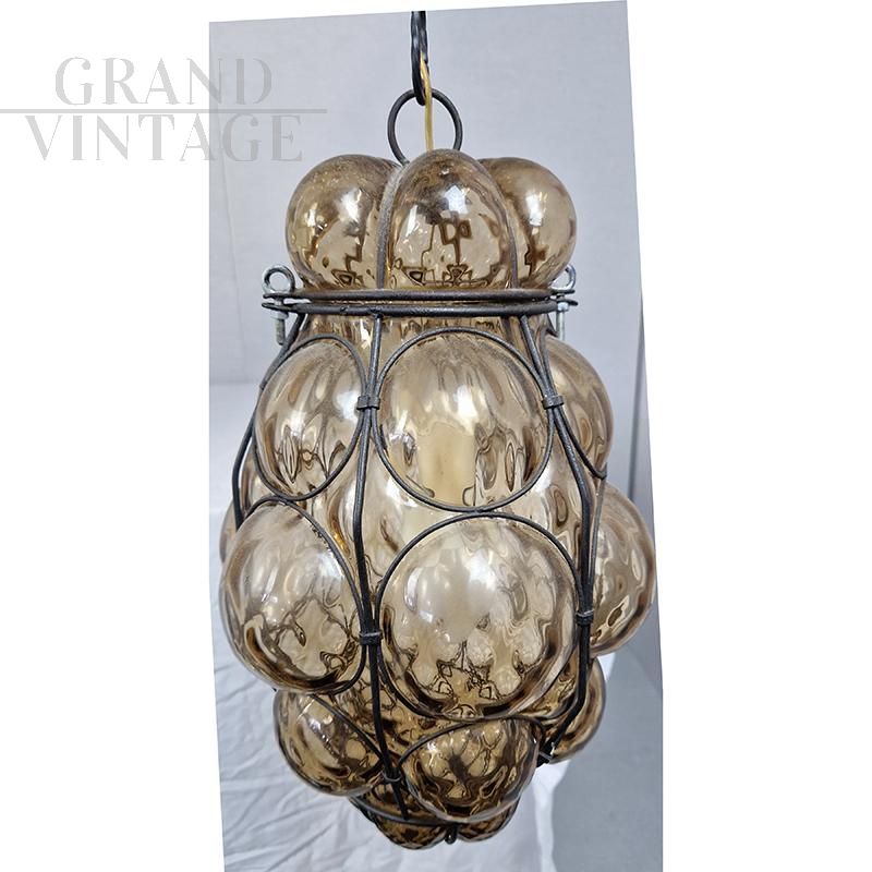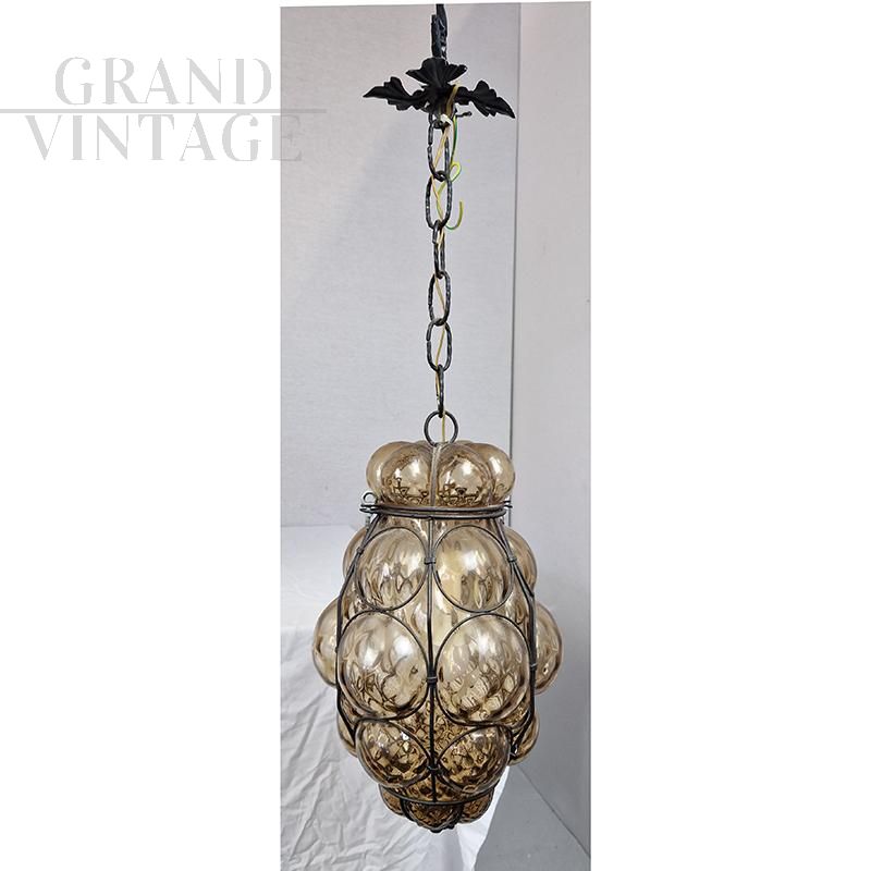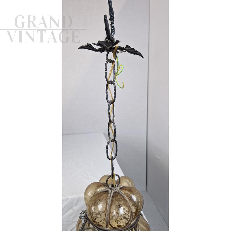 Particolare lampada a sospensione vintage a lanterna in vetro di Murano color ambra - marrone soffiato a mano in una struttura reticolare in ferro battuto, modernariato italiano.