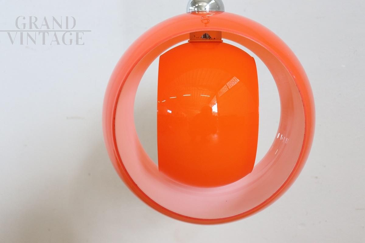 Vi presentiamo questa lampada da soffitto dal design italiano degli anni '60. Realizzata in pregiato vetro di Murano, arancione all'esterno e bianco all'interno, ottenuto grazie alla tecnica di lavorazione chiamata "vetro incamiciato". La lampada ha un fantastico design futuristico che rappresenta perfettamente il periodo dell'era spaziale. Due vetri circolari uno dentro l'altro che hanno la possibilità di ruotare creando fantastici giochi di luce. L'effetto ottico della luce che incontra il vetro arancione è sorprendente. La lampada, dotata di lampadina, è in perfette condizioni con impianto elettrico ricablato. Perfetta per essere collocata in un corridoio, in un ingresso o in qualsiasi stanza della casa dove sia necessario inserire una luce dal design futuristico e accattivante.
