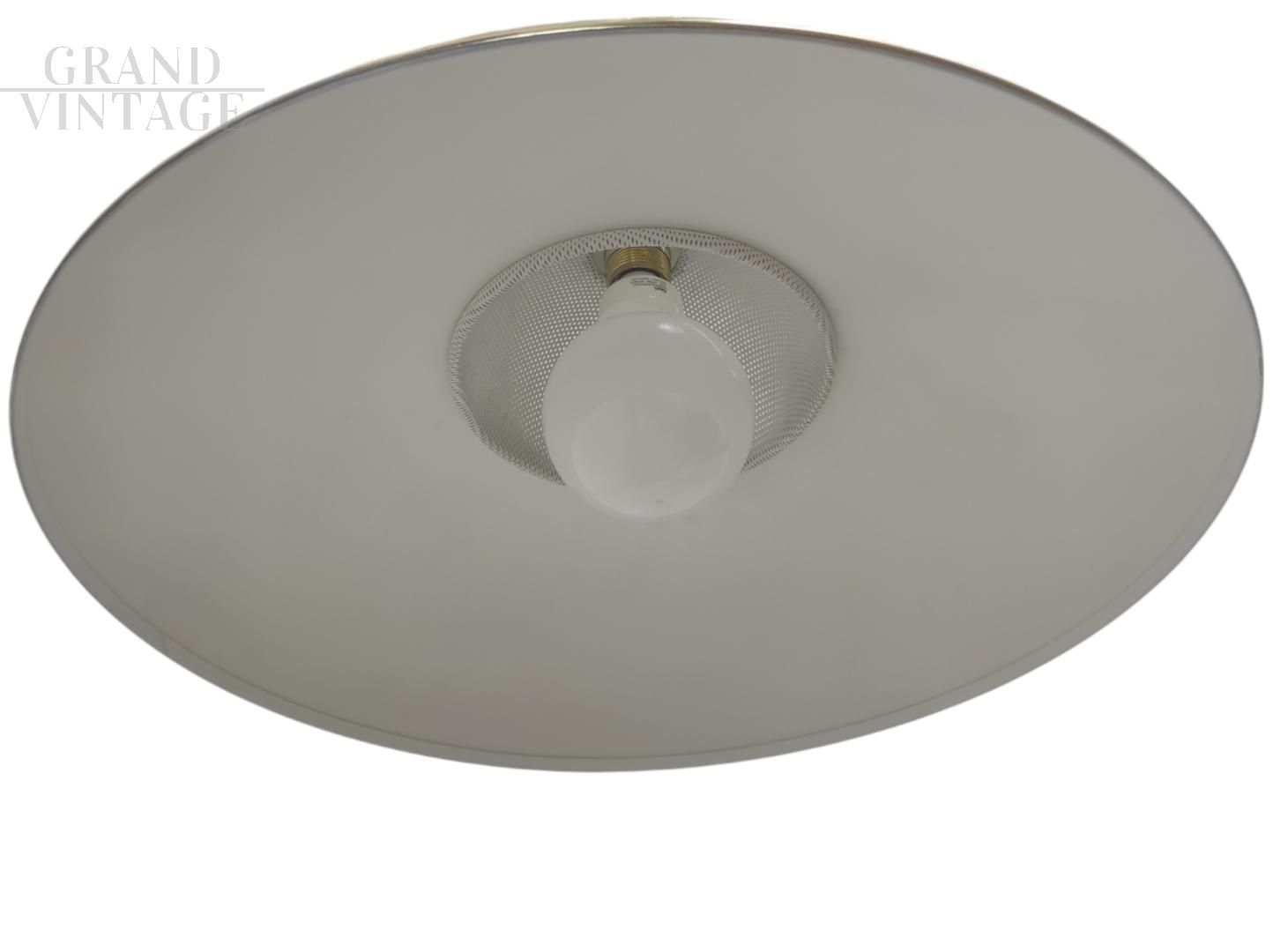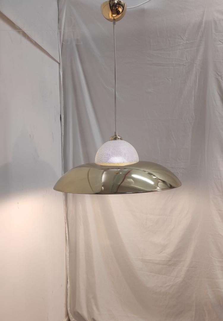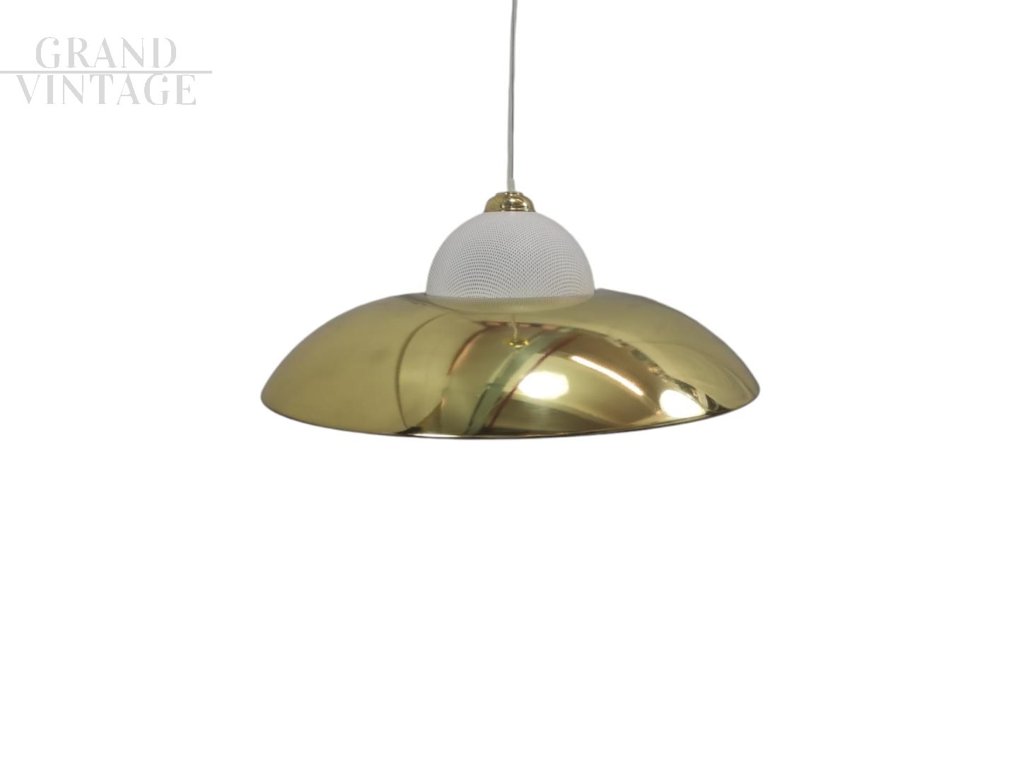 Lampada a sospensione vintage in ottone dorato degli anni '70, in condizioni ottime, presenta un leggero segno sulla coppa segnalato in foto.