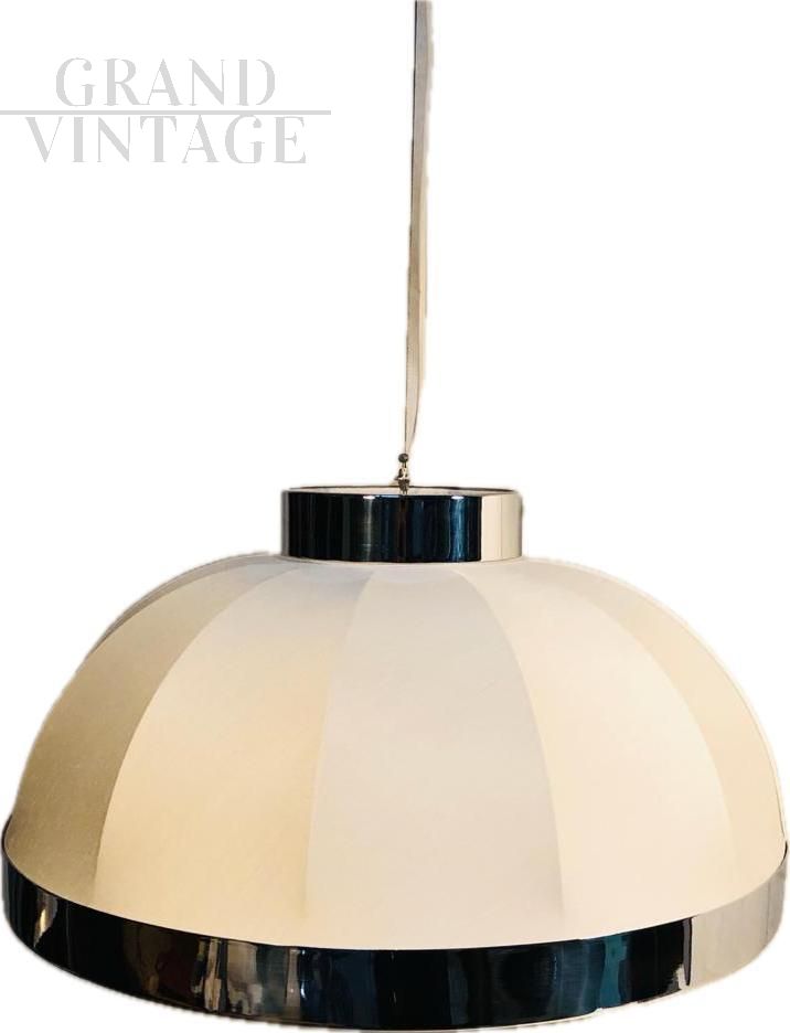 Curiosa lampada a sospensione di manifattura italiana degli anni '70 con paralume in tessuto di seta Shantung, struttura con cerchi decorativi in metallo cromato e parte inferiore in vetro satinato che scherma le quattro luci. In ottime condizioni in quanto recentemente restaurata.