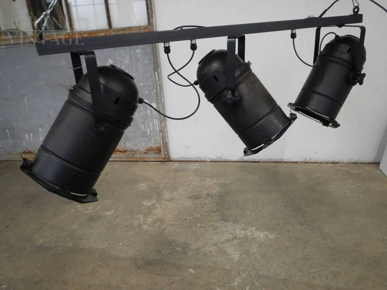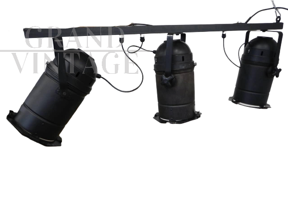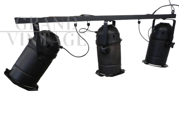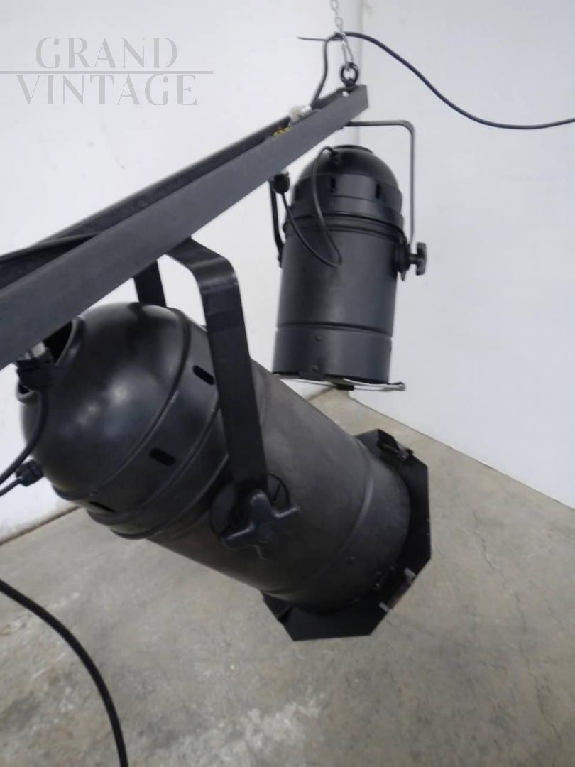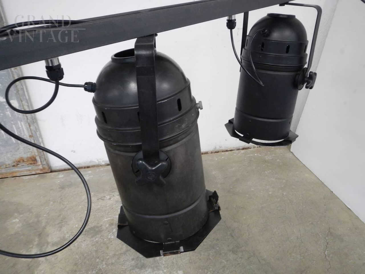 Composizione di lampadario con trave in ferro a c, con 3 fari da teatro anni '70, funzionante e con 2 golfare per appendere a soffitto, nel prezzo è compresa la cassa per il trasporto.