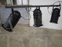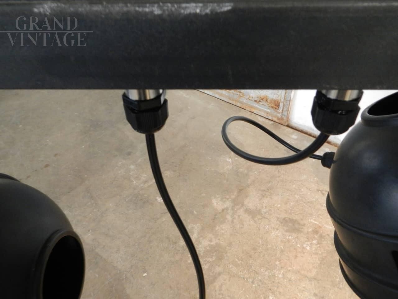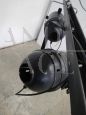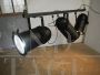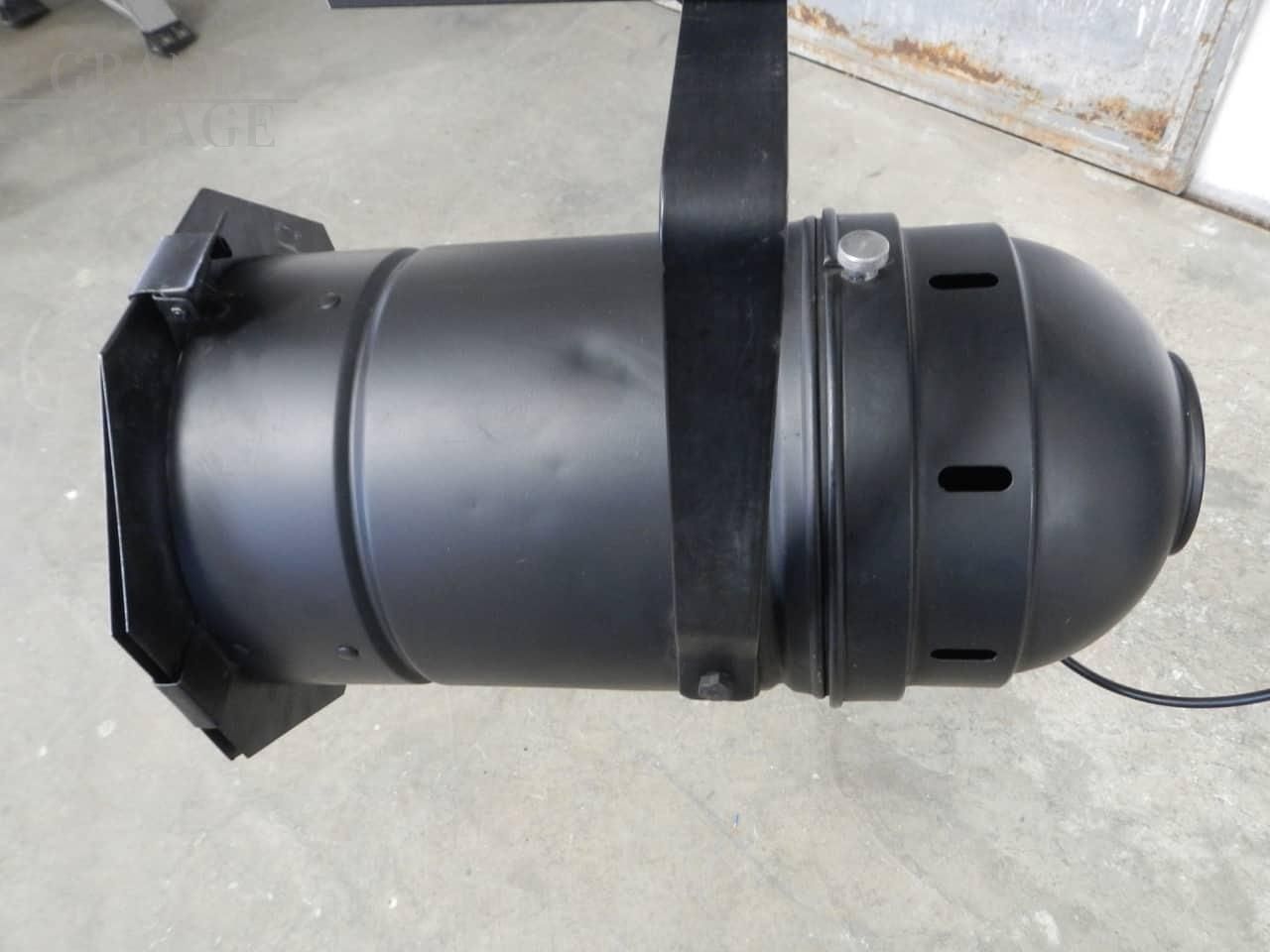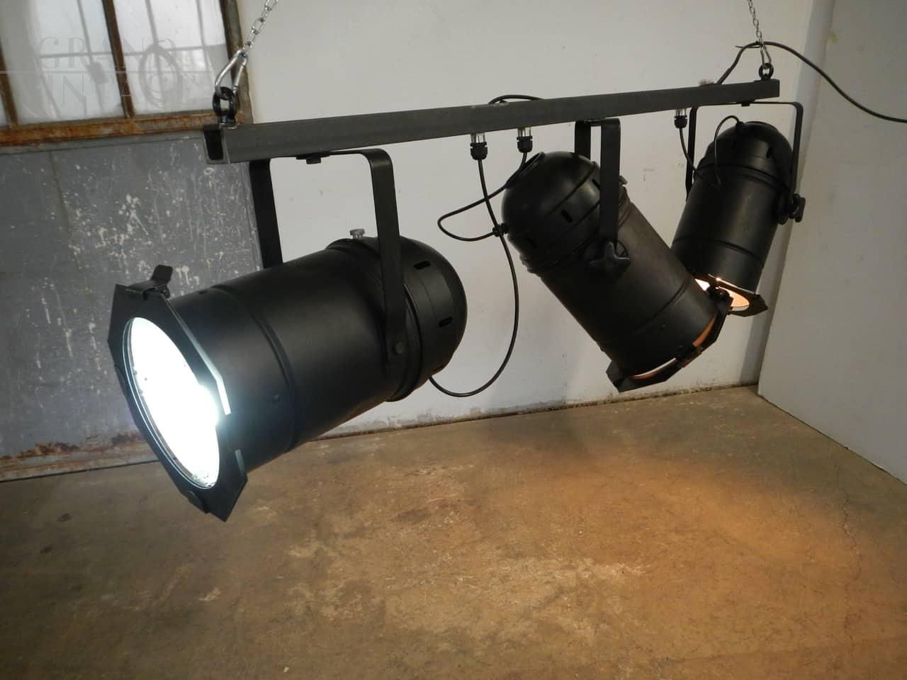 Composizione di lampadario con trave in ferro a c, con 3 fari da teatro anni '70, funzionante e con 2 golfare per appendere a soffitto, nel prezzo è compresa la cassa per il trasporto.