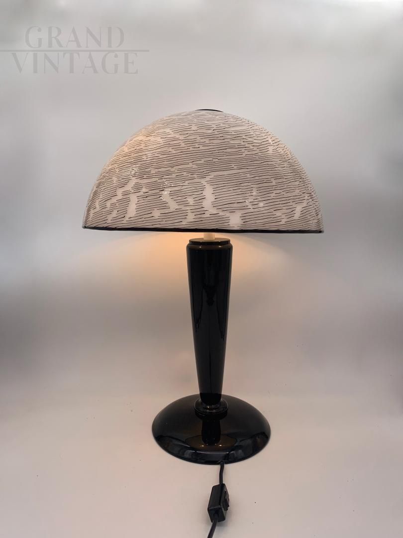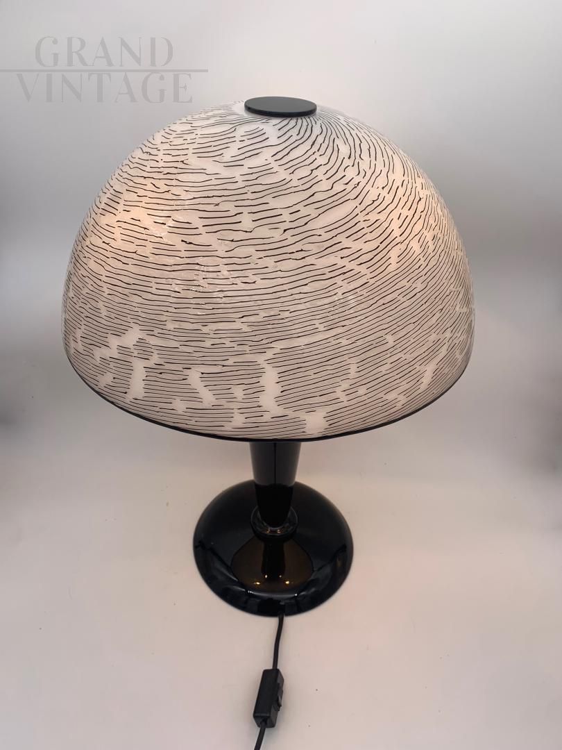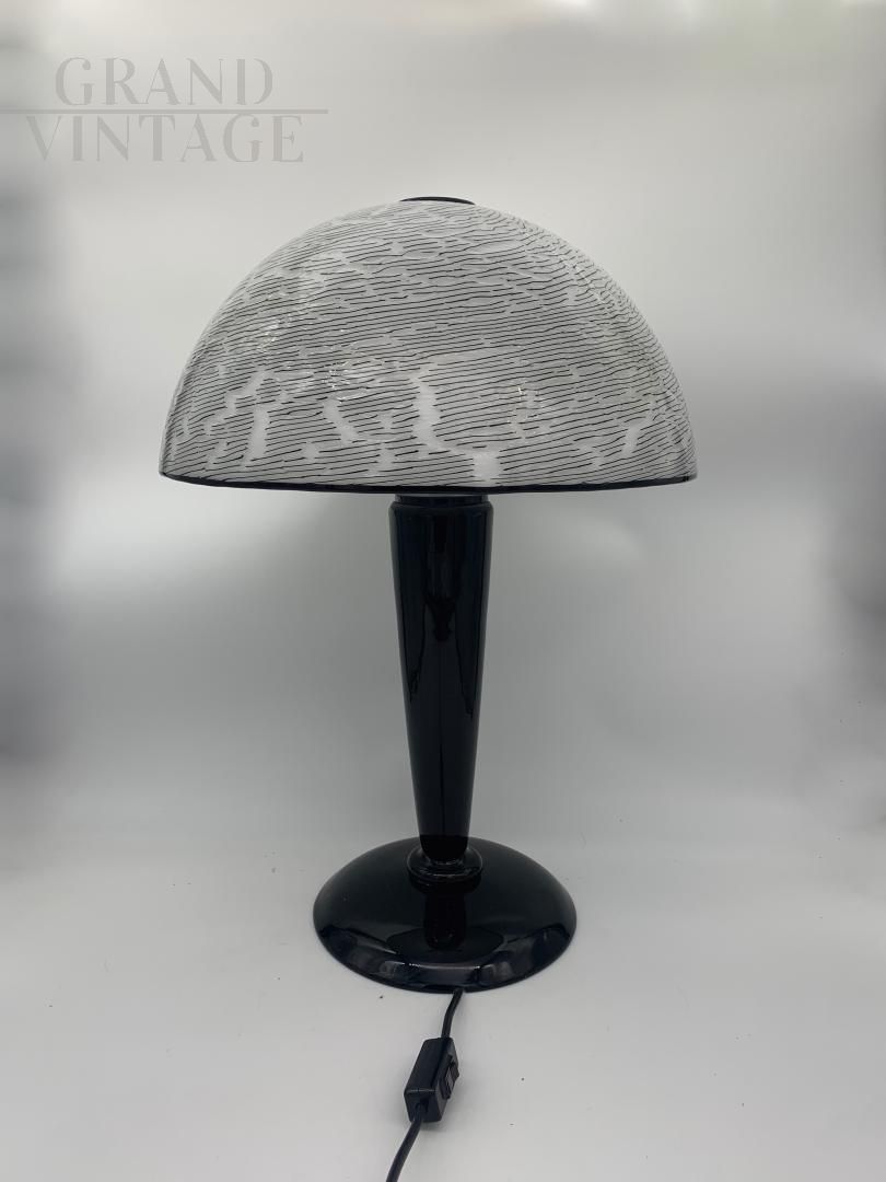 Fantastica lampada da tavolo Effetre totalmente in Vetro di Murano, anni '70, pezzo unico e molto raro. Marchiata Effetre international, completa e originale, base e asta in vetro lavorato a mano bianco e nero, cappello smontabile in vetro di Murano. All'interno del vetro c'è un anima in ferro. Impianto elettrico originale e funzionante, 3 lampadine con attacco E14. Illuminazione di design, donerà charm e calore all'ambiente dove verrà posizionata.