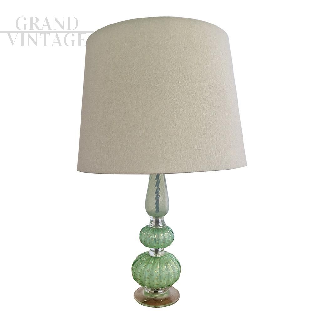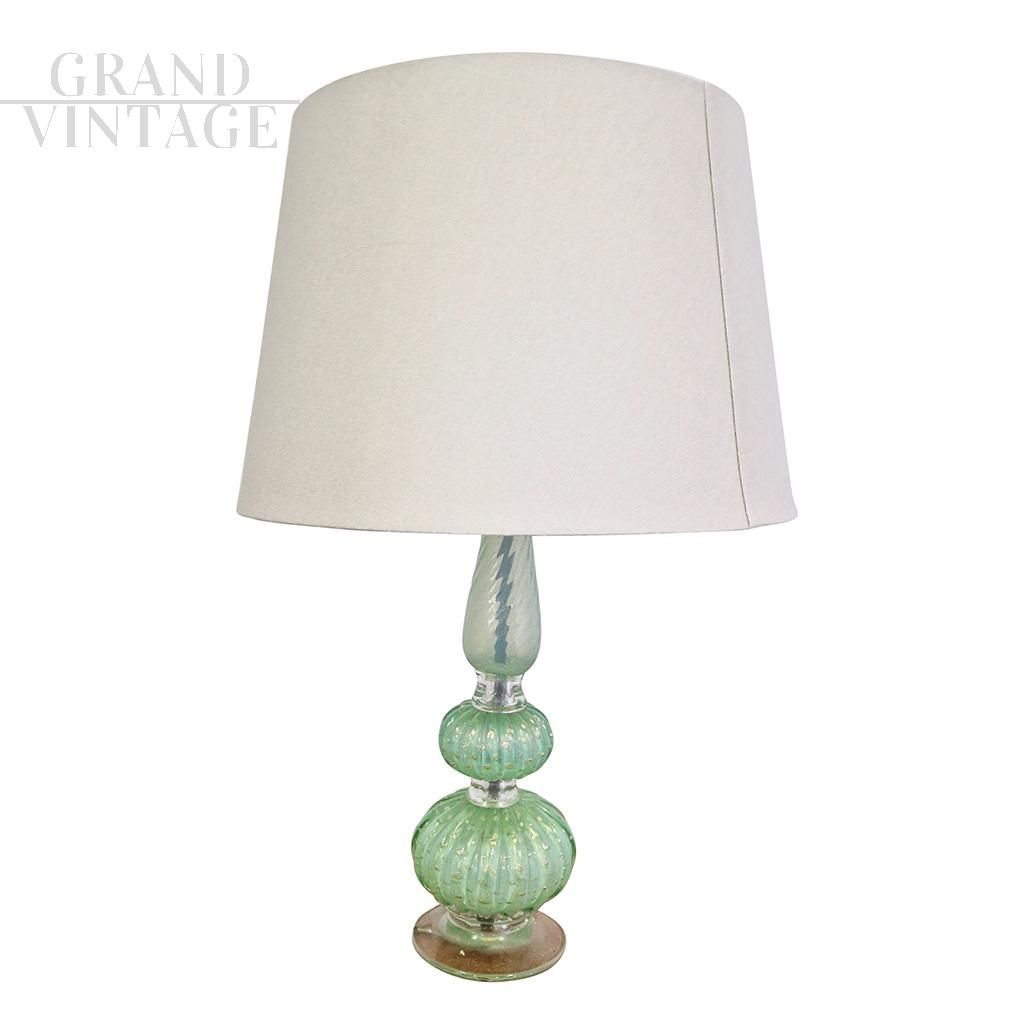 Lampada da tavolo abat-jour in vetro di Murano artistico verde chiaro con dettagli color ambra, con paralume in tessuto bianco, funzionante con lampadina di tipo E27.