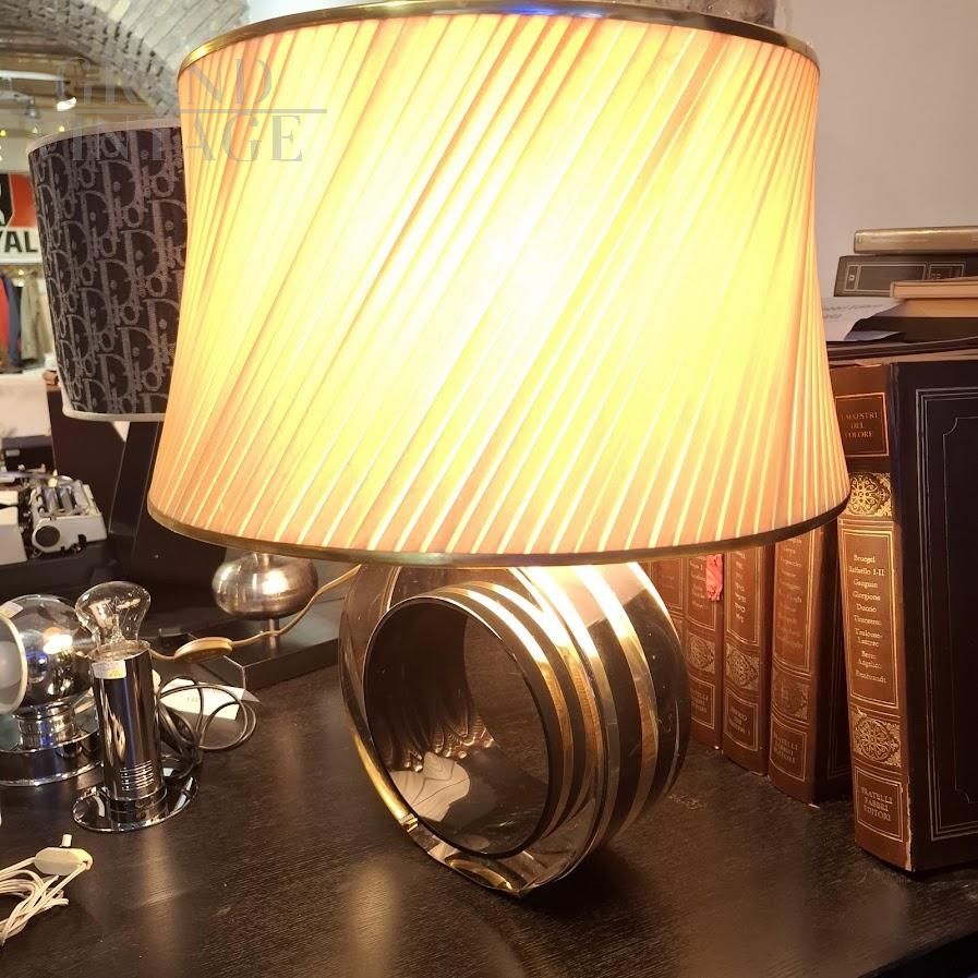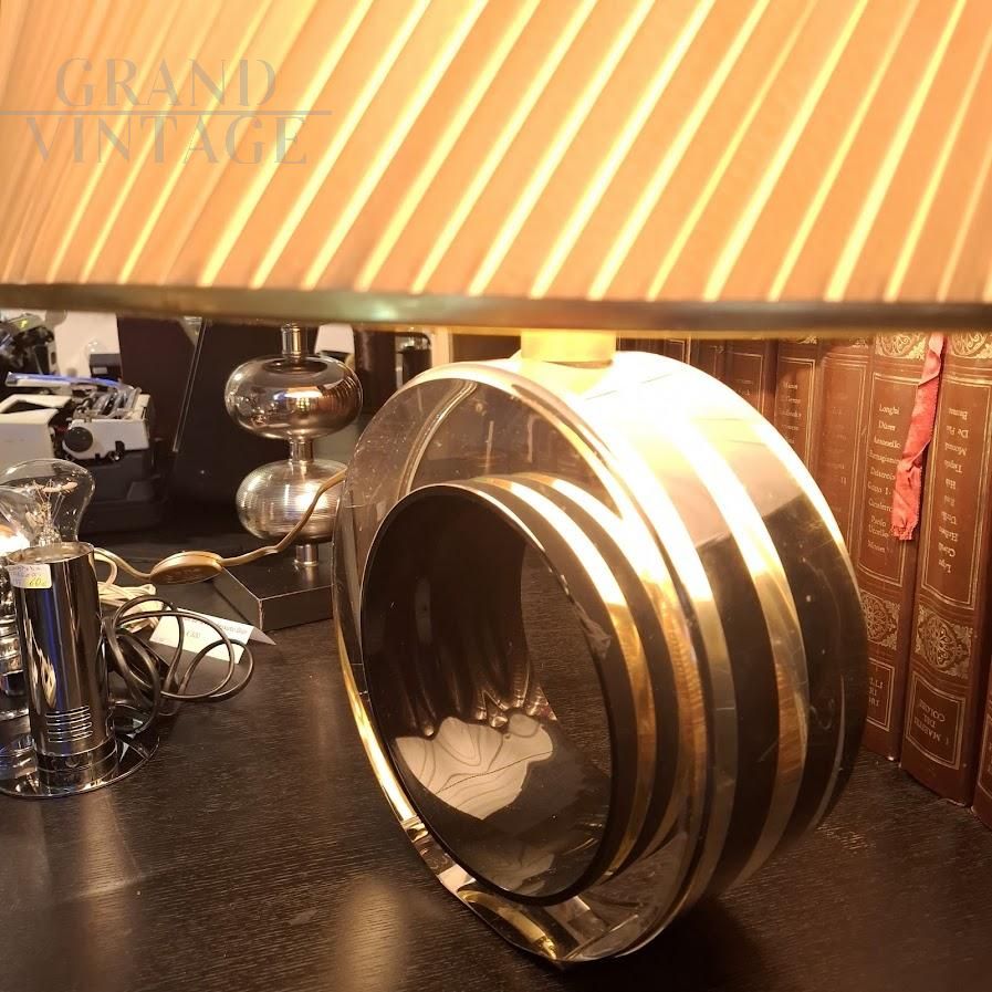 Lampada da tavolo abat-jour realizzata da Smart Italia negli anni '70 con base in plexiglass trasparente decorato da strisce di ottone all'interno, il paralume è in stoffa. In ottime condizioni.