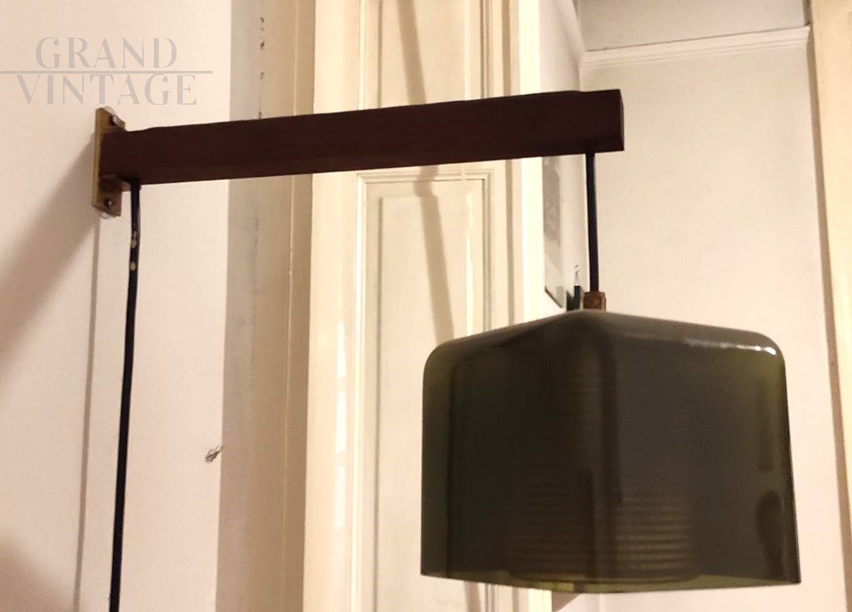 Lampada applique a sospensione scandinava, design di Carl Fagerlund per vetreria Orrefors, in vetro artistico verde scuro, Svezia anni '60. La lampada è caratterizzata da un vetro verde scuro di forma quadrata, e ha un'anima in vetro zigrinato trasparente, che dona un effetto di luce davvero particolare. La lampada può essere applicata al muro tramite una staffa in teak, oppure utilizzata senza staffa applicata direttamente sul soffitto.