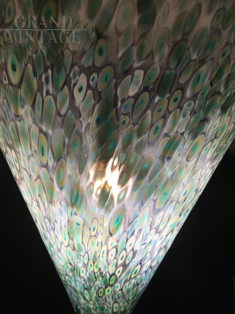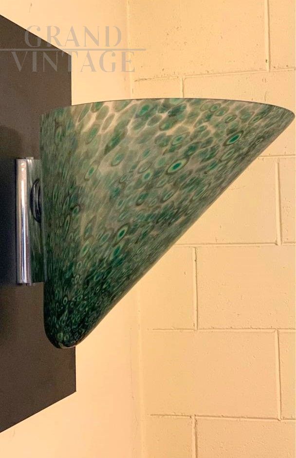 Rarissima lampada da parete applique singola Neverino di Gae Aulenti per Vistosi in vetro di Murano con murrine verdi su struttura in metallo cromato. In ottime condizioni, i vetri non hanno difetti, impianto elettrico rifatto a nuovo con attacco per lampadina di tipo E27.