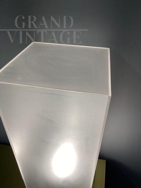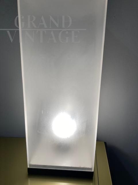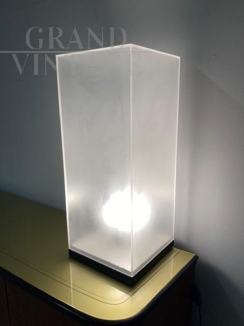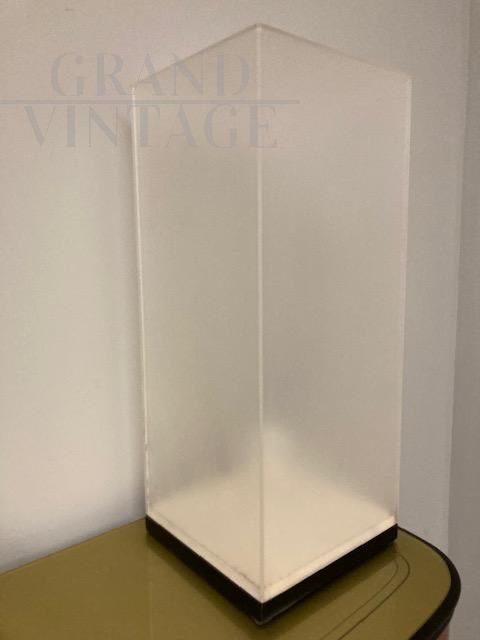 Lampada a cubo design minimale con struttura in plexiglass e base in legno. Effetto molto bello, modernariato degli anni '70, utilizzabile sia da terra che sopra ad un mobile. Funzionate, in ottimo stato.