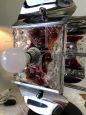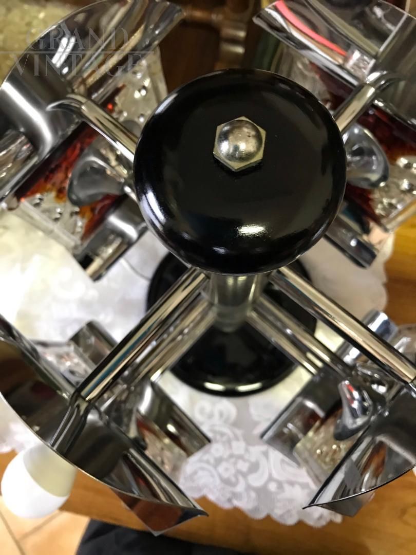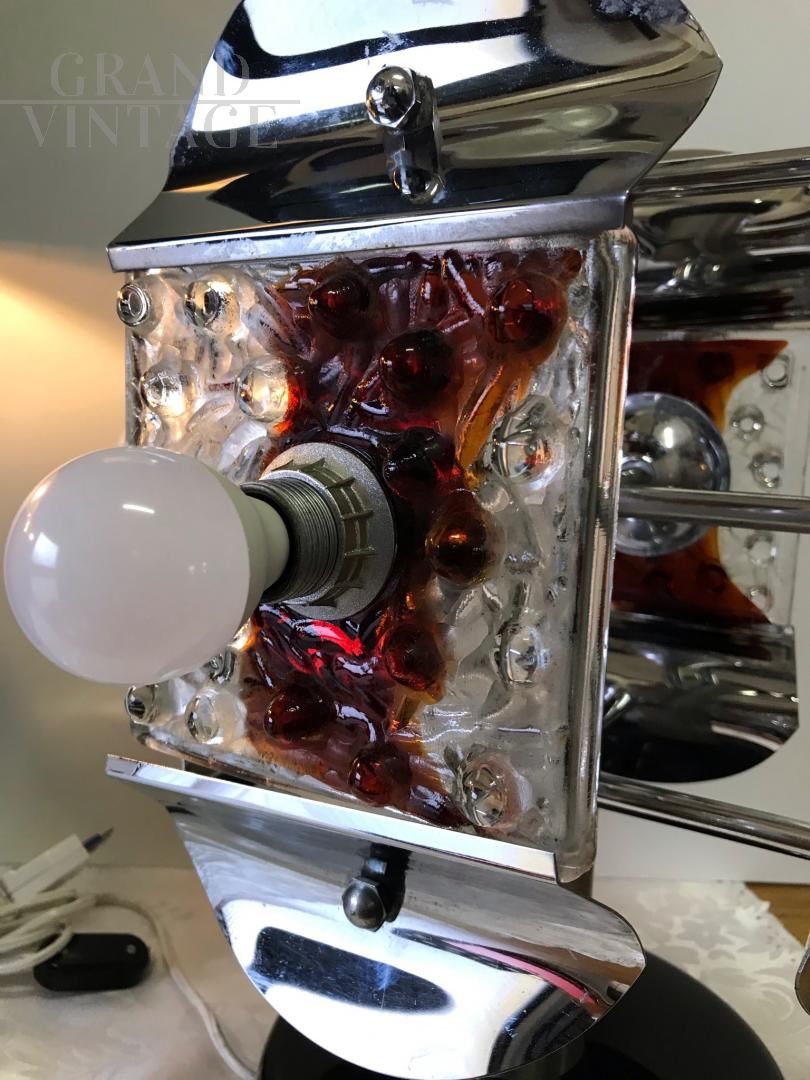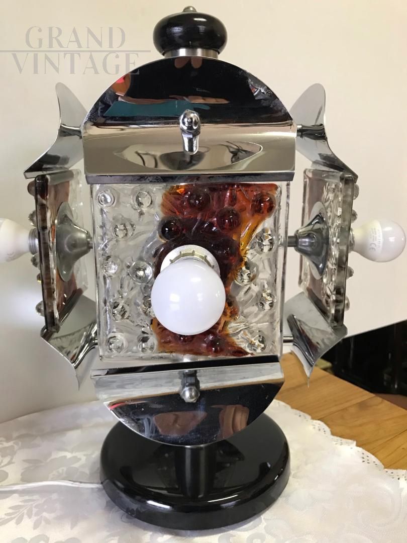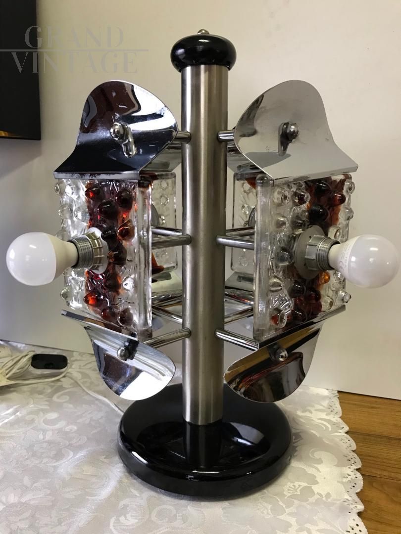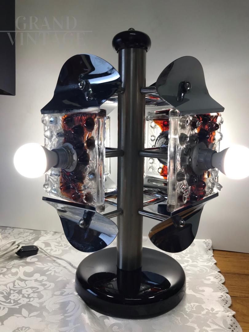 Lampada da appoggio anni '70 in acciaio e vetro. Oggetto molto originale, ha 4 punti luce, vetri Mazzega / Murano, perfettamente funzionante. Misura cm 48 in altezza, lati 35x35 cm.