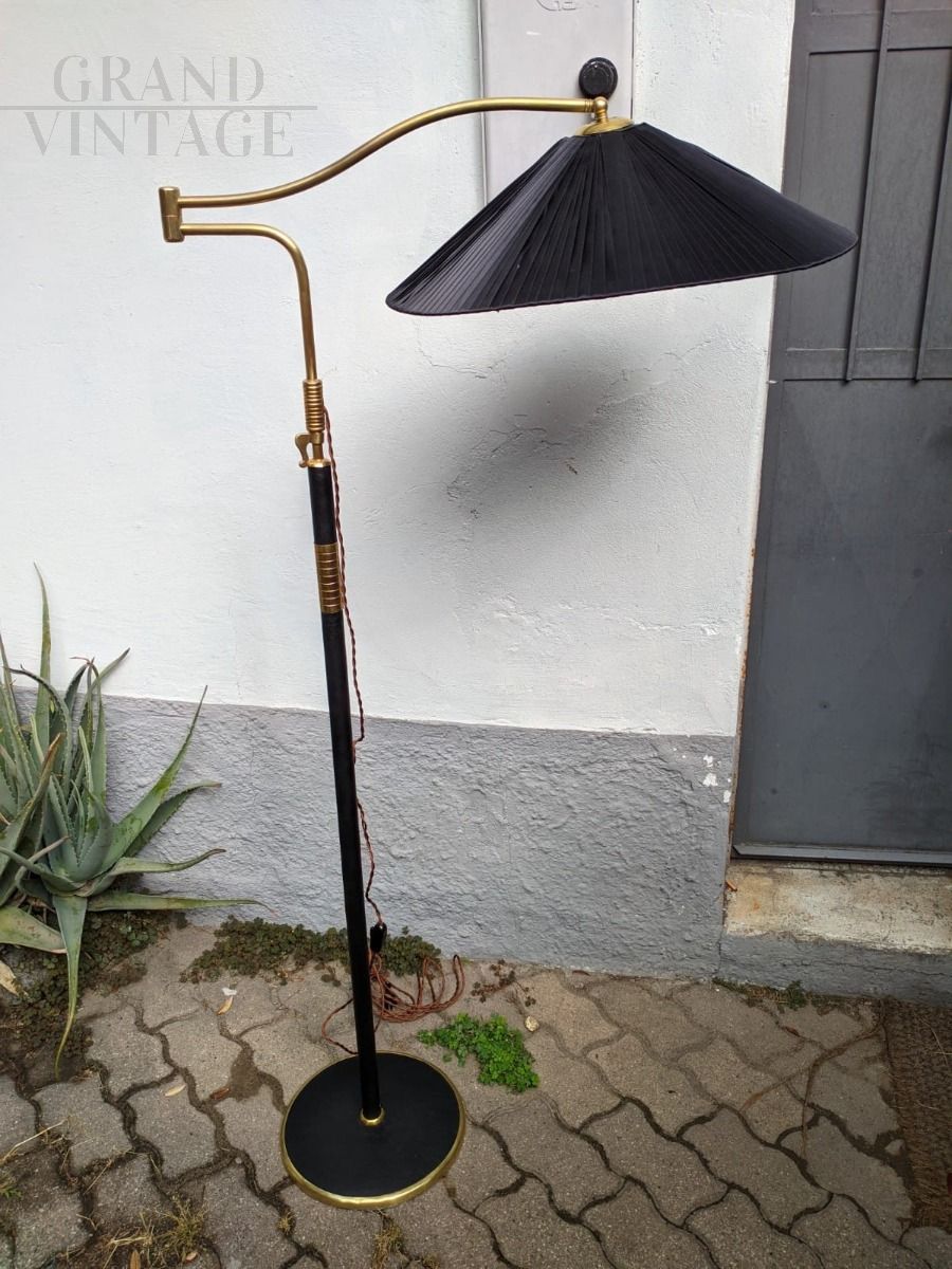 Elegante lampada da lettura a piantana vintage anni '40 / '50, con struttura in ottone e base ricoperta in pelle di capretto nera.