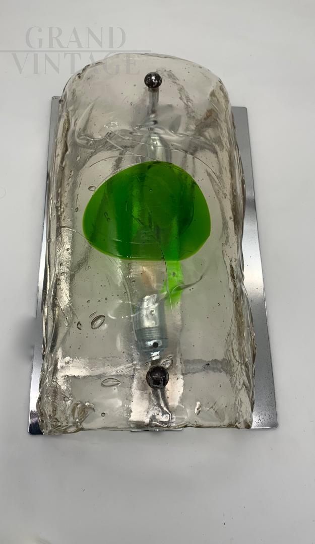 Lampada da parete con base rettangolare metallica satinata su cui è montato un vetro spesso e trasparente dalla superficie irregolare, caratterizzato da bolle d'aria interne e un andamento volutamente grezzo; al centro del vetro è inglobato un elemento circolare di colore verde brillante che cattura l’attenzione, mentre due lampadine dietro il vetro diffondono una luce calda che evidenzia le imperfezioni artigianali e il contrasto cromatico tra il verde acceso e il tono neutro del vetro Originali made in italy. Attribuito a Mazzega A.V. impianto elettrico nuovo con 2 portalampada e14.