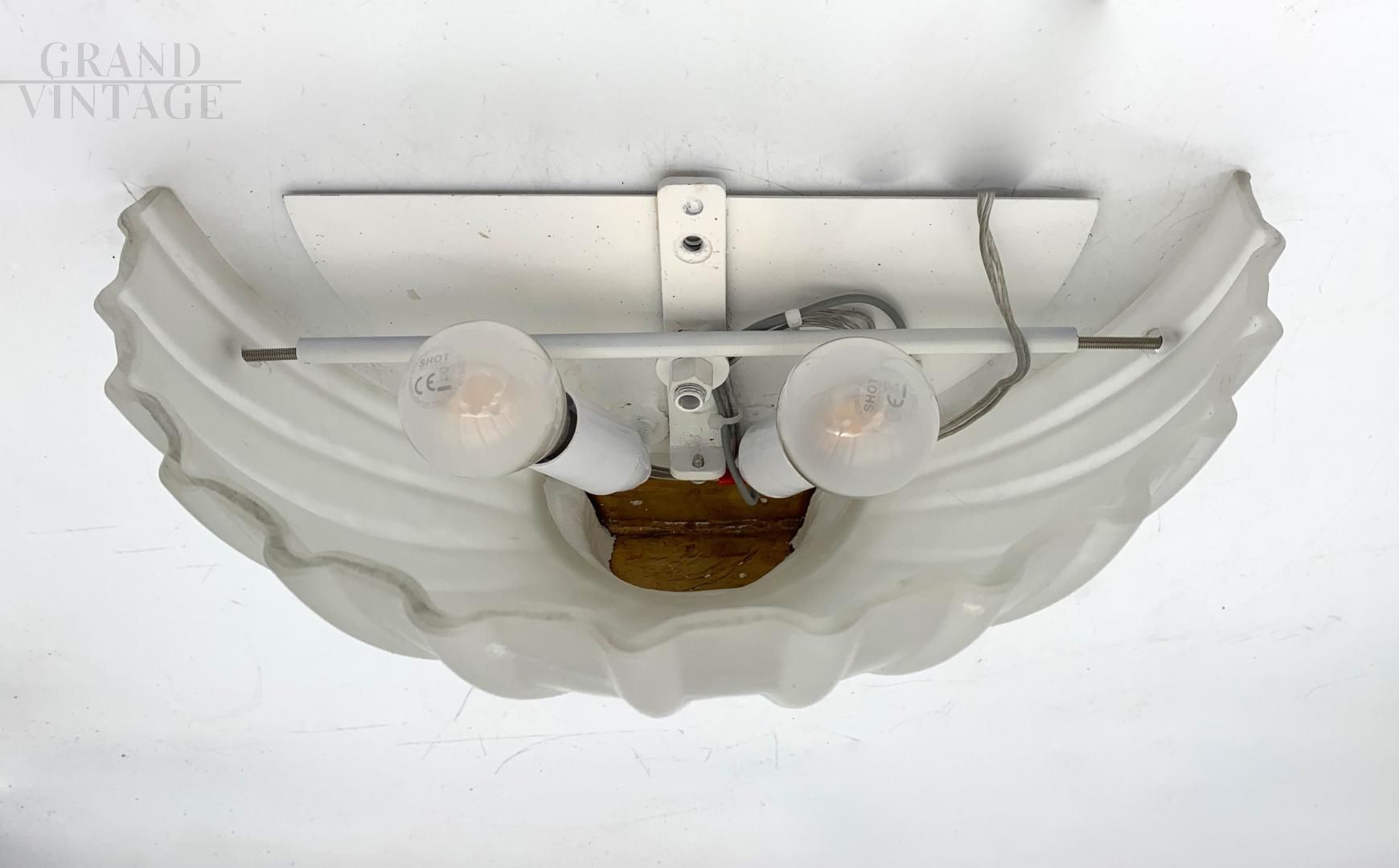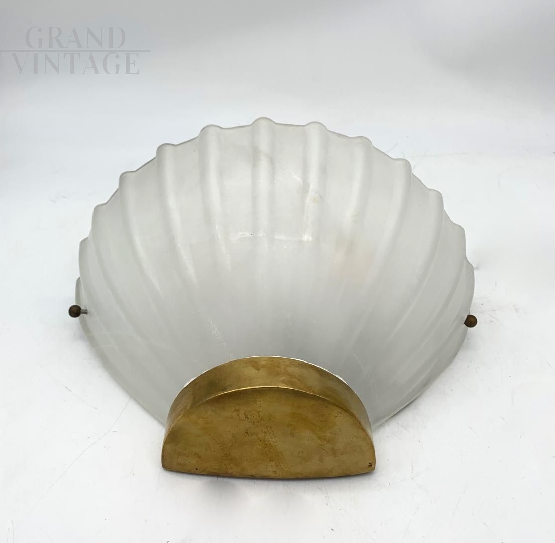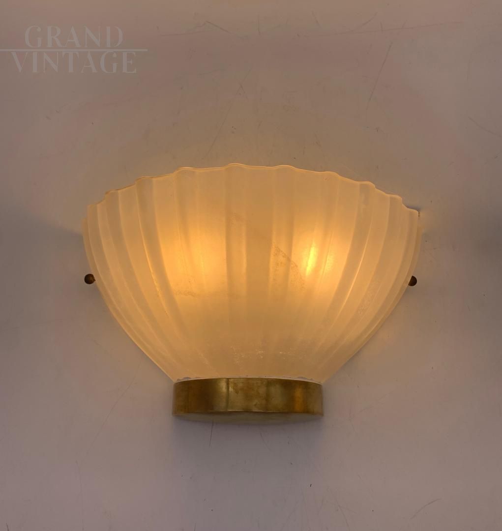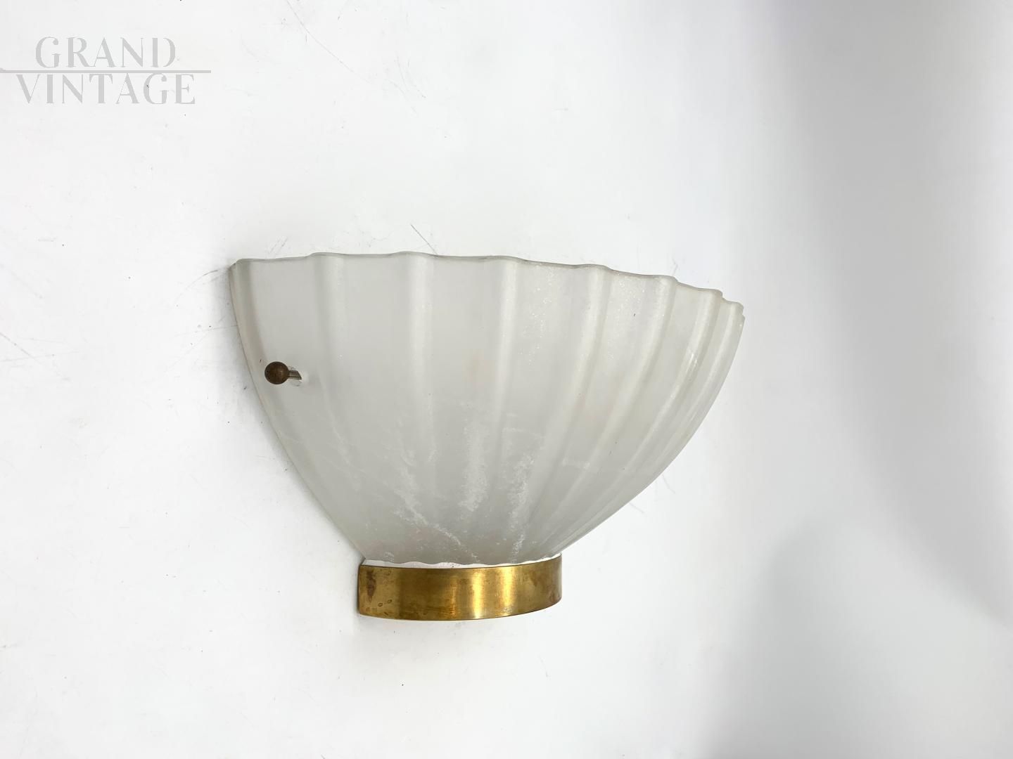 Lampada da parete applique singola design di Patrini per la ditta Seguso, realizzato in vetro di Murano bianco sabbiato lavorato a mano su stampo, la struttura è in ferro e ottone. L'applique ha 2 attacchi per lampadine di tipo e14, è in buone condizioni, il vetro è intatto e non è crepato. Pochi segni del tempo sulla struttura. Impianto elettrico e portalampada nuovi. Su richiesta si possono preparare per l'impianto elettrico Americano.