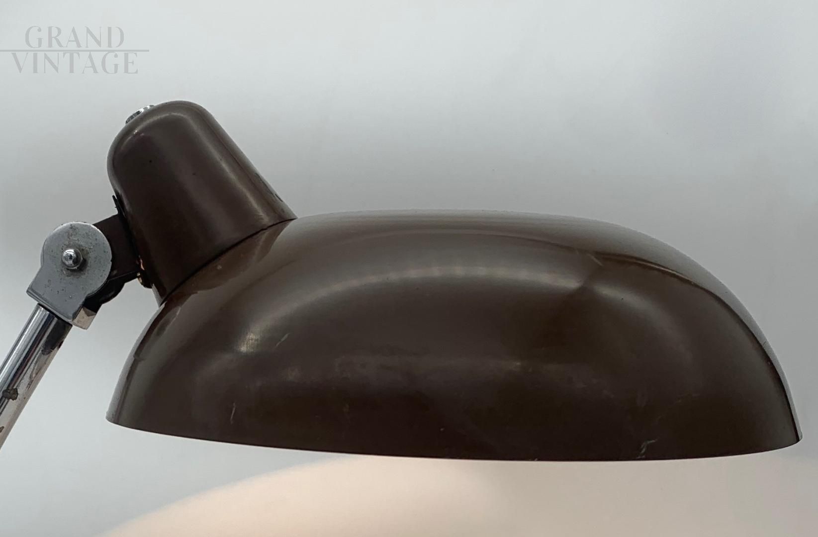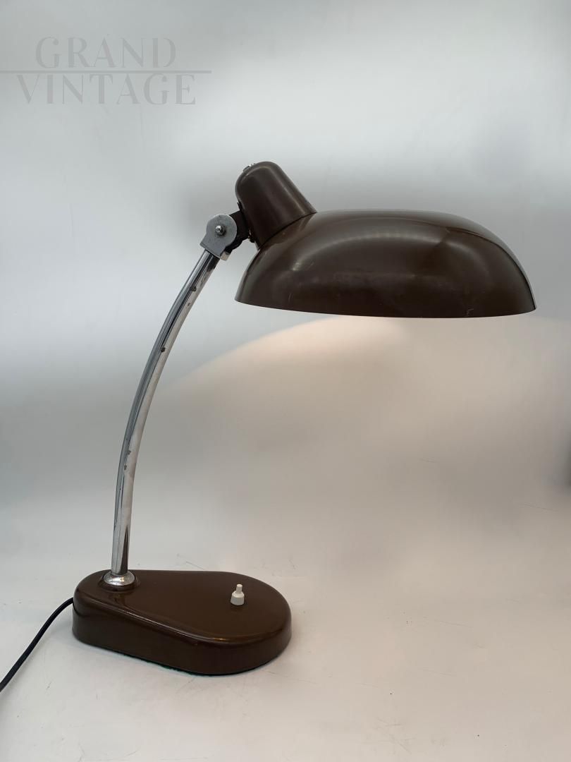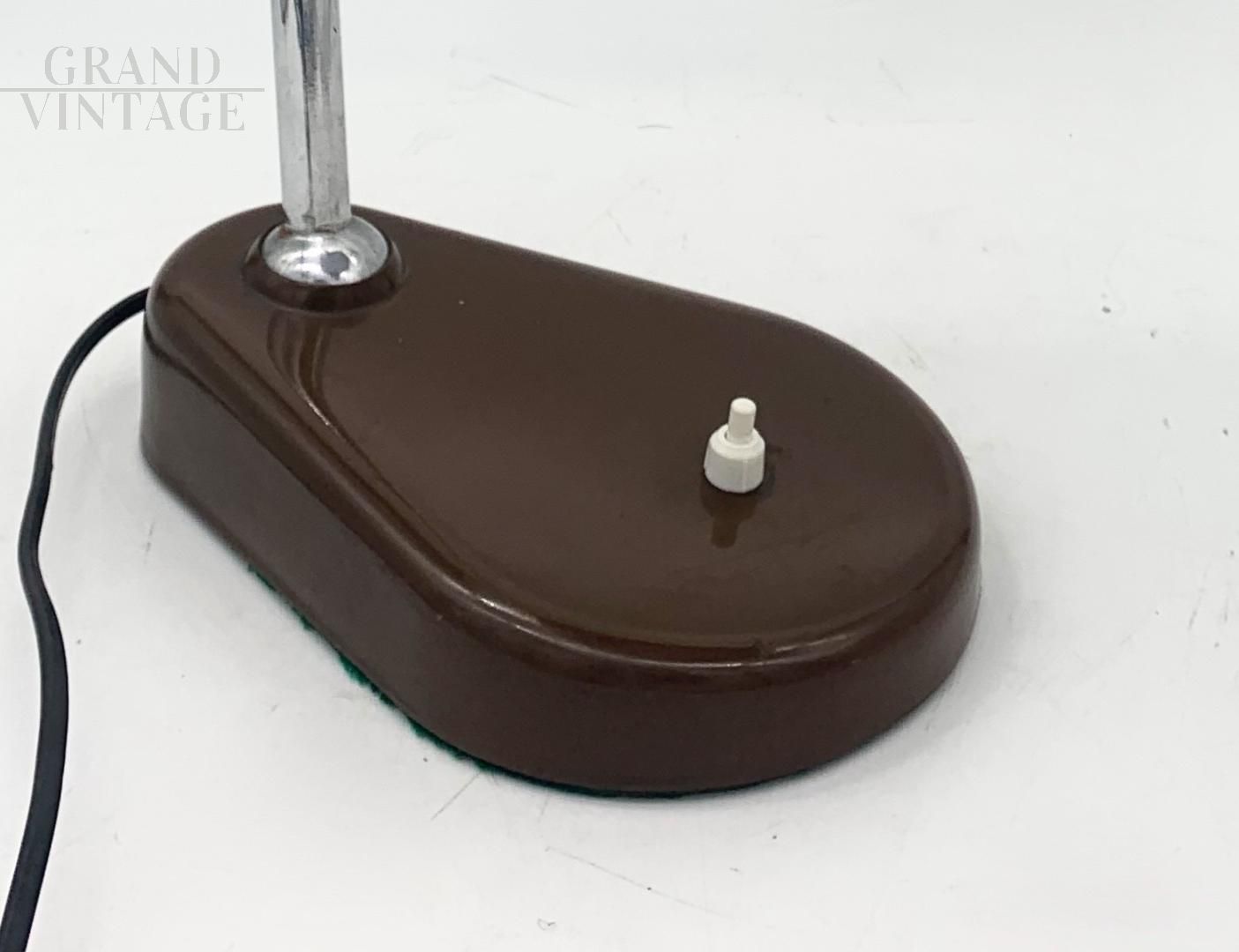 Fantastica e rara lampada da scrivania vintage anni '60 dal design anonimo in metallo laccato marrone moka e con dettagli in ottone, paralume direzionabile e interruttore alla base. La lampada è in buone condizioni, presenta i naturali segni del tempo, in particolar modo nel colore, che il suo colore originale. Funzionante e con impianto elettrico rifatto a nuovo con un attacco per lampadina di tipo E27 in metallo. Cavo nero a 3 fili con messa a terra. Da accesa ha un effetto meraviglioso.