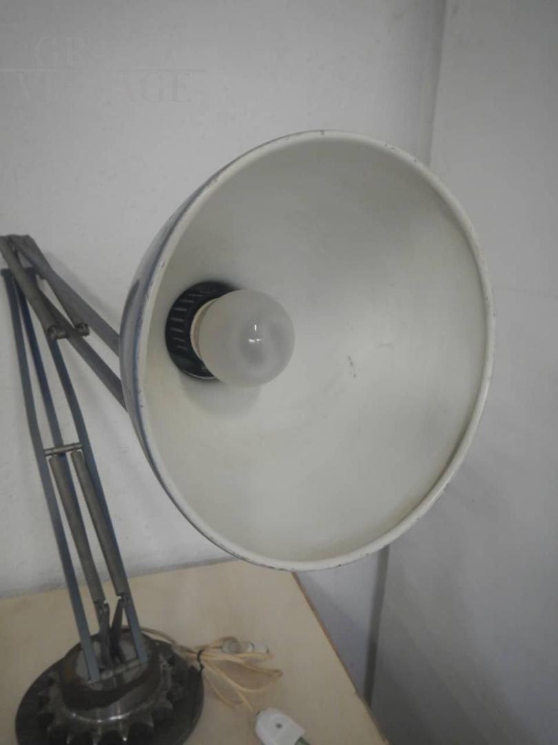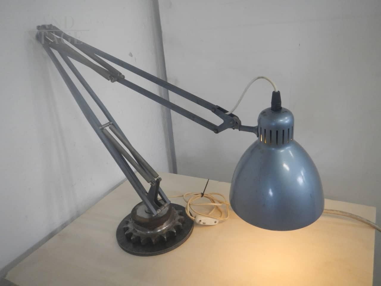 Lampada da tavolo o da scrivania vintage in stile industriale in metallo laccato azzurro metallizzato e bianco, alla base è stato applicato un supporto metallico a ingranaggio. Funzionante con interruttore per accensione e spegnimento, regolabile in varie altezze. Diametro campana 16 cm. In buone condizioni.