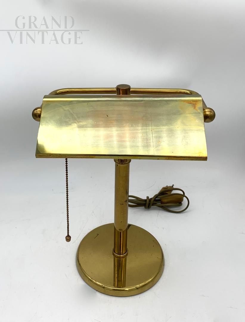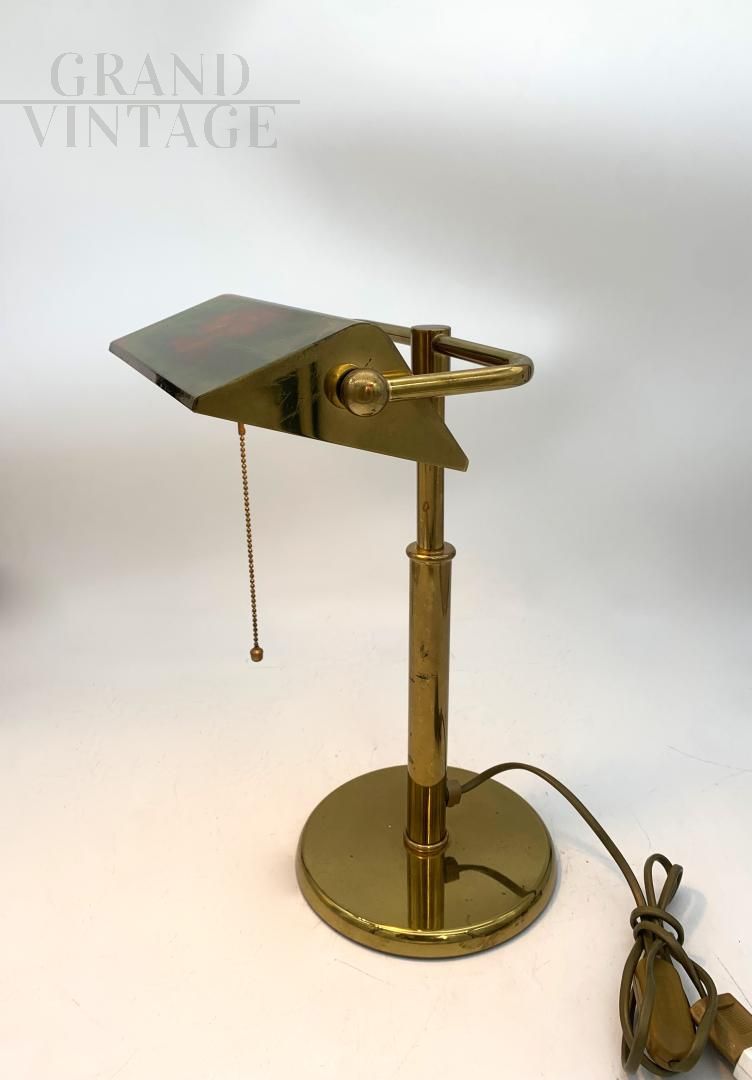 Lampada da tavolo ministeriale vintage con struttura in ottone, i con pochi segni di usura e leggera ossidazione che suggeriscono una certa età e autenticità, probabilmente databile agli anni 70 circa. Il paralume rettangolare inclinato è montato su un perno laterale che consente di orientare la luce con precisione, rendendola ideale per scrivanie o lettura. La catena per l'accensione è tipica del design vintage e funziona come interruttore a strappo. Il design complessivo è sobrio ma funzionale, con un'estetica che richiama le lampade da lavoro o da ufficio degli anni '40-'60. Impianto elettrico originale e riguardato, funzionante con portalampada e 14 in metallo; la lampada è totalmente in ottone a parte la base che è in ferro dorato.