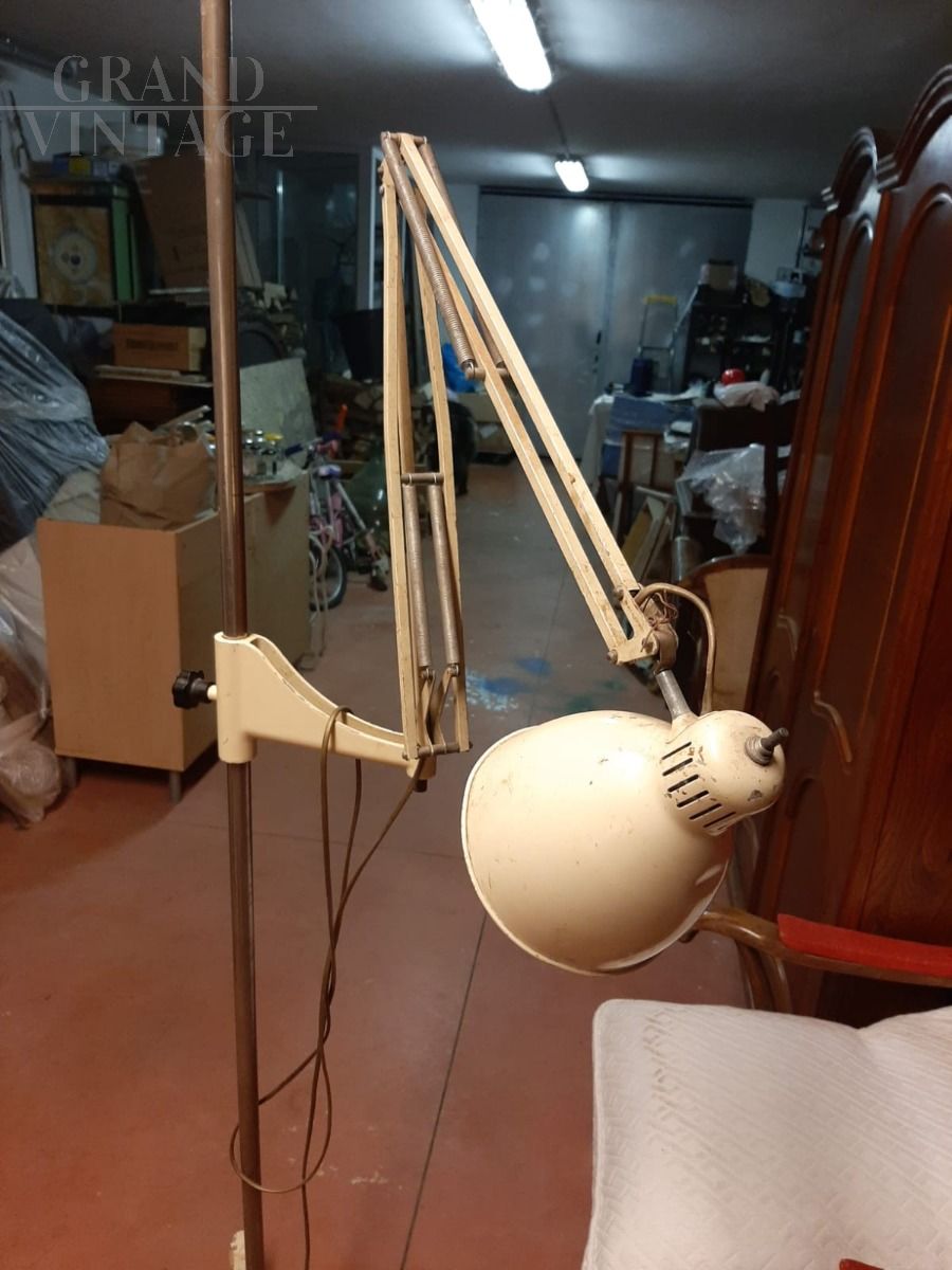 Lampada da studio medico Ginevri a piantana, anni '70, orientabile in ogni direzione, regolabile in altezza e dotata di rotelle. Originariamente progettata per uno studio medico, è perfetta anche come lampada da lavoro e da studio per ogni contesto in cui serva un orientamento preciso del fascio di luce. Il palo centrale in tubolare di ferro, il paralume è in metallo laccato color crema.