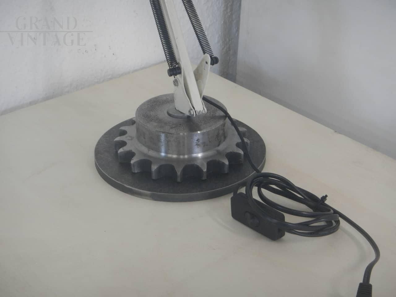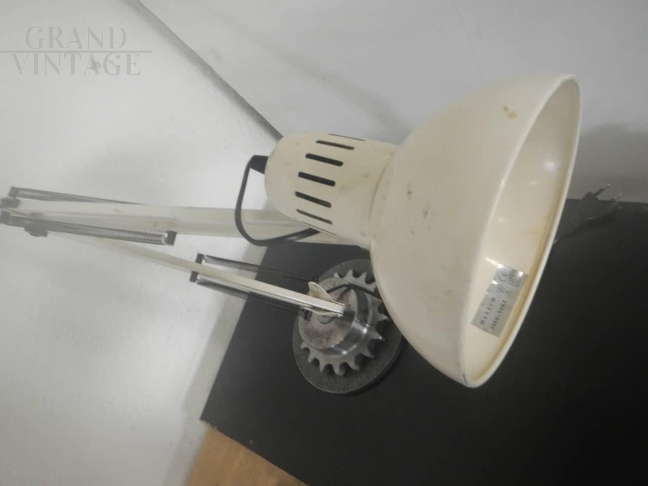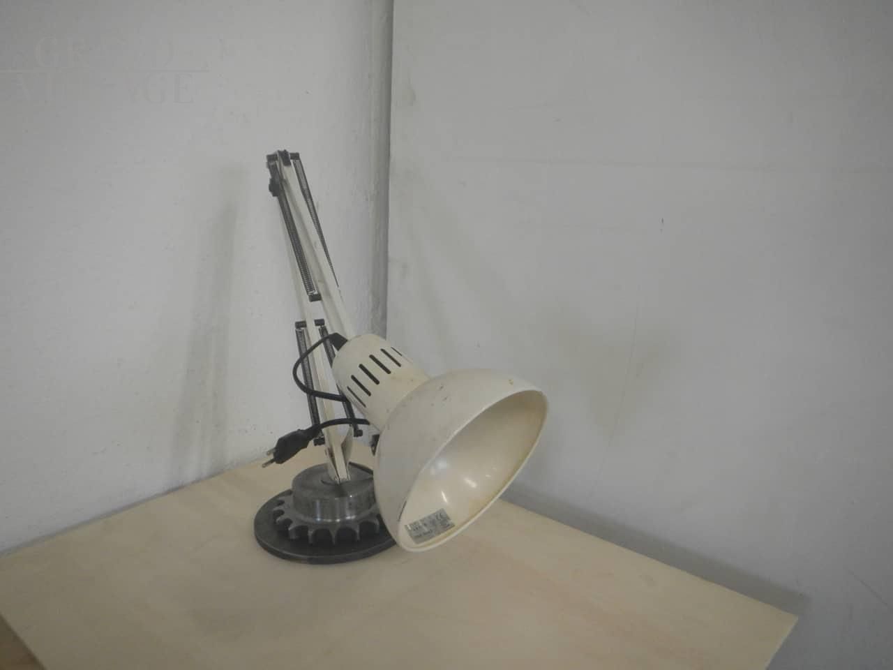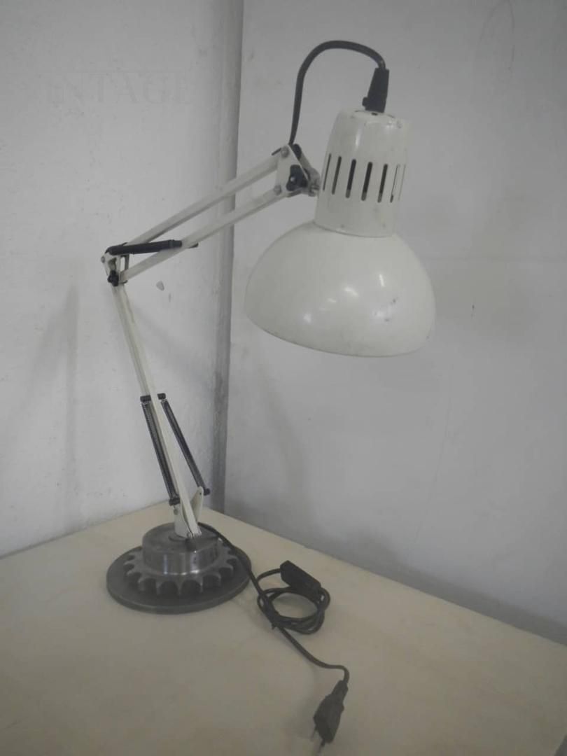 Lampada da tavolo o da scrivania vintage in stile industriale in metallo laccato bianco panna - beige, alla base è stato applicato un supporto metallico a ingranaggio. Funzionante con interruttore, regolabile in varie altezze. Diametro campana 16 cm. In buone condizioni.