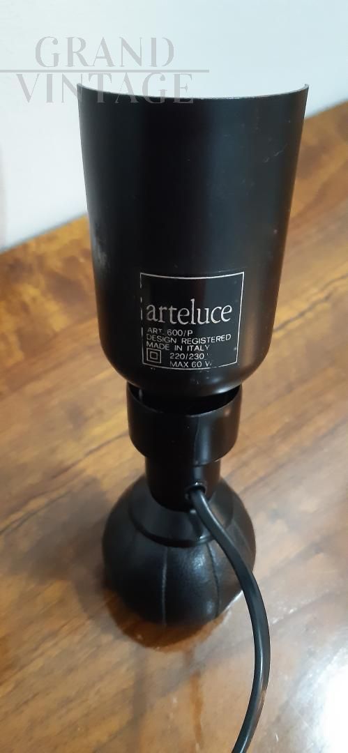Iconica lampada da tavolo disegnata da Gino Sarfatti nel 1966 per Arteluce, questo pezzo rappresenta un esempio di design senza tempo. Il modello specifico in vendita è stato acquistato nel 1985, ed è quindi un articolo originale con oltre 40 anni di storia. Cavo, interruttore e spina sono originali. Inclusa: lampadina LED da 5,5 W (luce color ghiaccio), 6.500 K. Realizzata in alluminio laccato nero, la lampada è dotata di una base in pelle nera zavorrata con pallini di piombo per garantire la massima stabilità. La struttura è completamente orientabile, offrendo una versatilità straordinaria: perfetta sia in ambienti moderni che in spazi dallo stile vintage. Pur non presentando difetti strutturali, la lampada mostra segni del tempo, che testimoniano il suo passato.