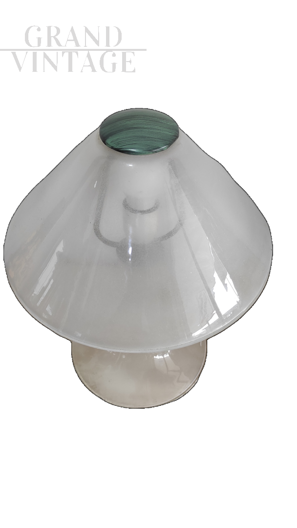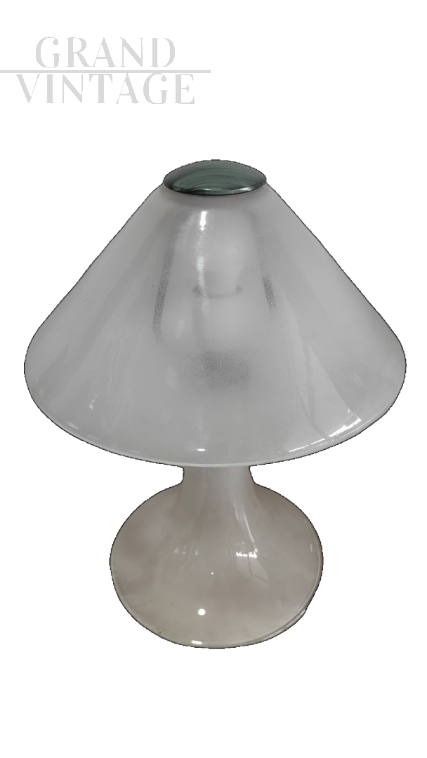 Lampada da tavolo vintage a fungo in vetro bianco, in buone condizioni, funzionante con presa europea. Un oggetto di design realizzato da due elementi. La particolare forma del paralume crea una bellissima luce diffusa, e la sua forma accattivante da quel tocco in più che arreda ogni angolo, ogni ambiente moderno o classico.