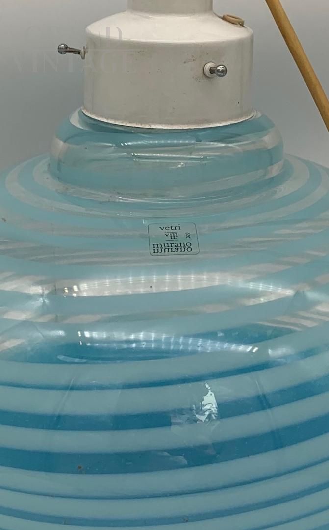 Lampada da tavolo abat-jour vintage attribuibile a F3 in vetro artistico di Murano soffiato nei toni dell'azzurro. La lampada è in buono stato, i vetri sono intatti e non crepati, ed è funzionante con due punti luce: presenta un attacco per lampadina di tipo E27 nella base e un attacco per lampadine di tipo E14 all'interno. L'impianto elettrico è originale e revisionato, ed è adatto alle lampadine al Led. La lampada è totalmente in vetro di Murano con l'attacco in metallo, e si può mettere un cappello in stoffa con attacco grande, personalizzabile secondo i propri interni.