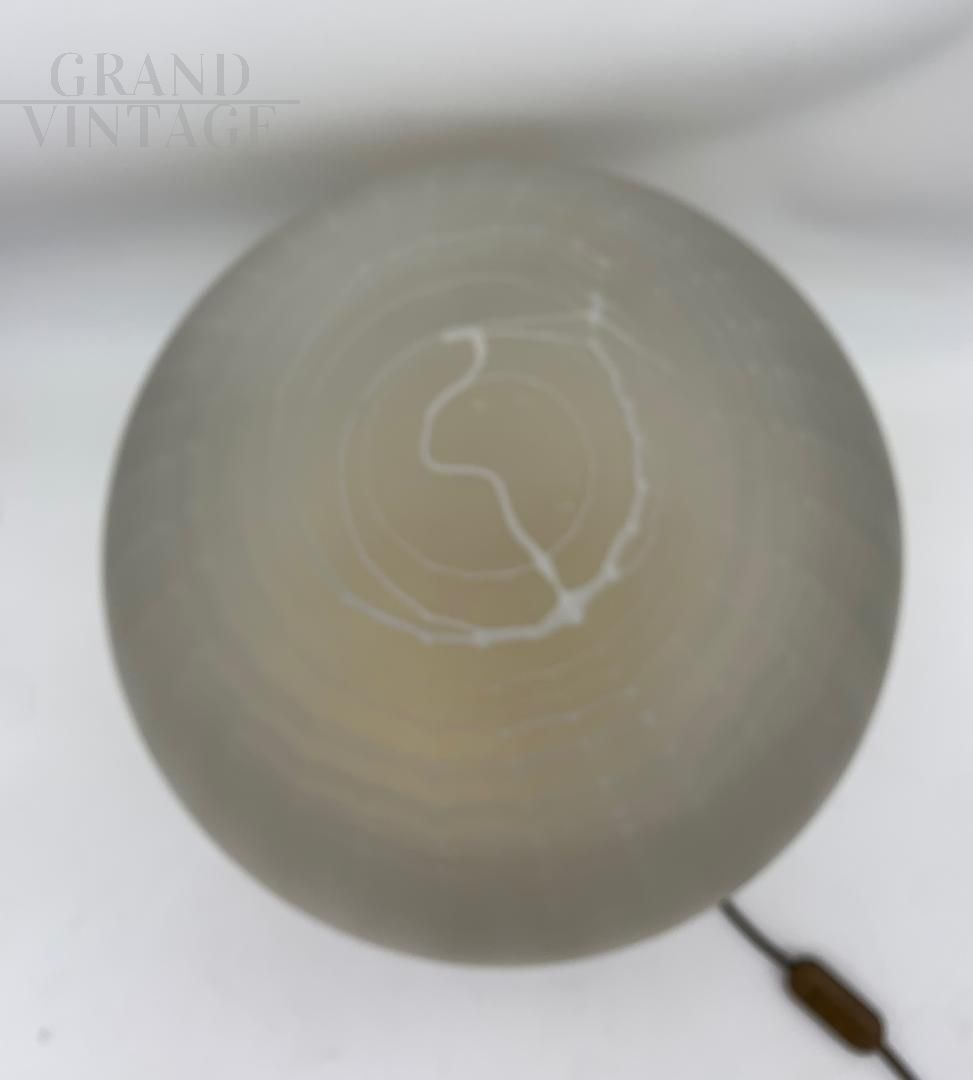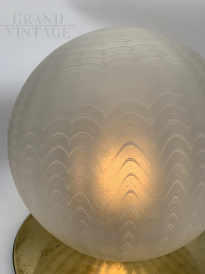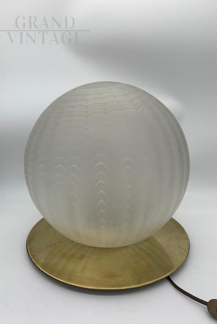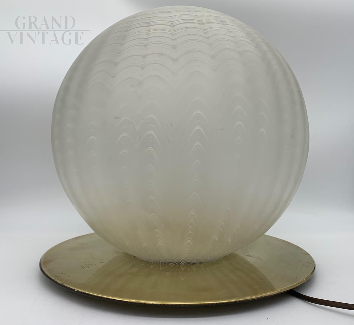 Splendida lampada da tavolo attribuita a Venini in vetro di Murano satinato, molato e decorato a mano su base in ottone, Italia - Murano anni '70. La lampada è in buono stato, con impianto elettrico rifatto. Vetro in buone condizioni, non scheggiato nè crepato. La lampada ha una accensione con portalampada E27. Ha qualche segno del tempo. Perfetta per illuminare camere da letto o zone di passaggio. La lampada verrà smontata e ben imballata per garantire un trasporto sicuro.